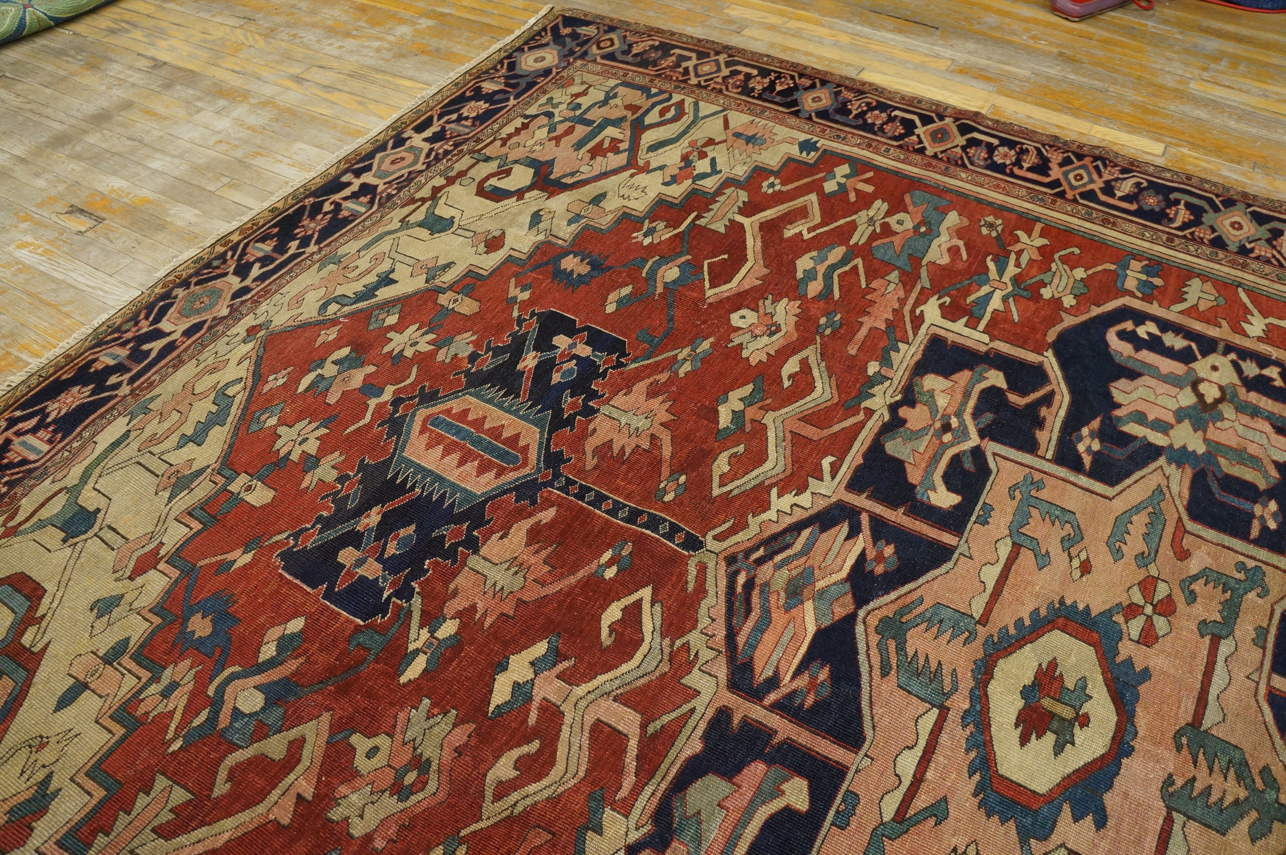 The impressive dimensions of this piece confirm its status as one of the highly sought-after room size rugs, capable of defining a major living space or formal dining area. Its excellent condition, considering its age and traditional nomadic origins, ensures that this Serapi remains an enduring investment in textile history and enduring beauty.