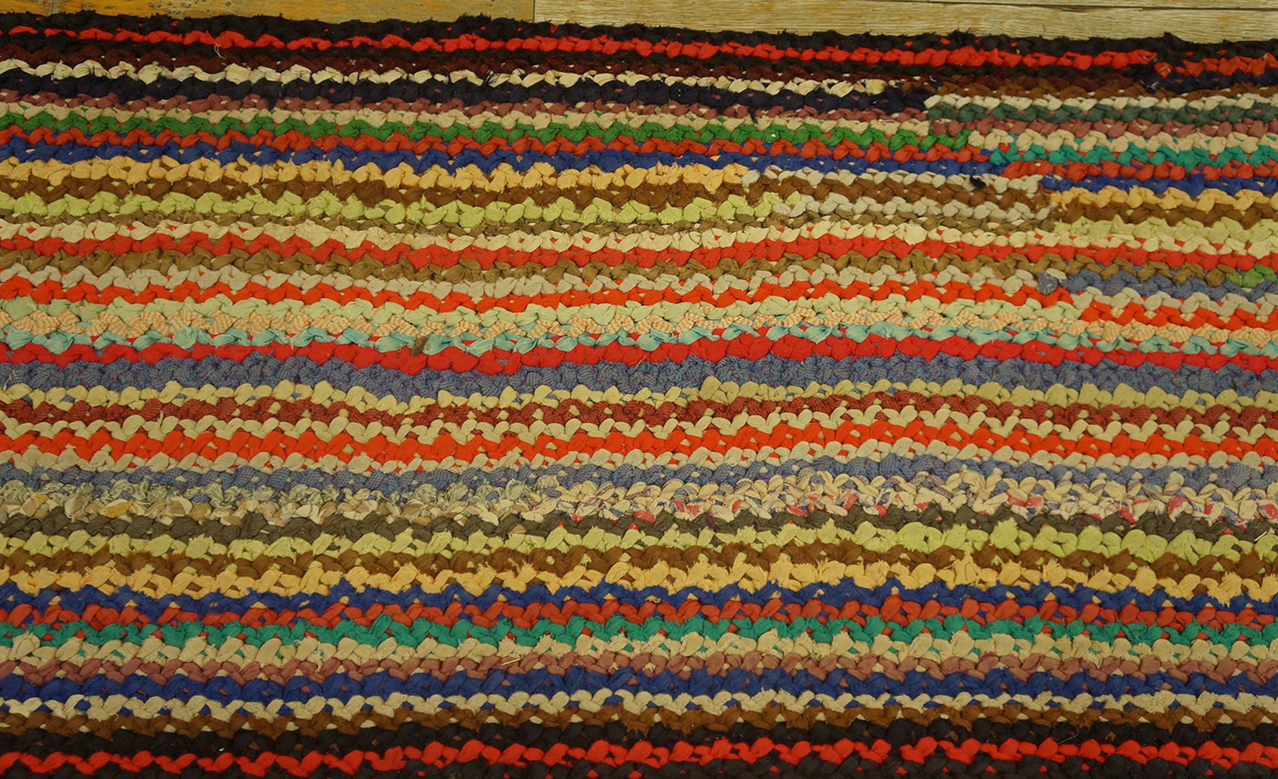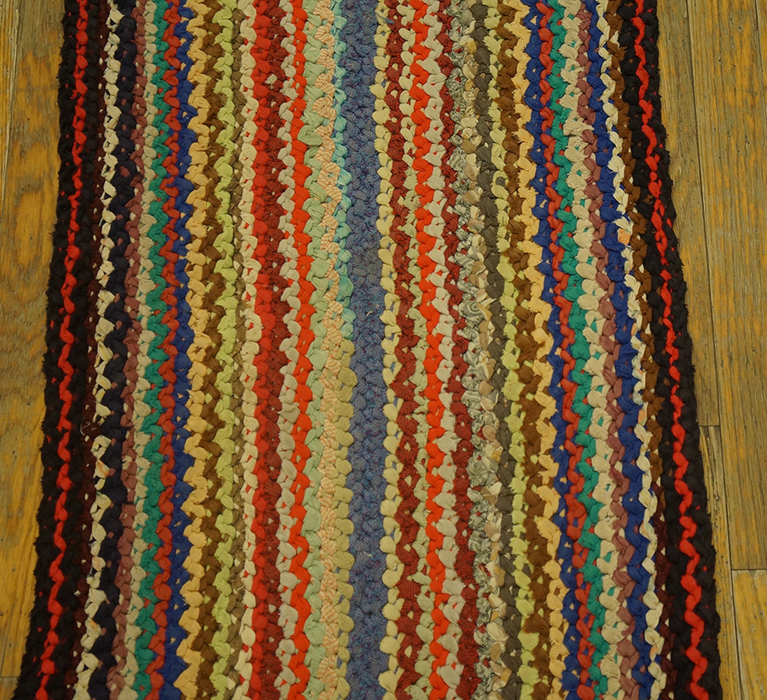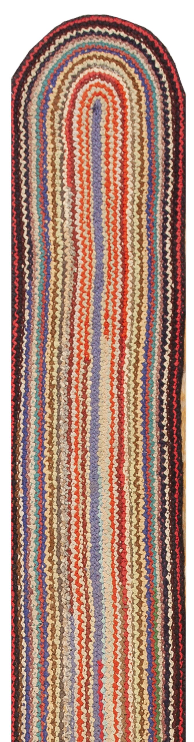 The visual appeal of this runner lies in its vibrant, yet harmonious, use of color. Strips of fabric in reds, blues, creams, and earthy browns are woven together, creating a striking multicolor jewel tone rugs effect that is both rustic and sophisticated. The design is presented as an allover rugs pattern, emphasizing the continuous flow of the braided lines from end to end without relying on traditional borders or medallions.