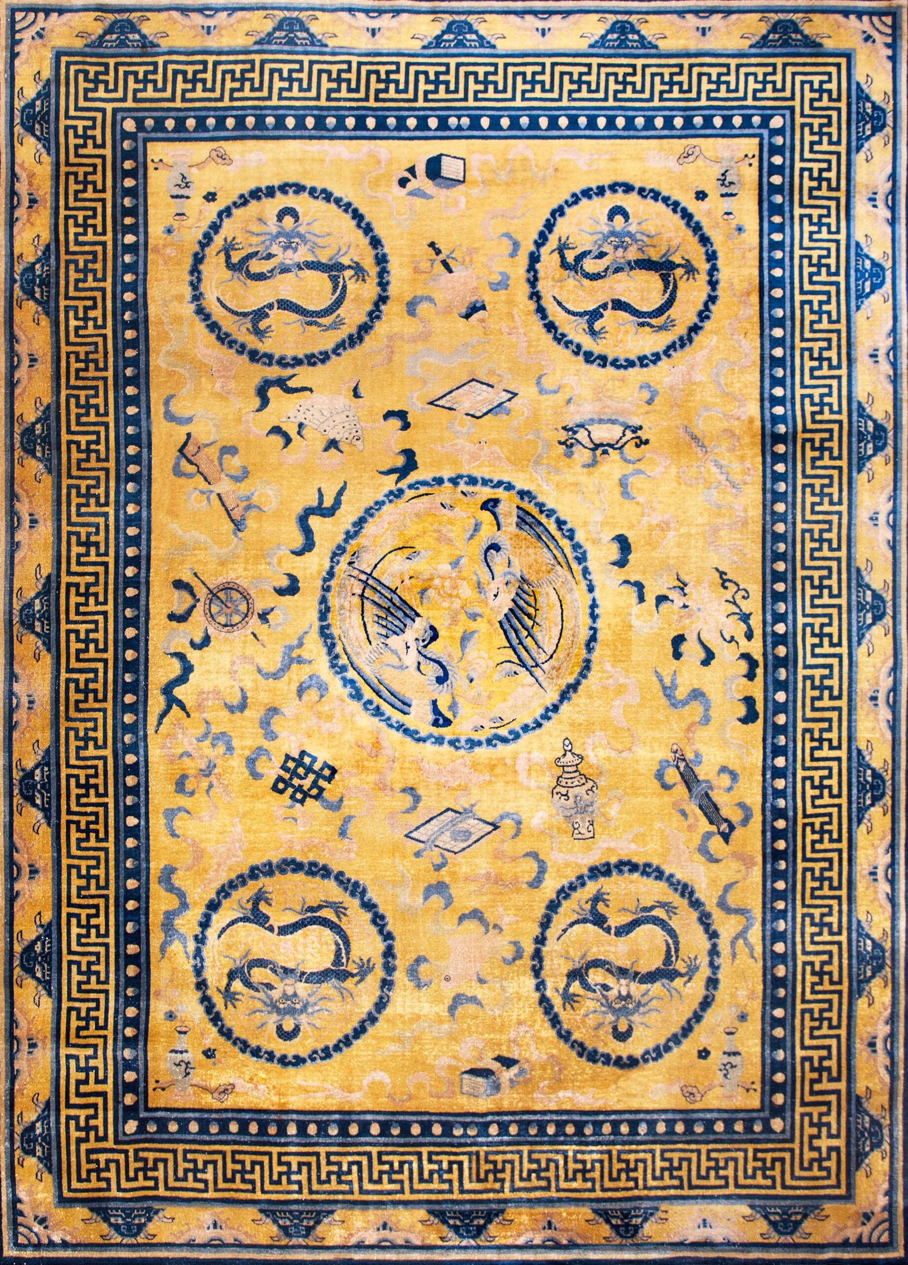 Stunning Gold Background Color Antique Dragon Chinese Bird Of Paradise Tiger Border Rug