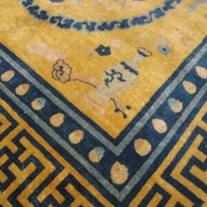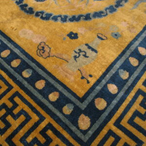 The field is anchored by a luminous gold color rug background, a color that enhances both warmth and visual depth while providing a dramatic stage for the rug’s iconic dragon design motifs. At the heart of the design, dragon figures weave through the composition with dynamic movement — representing strength, protection, and auspicious power in Chinese visual tradition. Complementing these central elements are depictions of the bird of paradise, symbolizing beauty, freedom, and spiritual elevation, which add a graceful counterpoint to the dragon imagery.