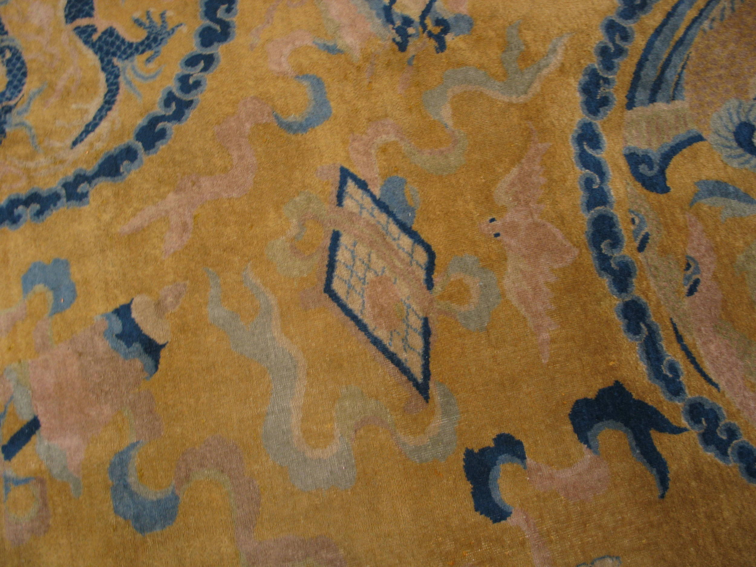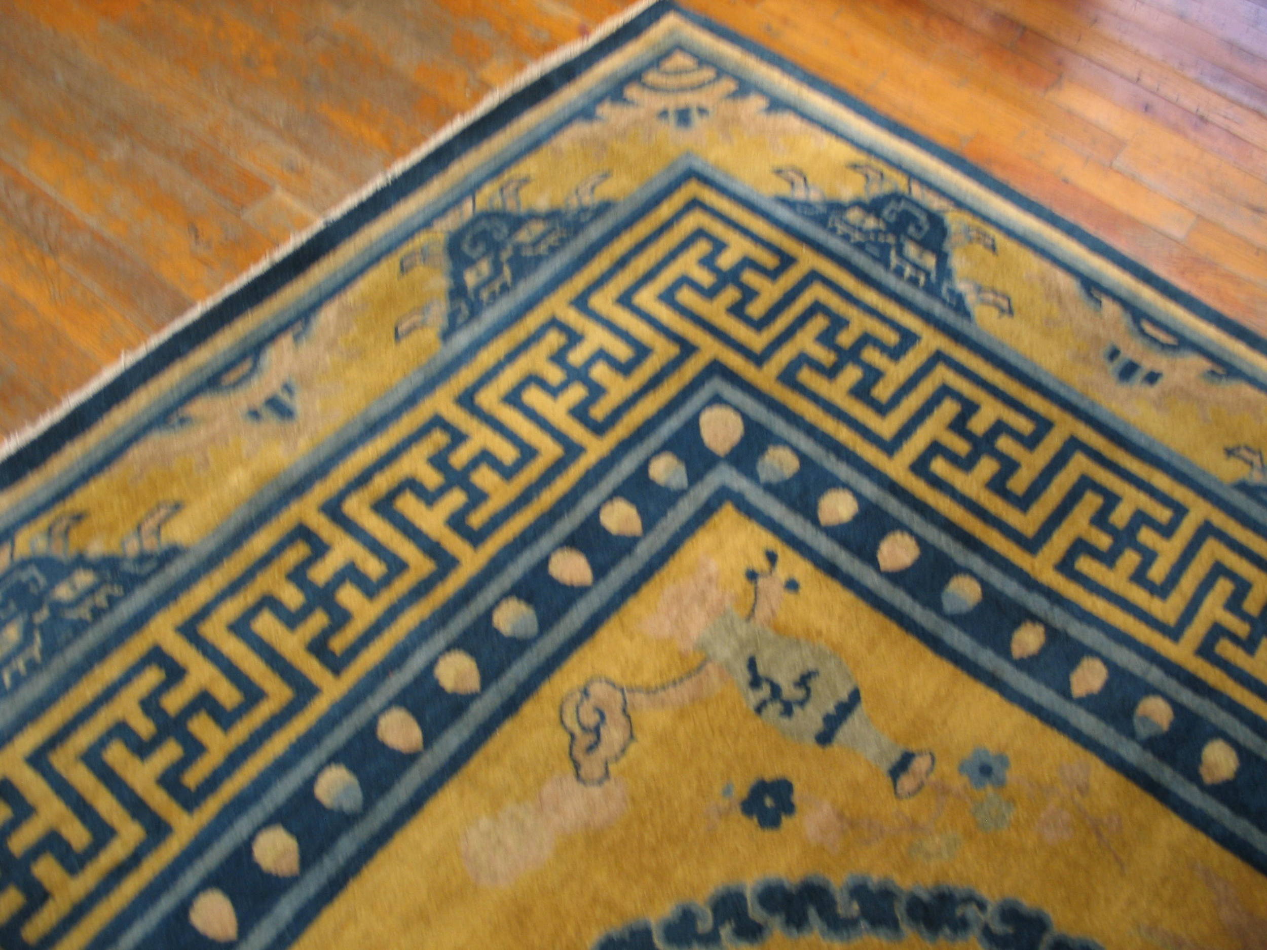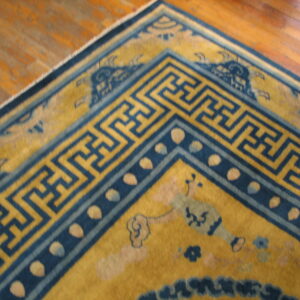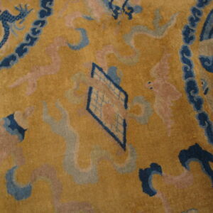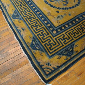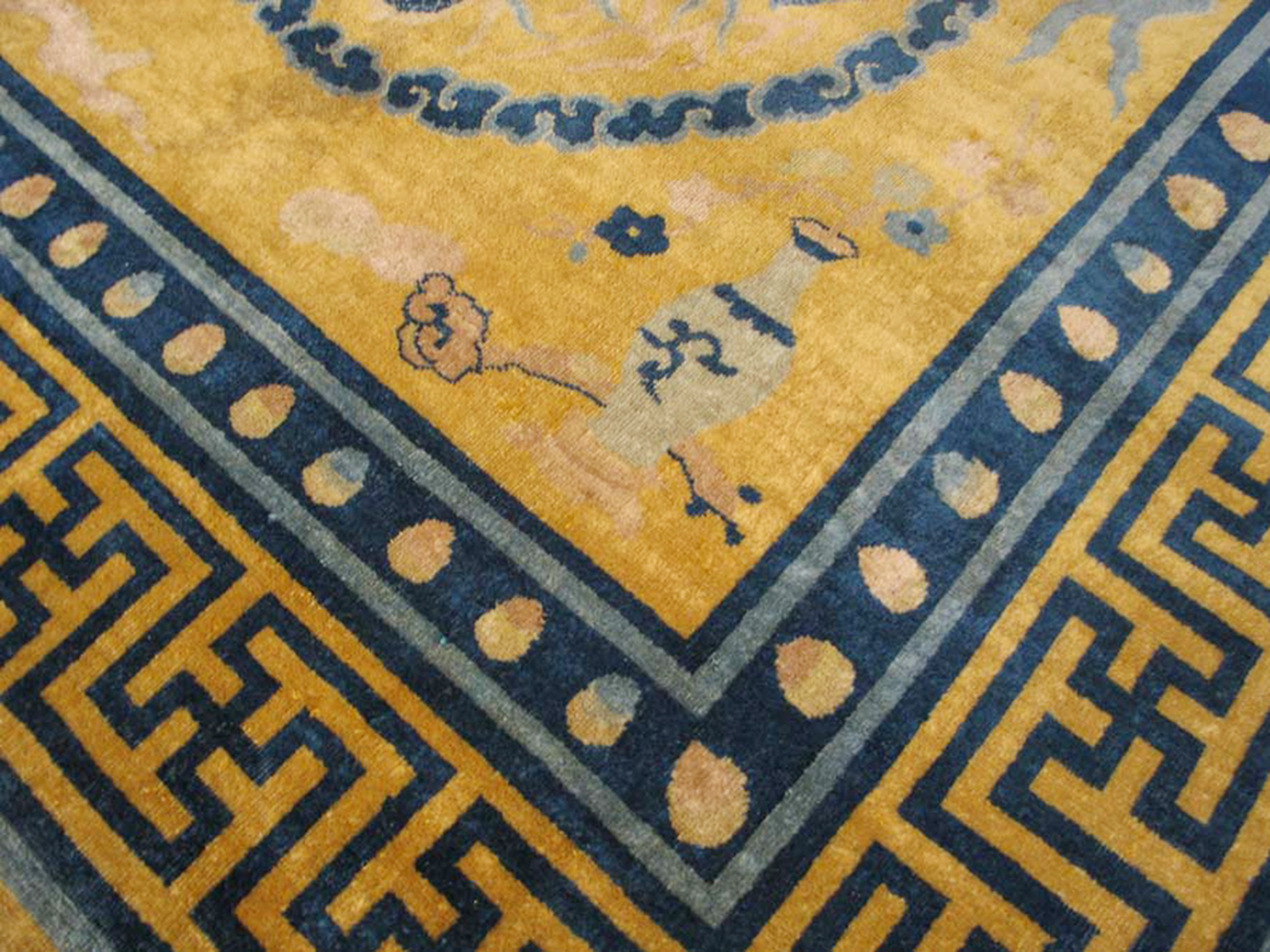 This stunning gold background color antique dragon Chinese bird of paradise tiger design border rug is a remarkable example of historic artistry of the iconic rugs from China, where powerful symbolic imagery and refined design come together in a richly expressive composition. Woven with traditional hand-knotting techniques, this magnificent antique carpet showcases the sophistication and narrative depth that define antique Chinese rugs of this period.