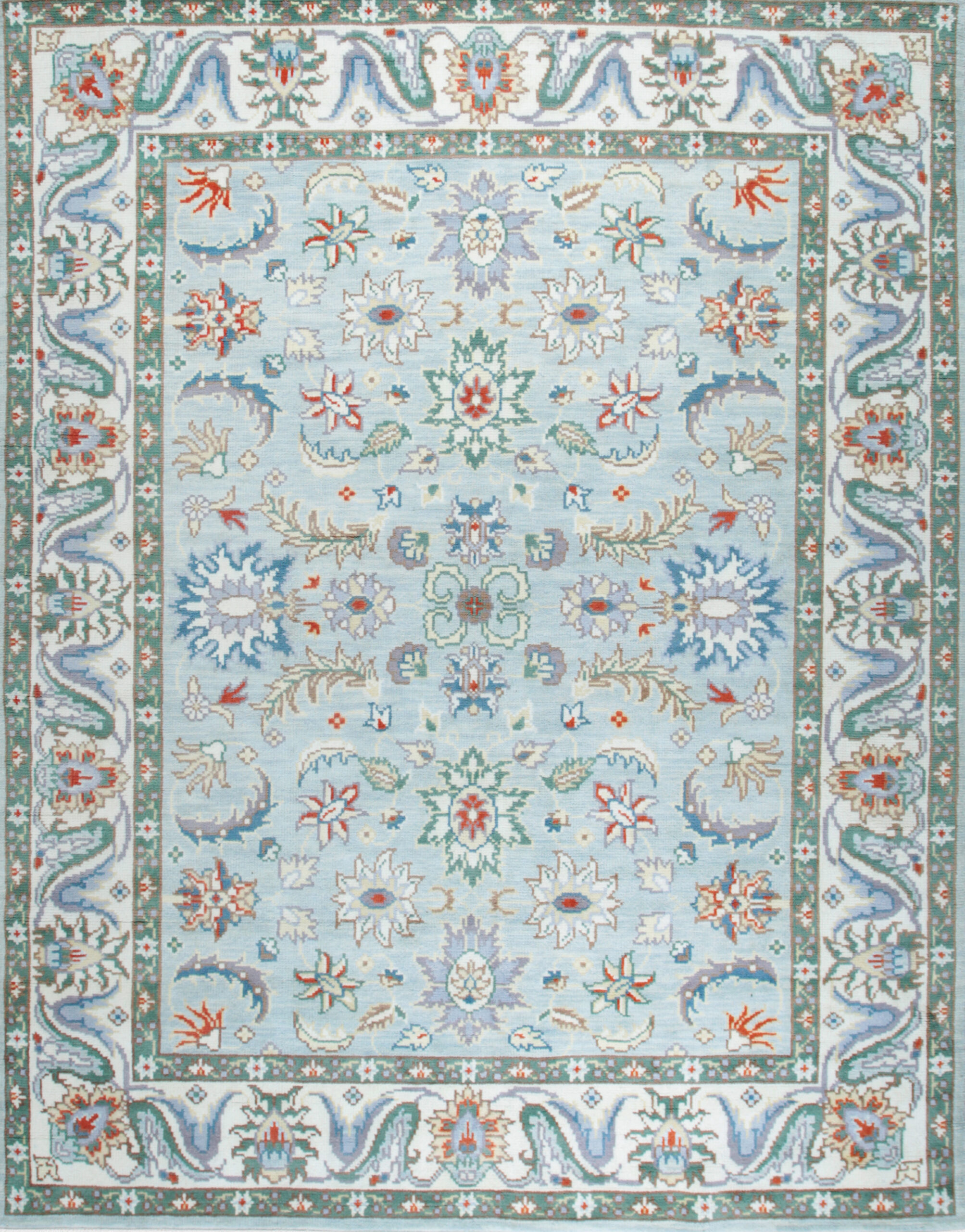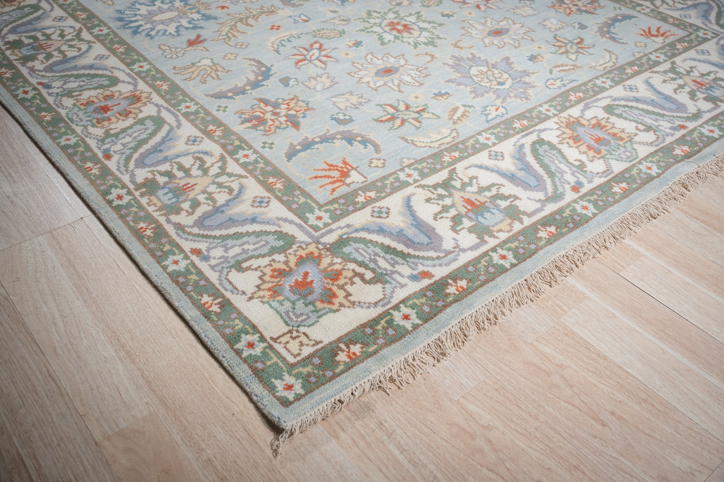 Stylish Elegant Blue Hand-Knotted Wool Rug, Country of Origin: India. This exquisite piece introduces a calming aesthetic to any space, featuring a complex, yet restrained palette. The soft, powder blue field provides the perfect backdrop for the stylized botanical elements rendered in muted greens and terracotta accents, offering a sophisticated interpretation of the elegant blue color.