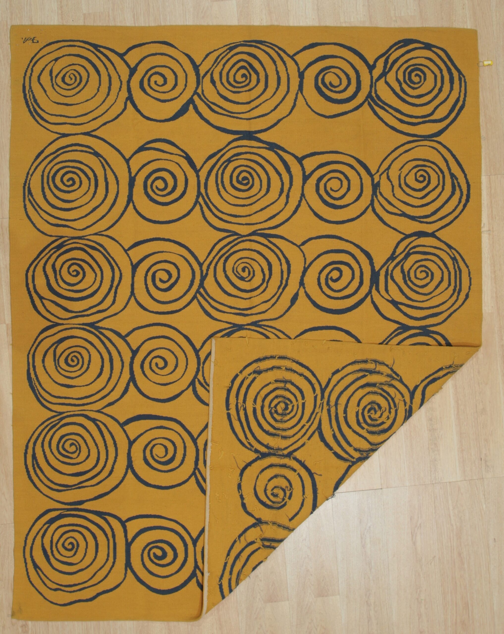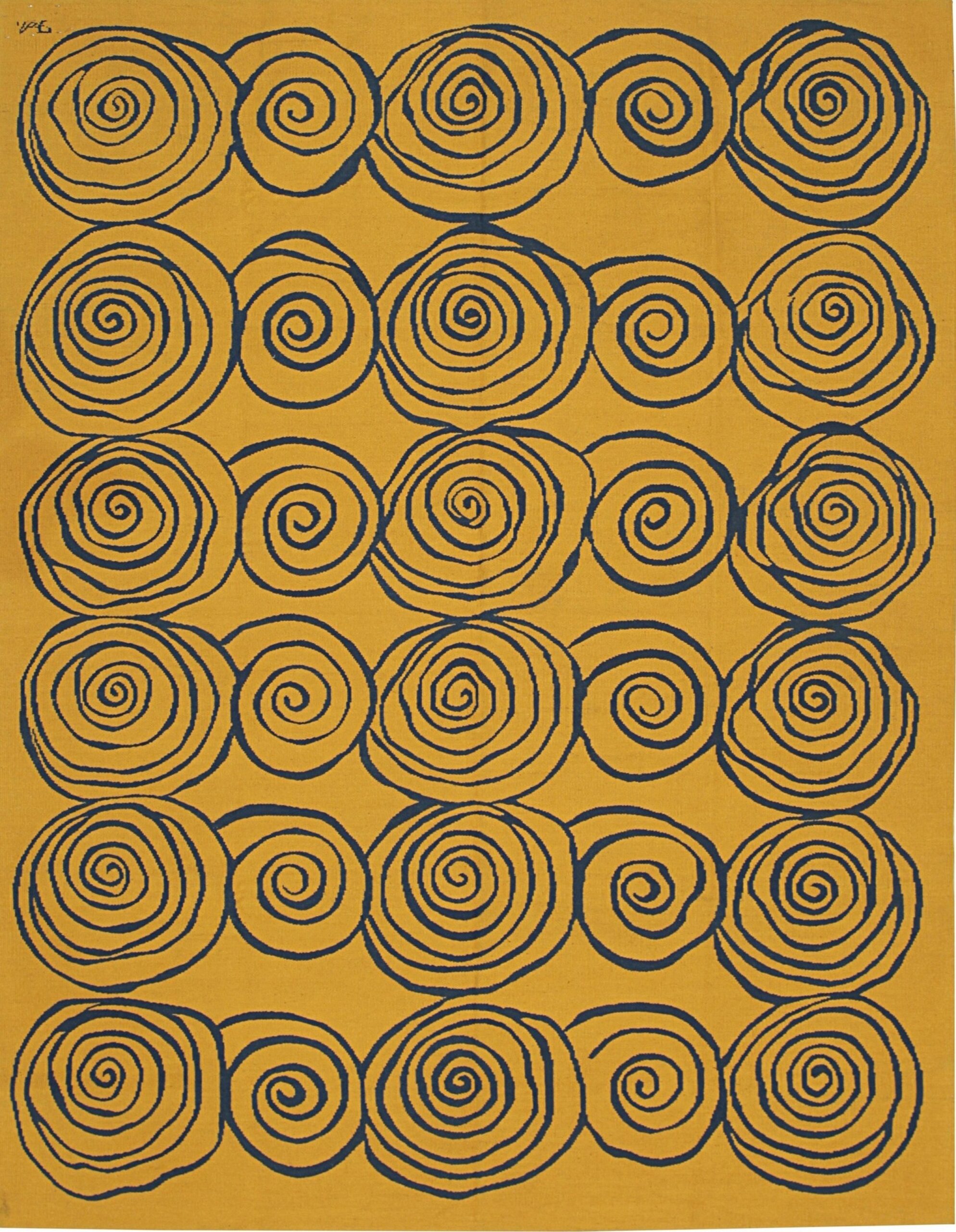 The repeating motif features large, fluid spirals rendered in deep indigo, set against an expansive, saturated field of rich mustard. This powerful contrast creates a dynamic visual rhythm, making it a standout selection among yellow color rugs designed for contemporary interiors.