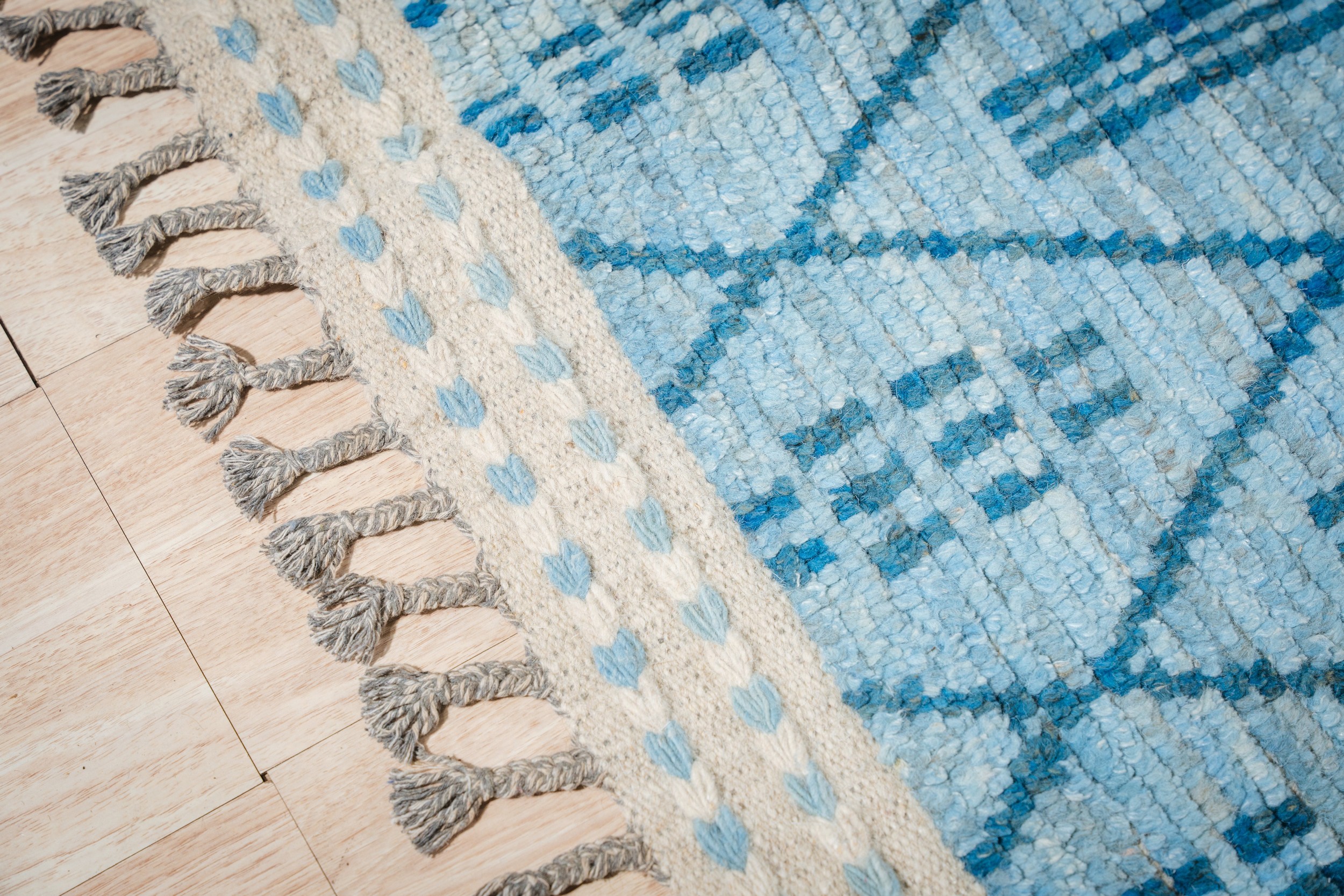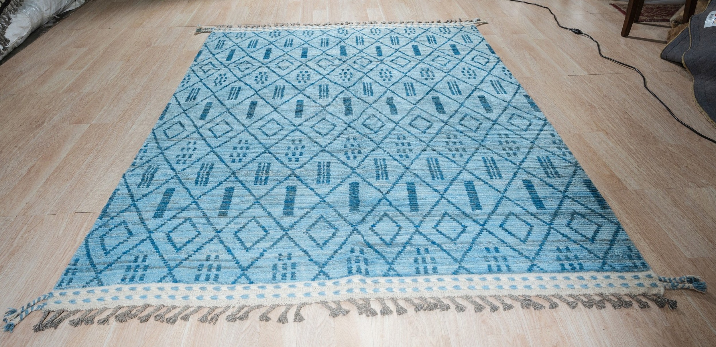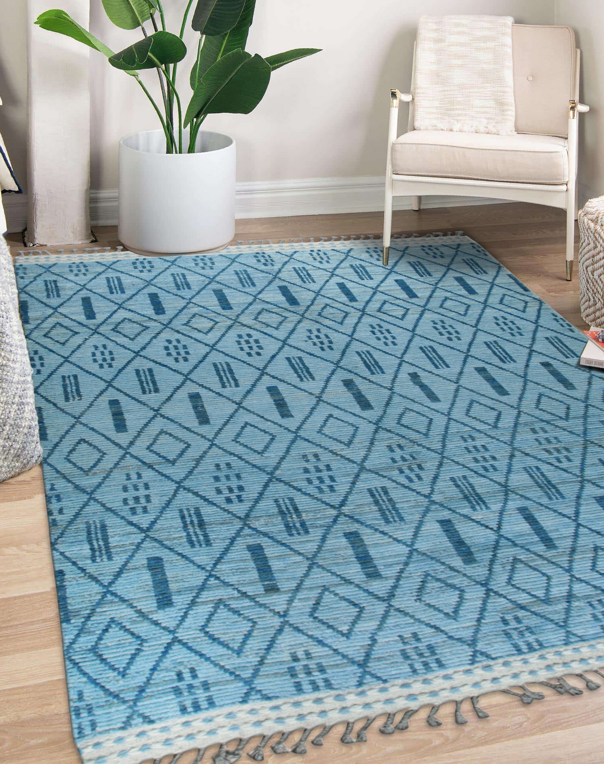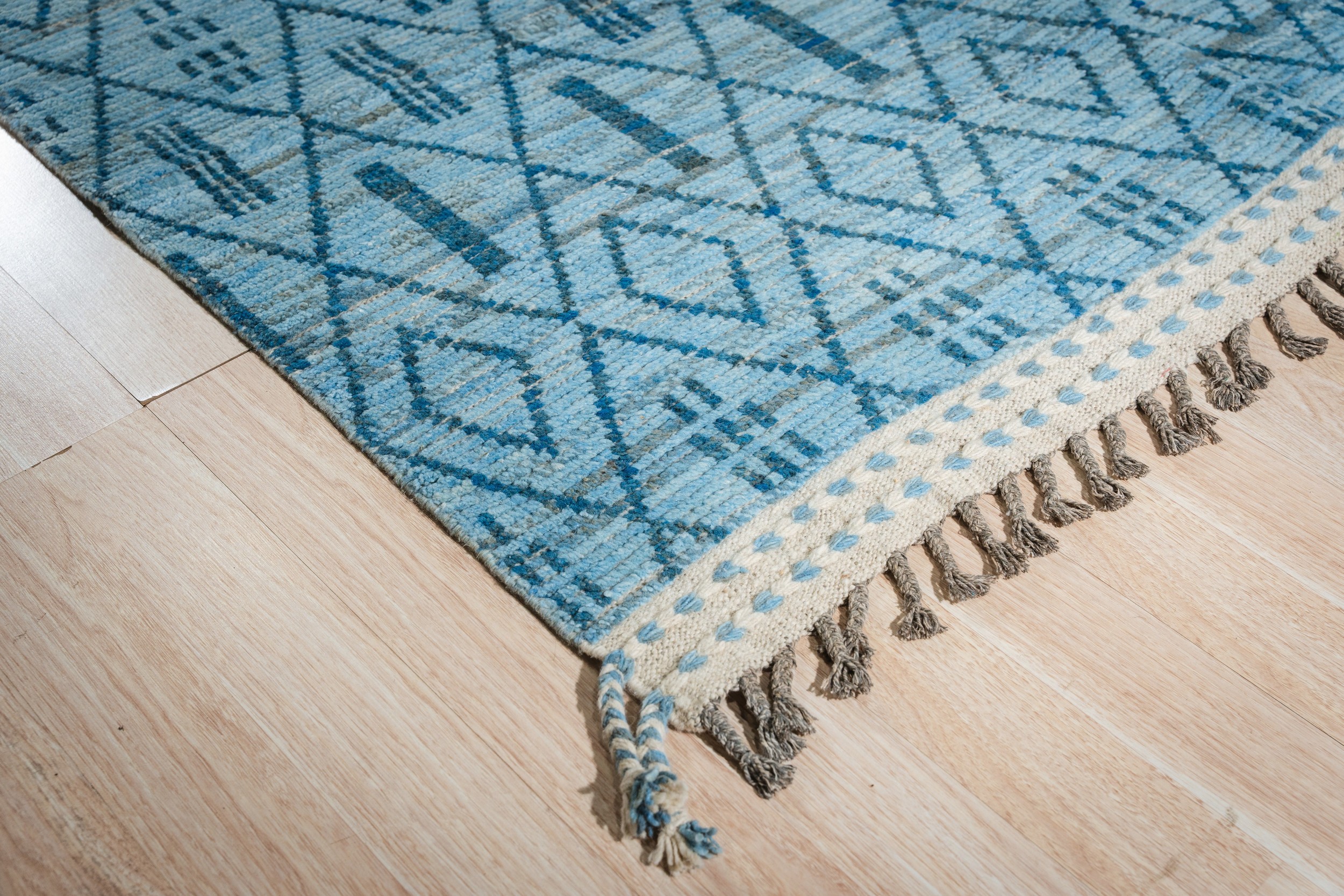 Stylish Marrakech Blue Hand-Knotted Wool Rug, Country of Origin: Pakistan. This striking piece offers a modern interpretation of traditional tribal geometry, featuring a dense, repeating diamond trellis interspersed with bold vertical dashes. The texture is soft and inviting, resulting from high-quality wool, making it a perfect addition to our collection of new area rugs.