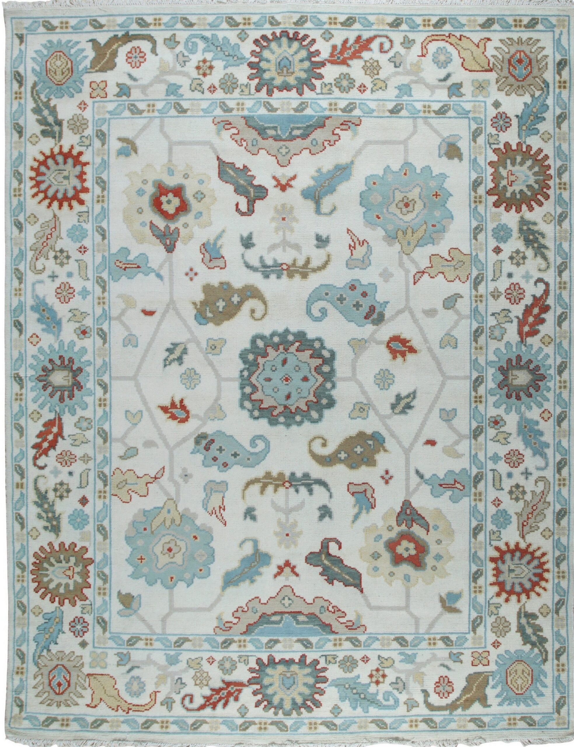 The design employs large, stylized palmettes and stylized floral elements, characteristic of updated traditional weaving. These motifs are distributed evenly across the field in a graceful, flowing composition, often referred to as allover rugs. A detailed, multi-layered border frames the central design, providing a crisp visual boundary and enhancing the rug’s architectural structure.