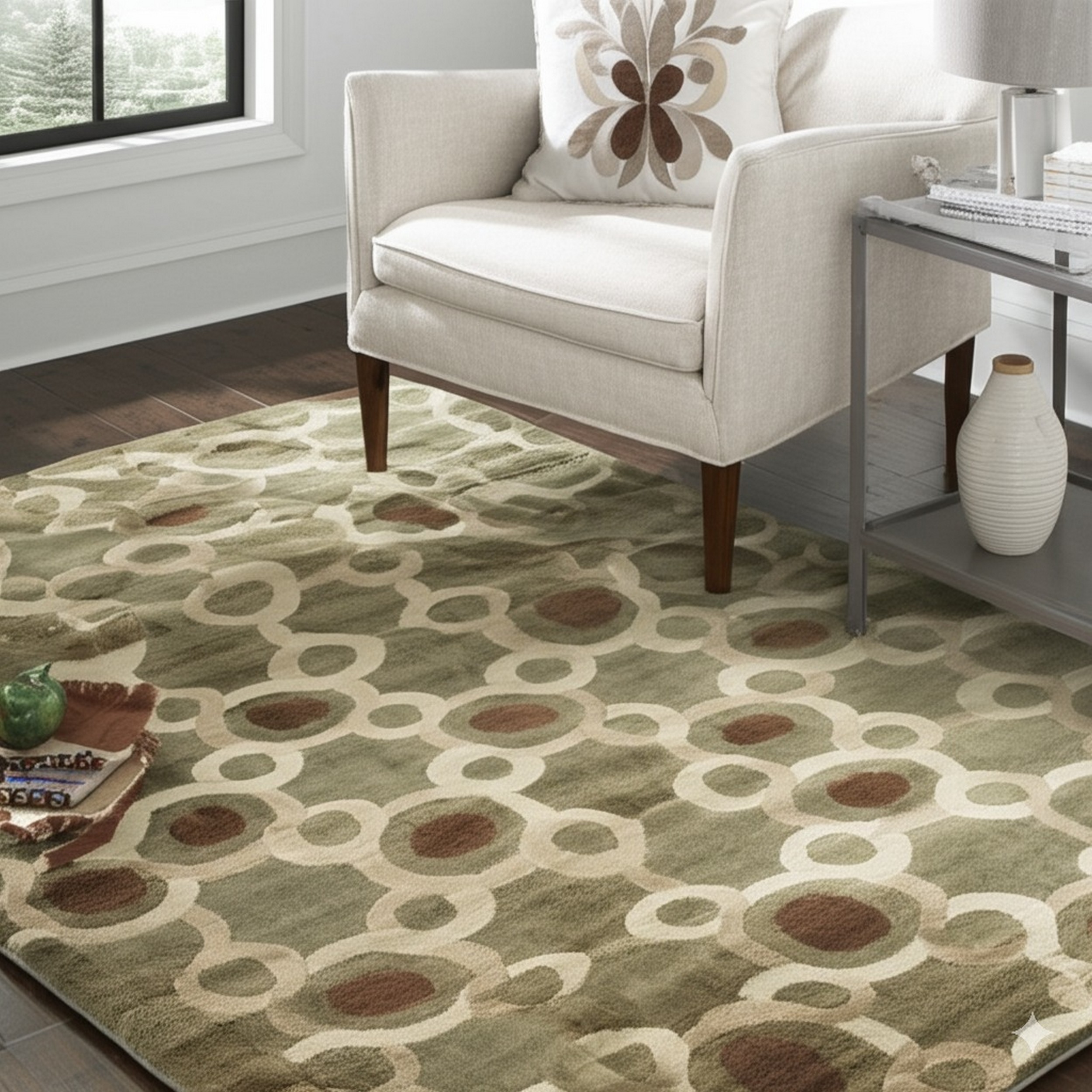The palette is anchored by a sophisticated, mossy field color, complemented by rich chocolate browns and creamy ivory accents. This interplay of neutral and earthy tones ensures the rug integrates seamlessly into diverse design schemes, making it a compelling choice among green color rugs.