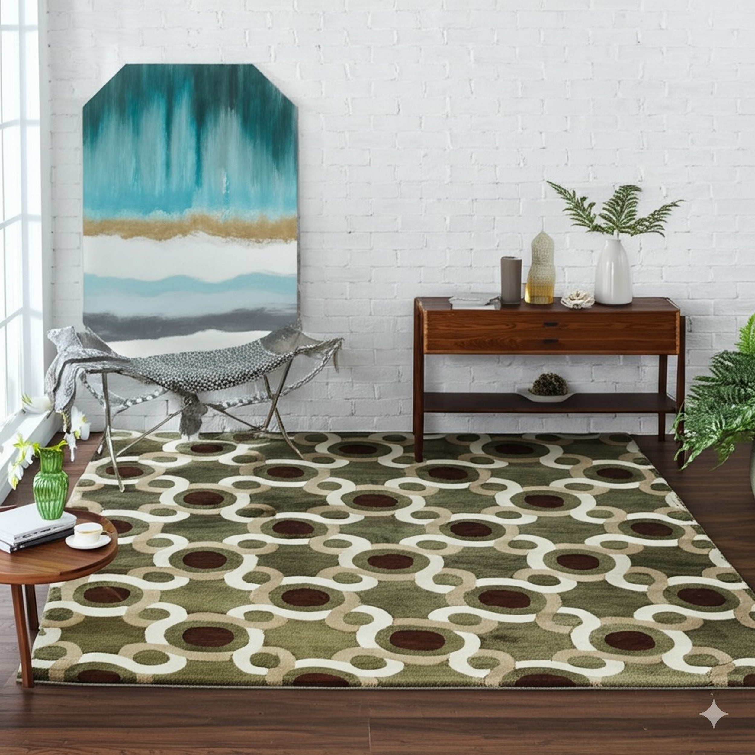 A bold, repeating geometric pattern dominates the surface, featuring interlocking circles and sinuous lines that evoke a mid-century modern sensibility. This dynamic, all-over design avoids traditional borders, creating an expansive visual field that defines the current trend in new area rugs.
