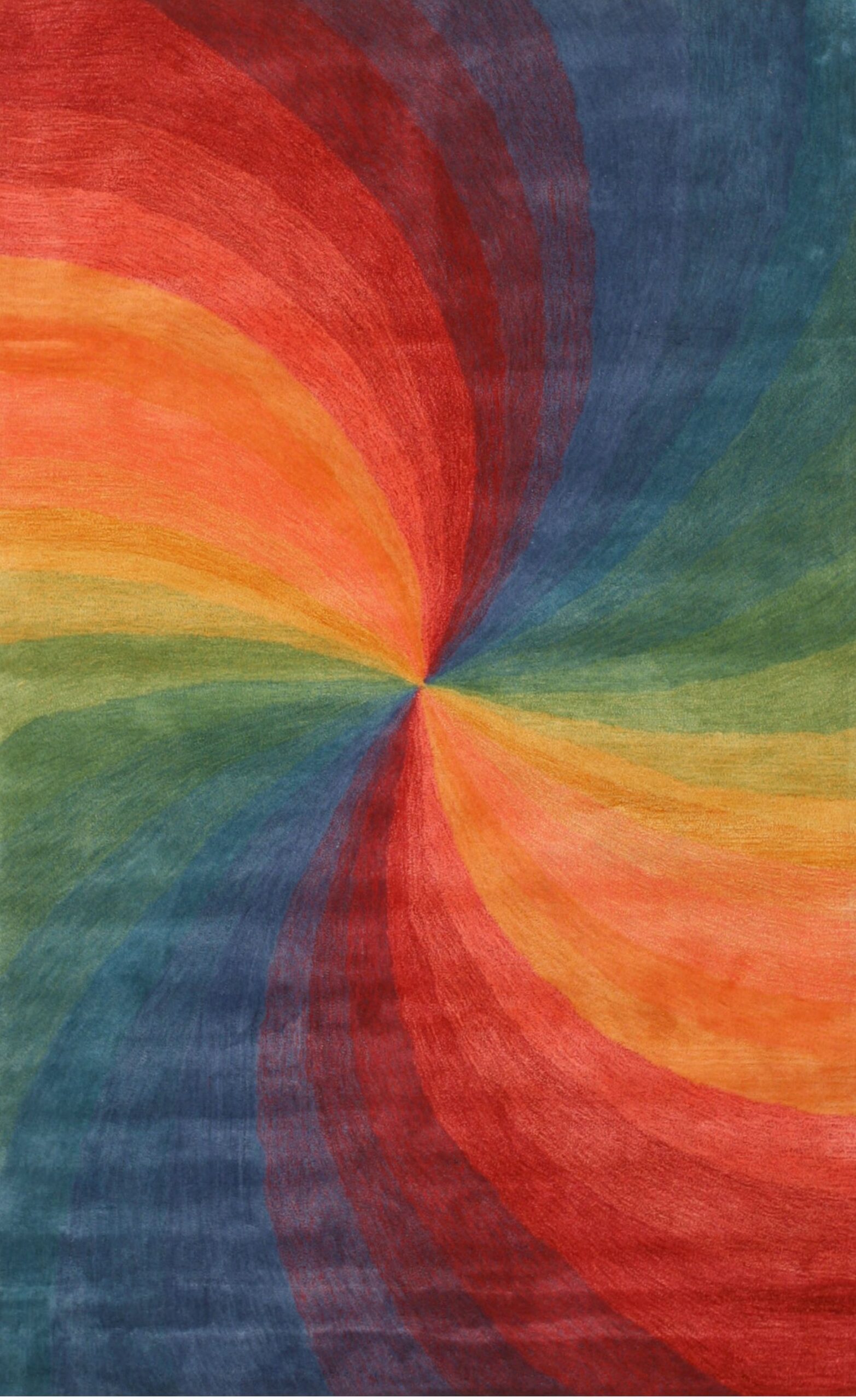 The design is characterized by sweeping, concentric bands of saturated color—from deep indigo and forest green to fiery orange and crimson—all radiating outward from a precise central axis. This dramatic visual effect, crafted in the tradition of Indian rugs workshops, creates an illusion of perpetual motion, transforming the floor into an immersive artistic canvas.
