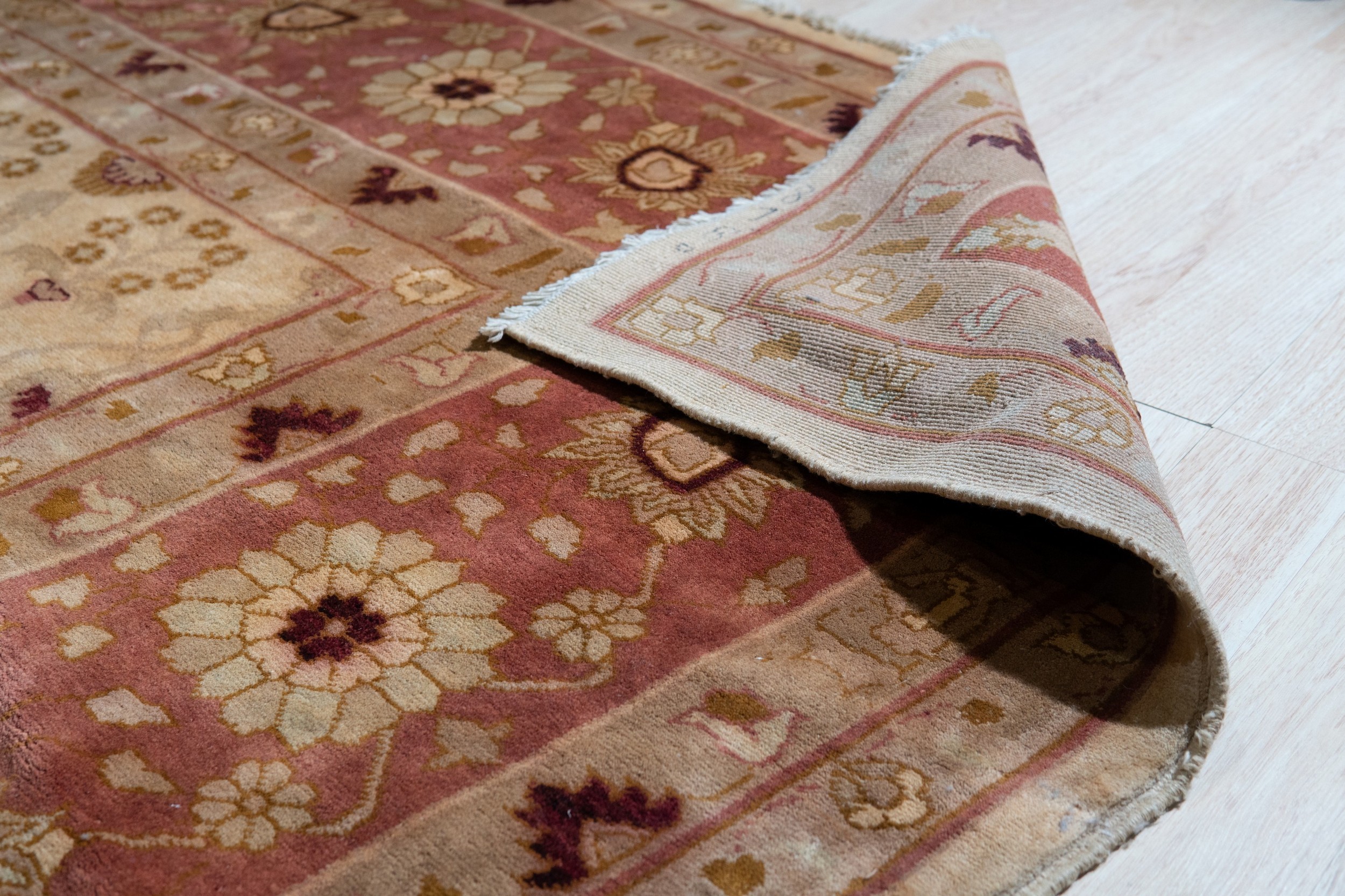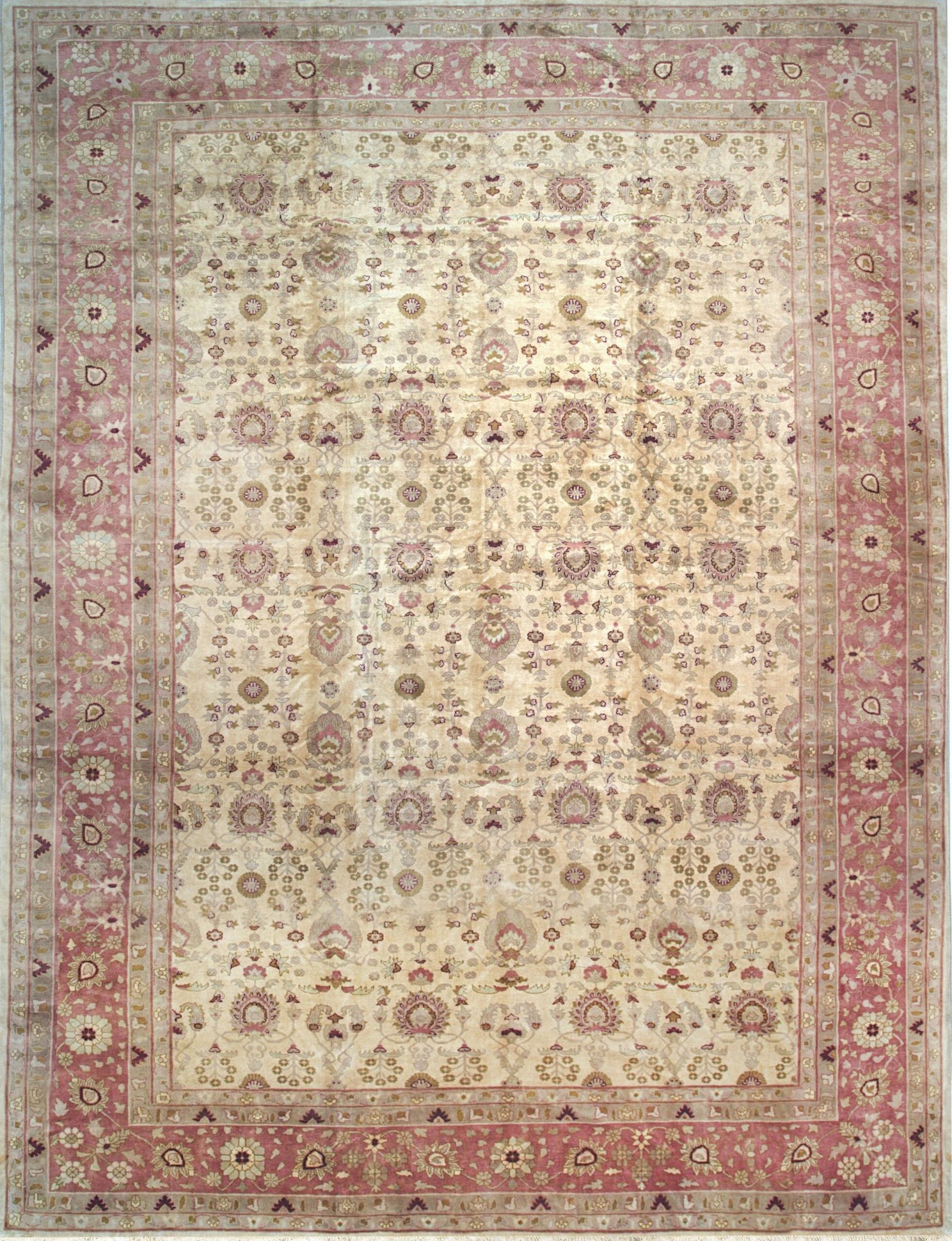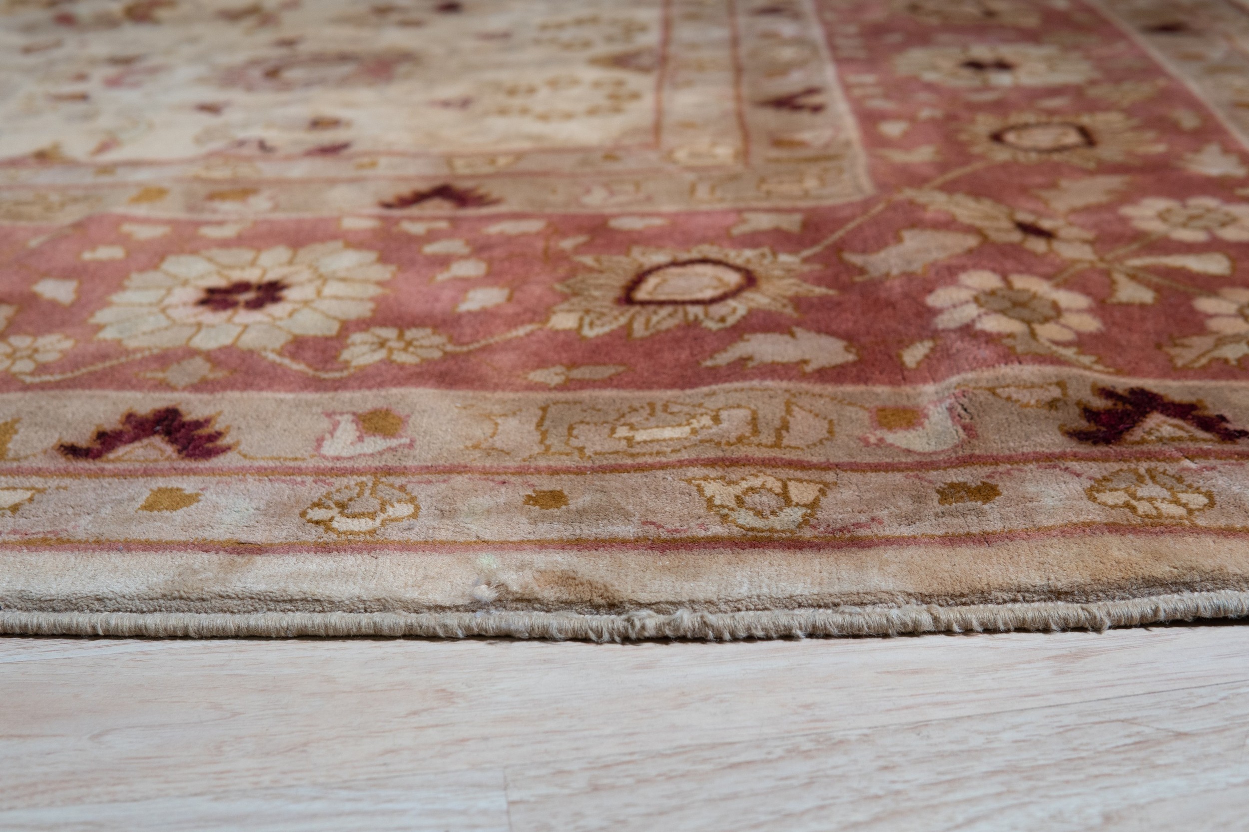 The palette is defined by a luminous, creamy ivory ground that allows the intricate botanical patterns to float gracefully across the field. This soft neutral is beautifully framed by the main border, which utilizes a sophisticated hue that falls between rose and salmon coral pink color rugs. This subtle coloration provides warmth without overwhelming the space, ensuring versatility in decoration.