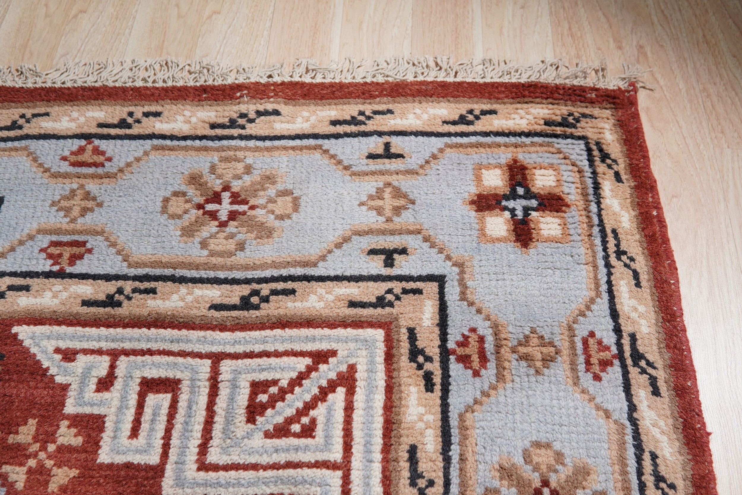 The design employs bold geometric forms, including stylized star medallions and complex corner spandrels featuring stepped and meander elements. While rooted in historical precedents, the clarity of the lines and the robust color blocking give this piece a fresh, contemporary appeal, making it an excellent addition to our collection of new area rugs.