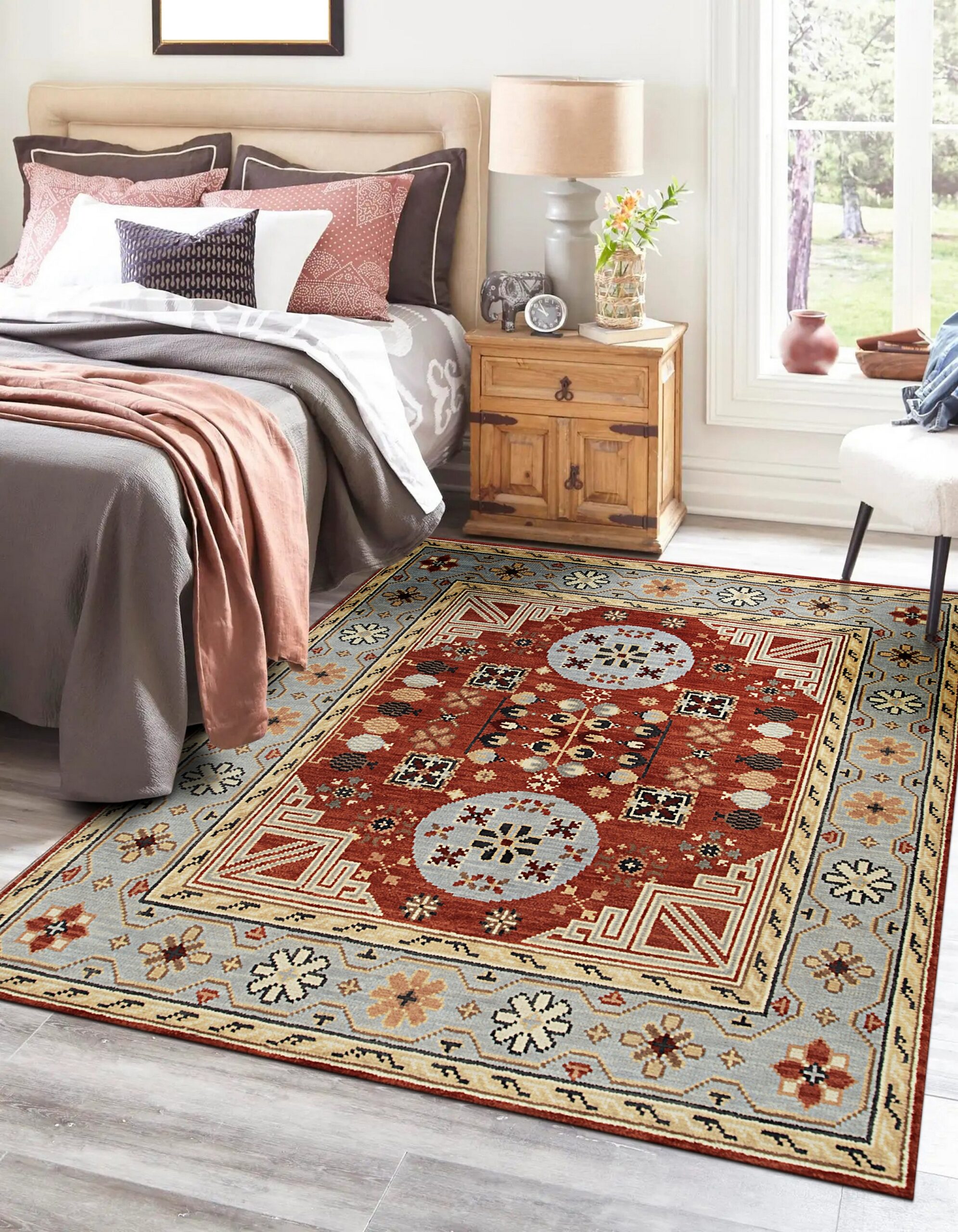 The commanding central field is rendered in a deep, earthy rust, providing a warm foundation for the intricate patterning. This rich hue is beautifully offset by the cool, dusty blue of the primary border, creating a sophisticated visual tension. This color combination is highly sought after, often aligning with modern interpretations that lean toward terracotta tones.