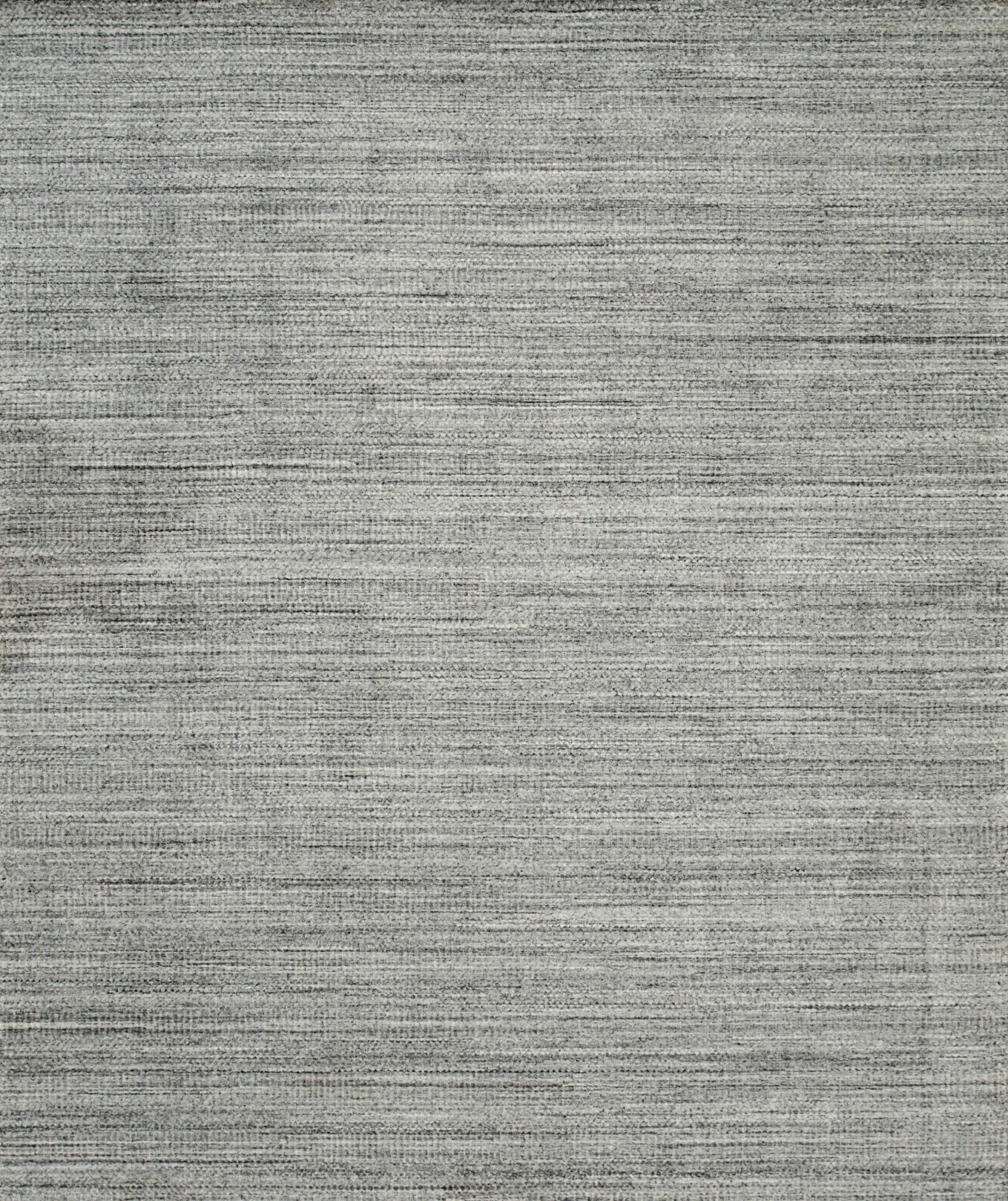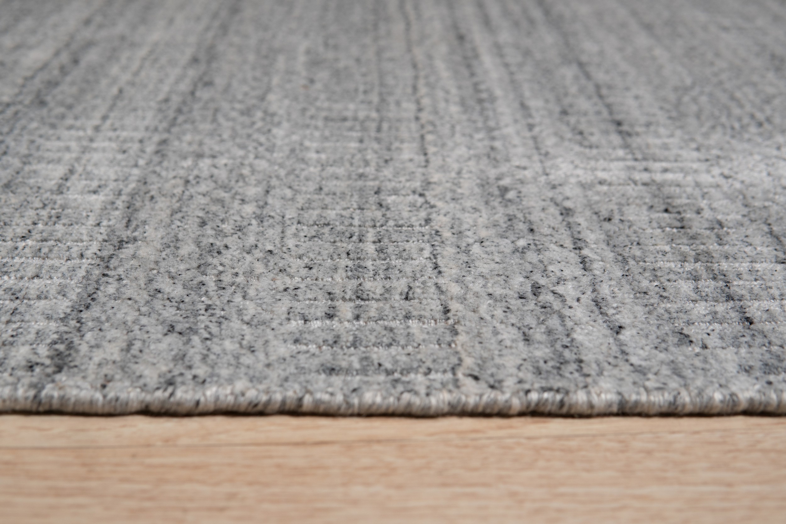 Tessa Xena Silver Handmade Wool Rug, Country of Origin: India. This sophisticated piece presents a minimalist aesthetic, utilizing a dense, hand-loomed wool construction to create a subtle, striated texture. The weaving technique, common among contemporary Indian rugs, emphasizes material quality over complex design, making it an ideal anchor for modern interiors.