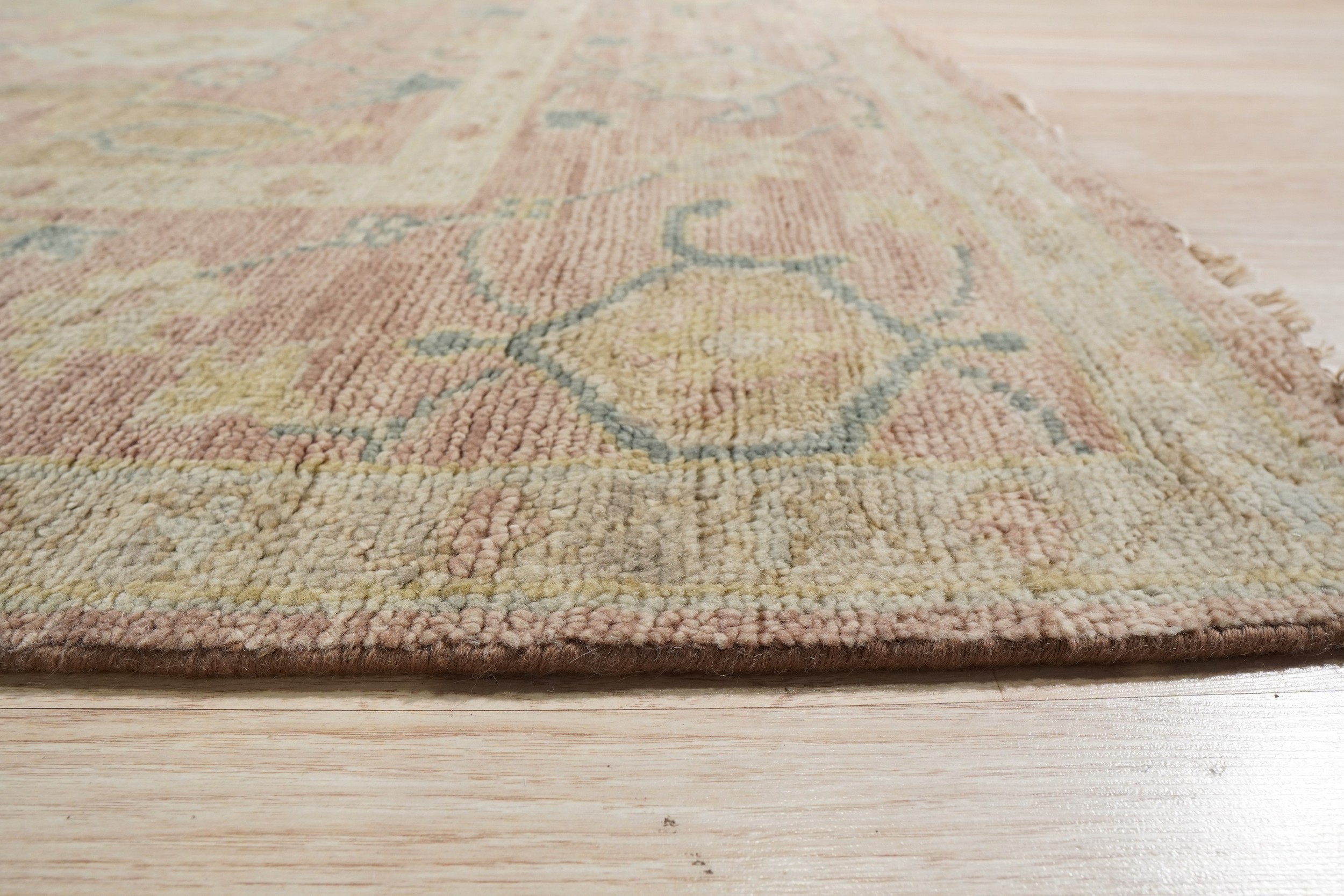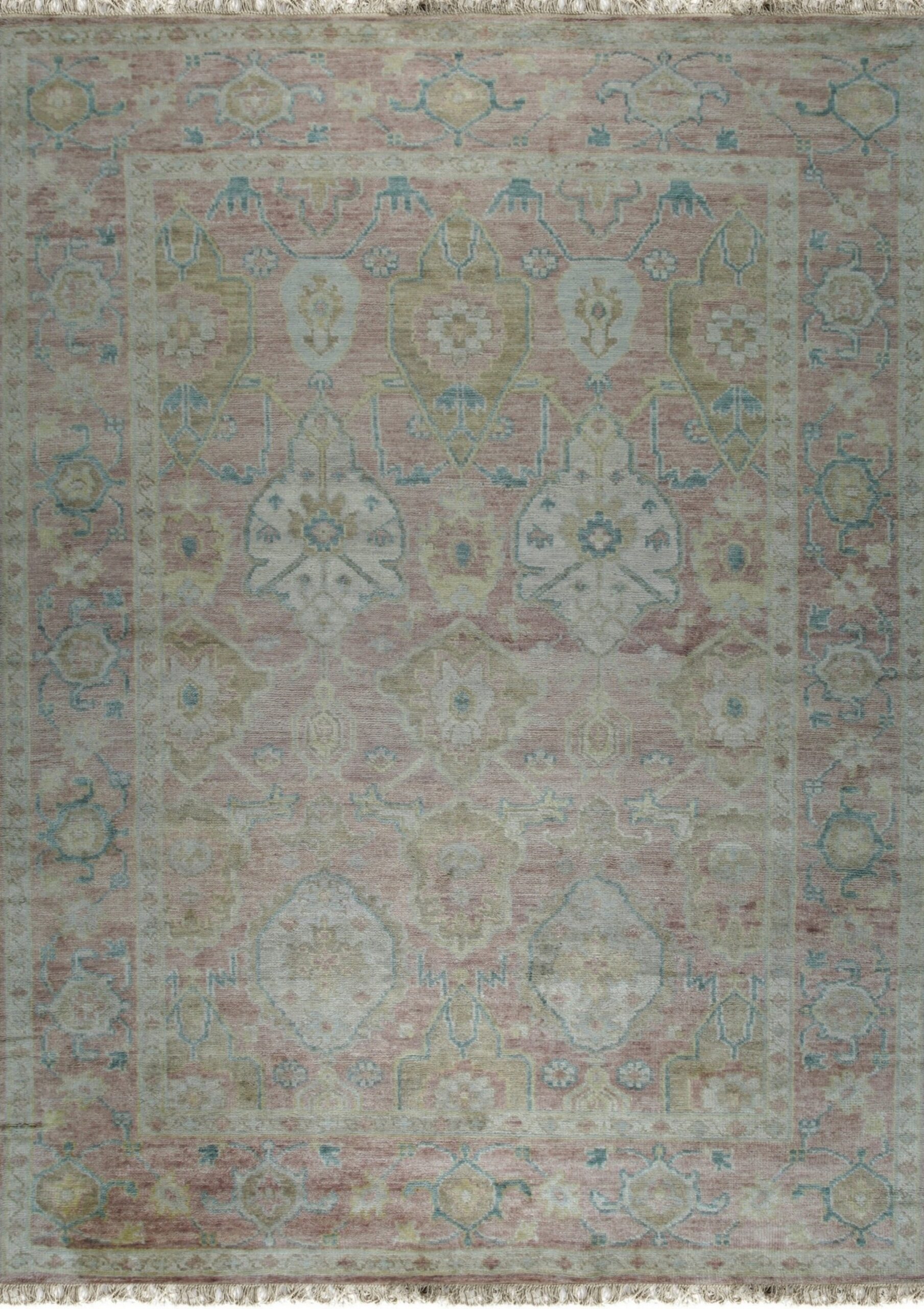 Hand-knotted from premium wool, the texture is plush yet durable, designed for enduring beauty. The primary field color is a sophisticated, dusty rose, complemented by accents of pale aqua, sage green, and cream. This delicate balance of hues makes it a perfect selection for those seeking pink color rugs that offer warmth without overwhelming the room’s existing decor.