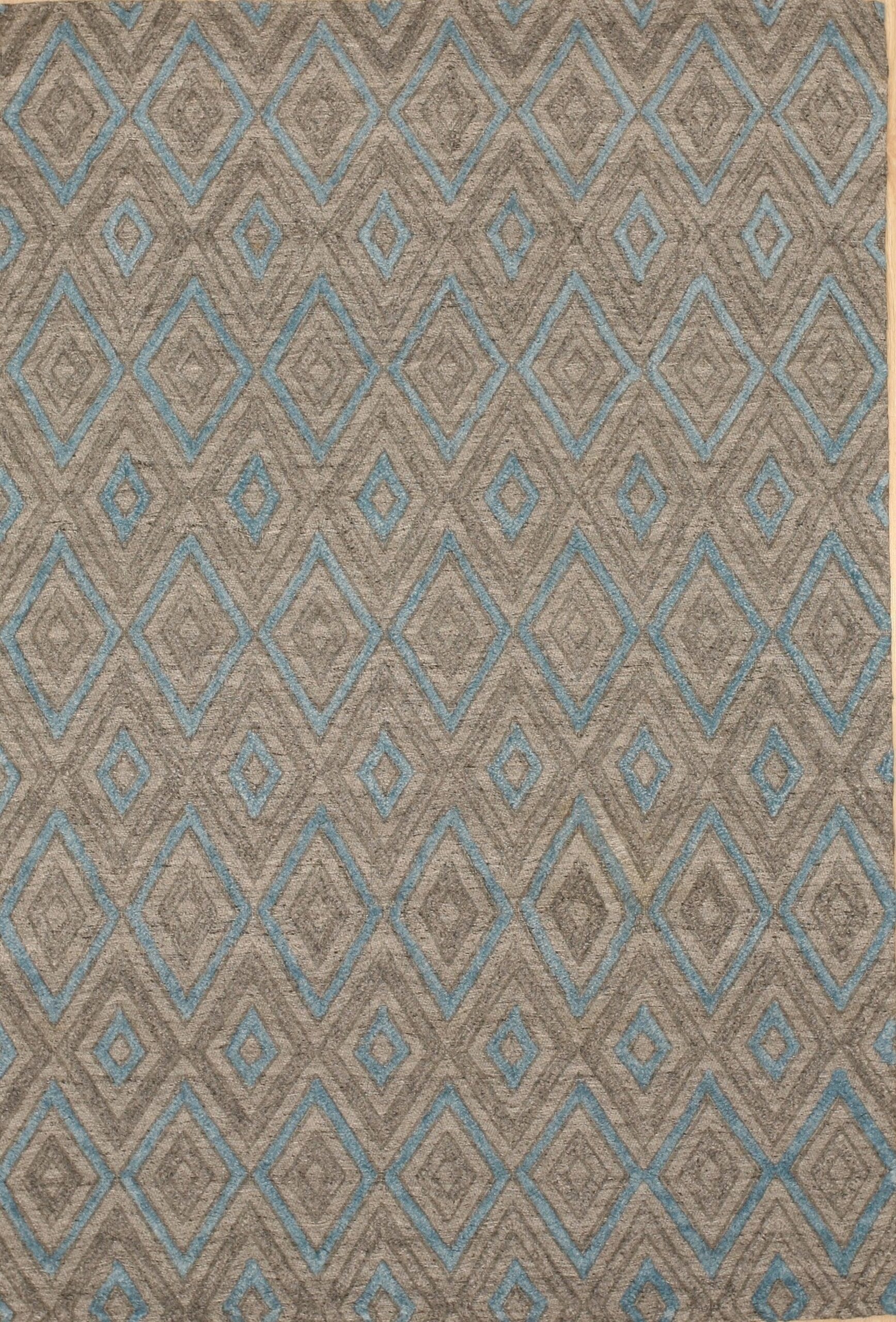 The repeating diamond motif is expertly defined by contrasting lines of soft aqua blue, providing a refreshing counterpoint to the deep, heathered base. The primary field uses a complex, textural blend of wool and viscose, establishing it firmly among the most desirable gray color rugs available today, offering depth without visual weight.