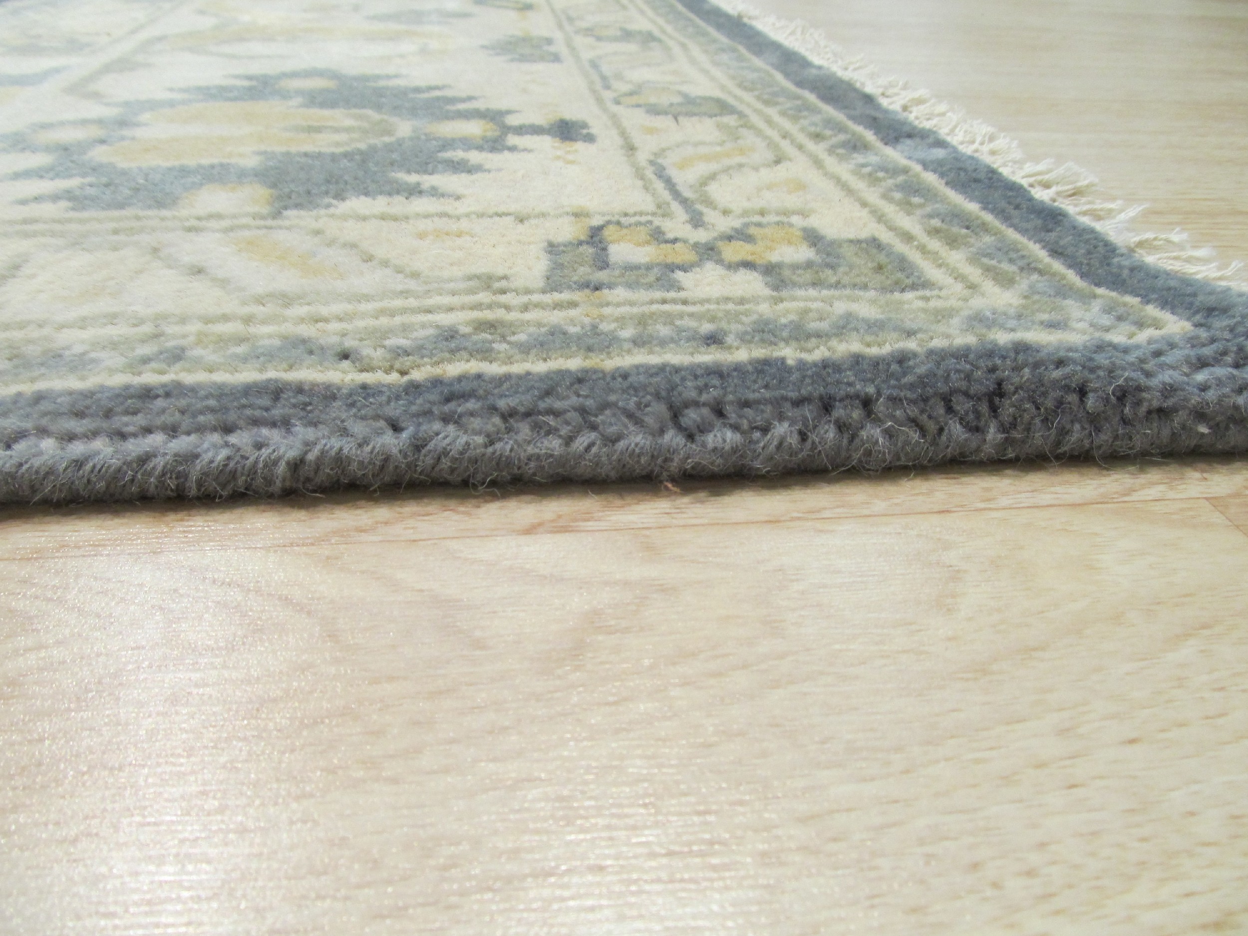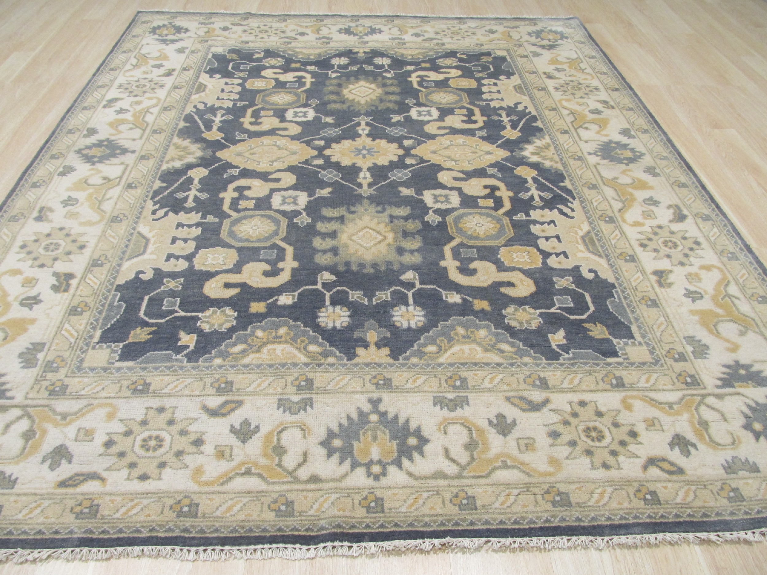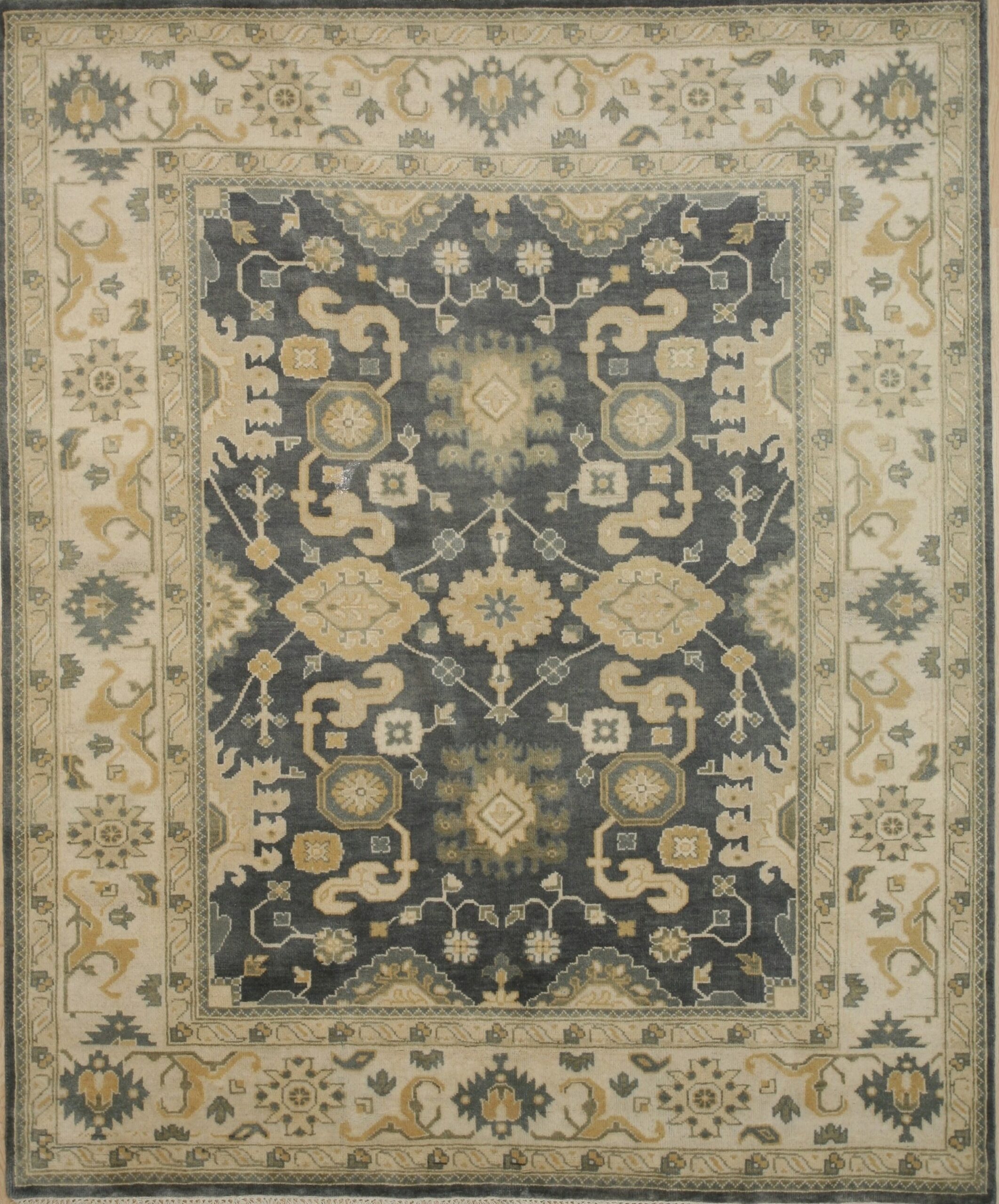 Expertly woven by skilled artisans, this rug is a testament to the enduring quality of Indian rugs production, which often draws inspiration from classic Persian and Turkish designs while employing innovative color palettes. The crisp, ivory border frames the central design, utilizing gold and muted sage accents to highlight the intricate guard bands and corner spandrels.