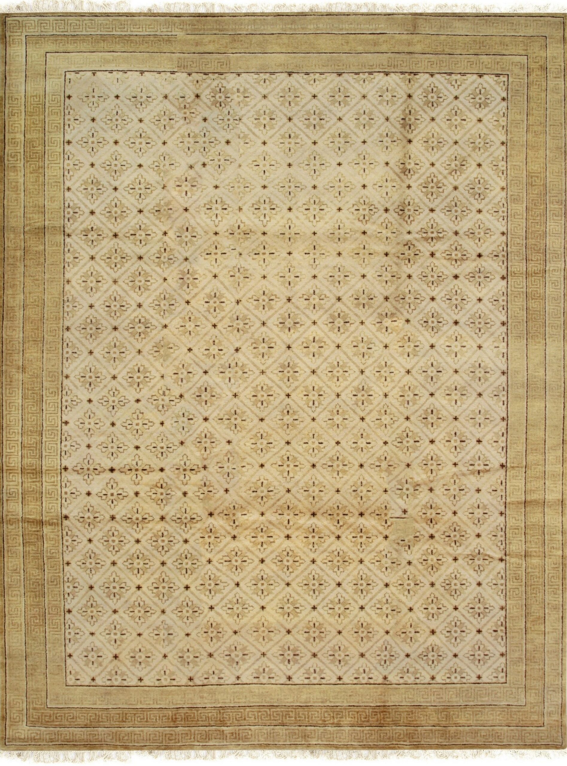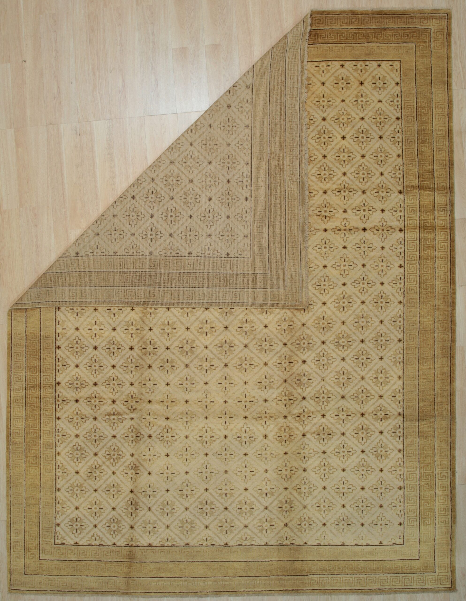 A striking Greek key border, rendered in a deeper tone of camel, frames the central design, providing visual structure and a subtle classical reference. Given its generous proportions, this piece is ideally suited for grand living spaces or formal dining areas, qualifying it among our premium selection of room size rugs.