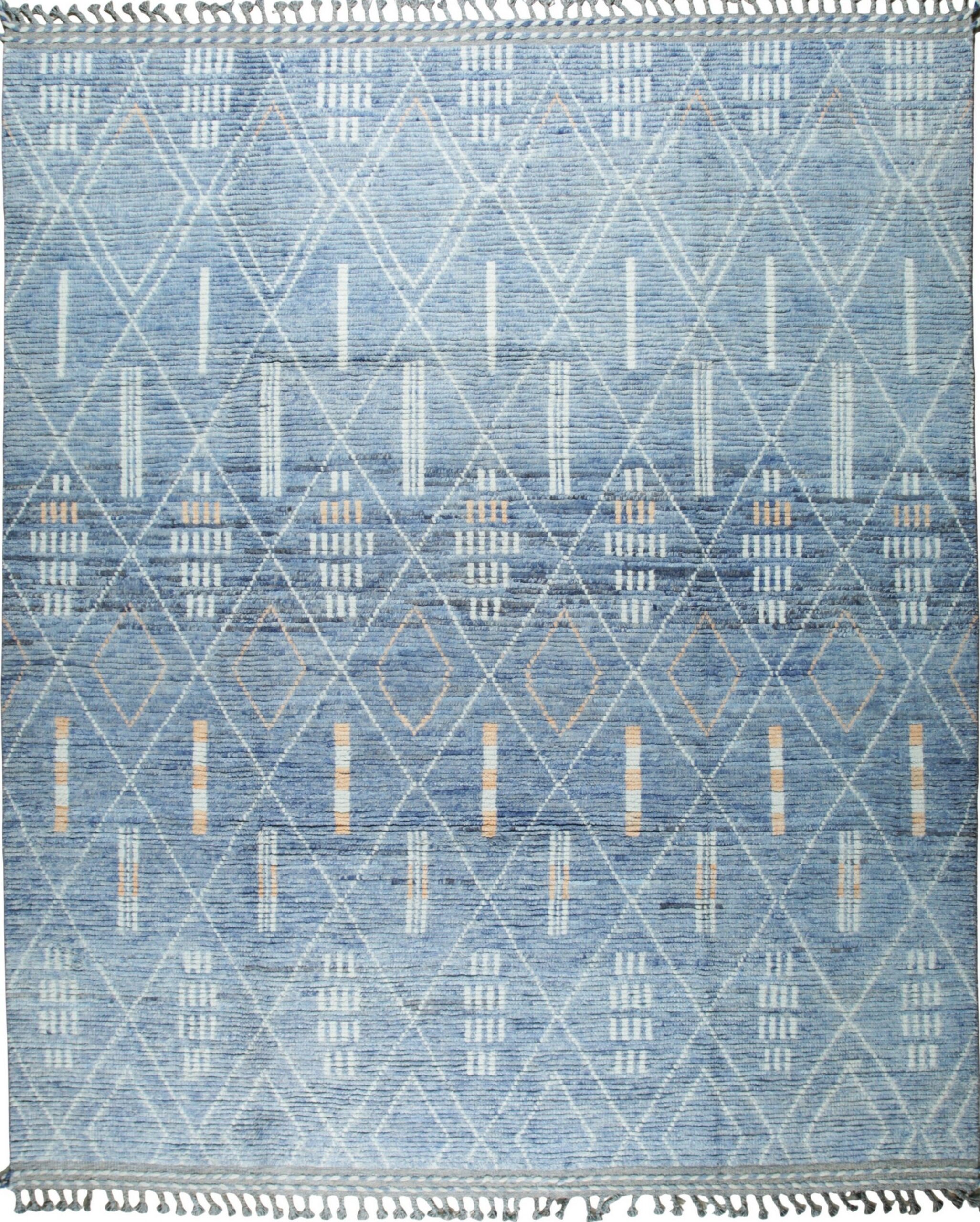 Graceful Marrakech Blue Hand-Knotted Wool Berber Carpet, Country of Origin: Pakistan. This exquisite piece marries traditional nomadic geometry with a highly refined contemporary palette. The skilled artisans responsible for Pakistani rugs have utilized premium wool to create a dense, luxurious pile that offers both visual depth and exceptional comfort underfoot.