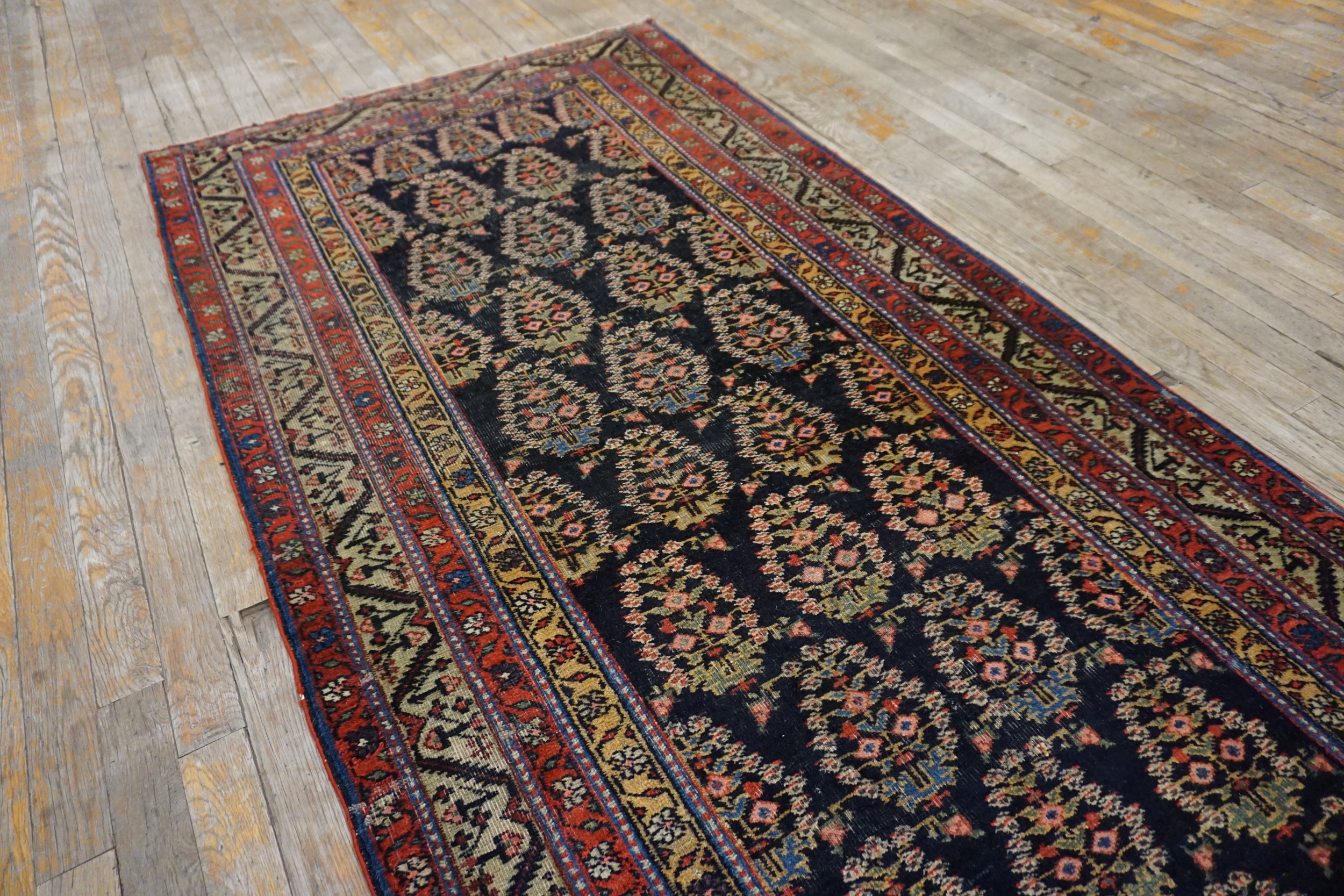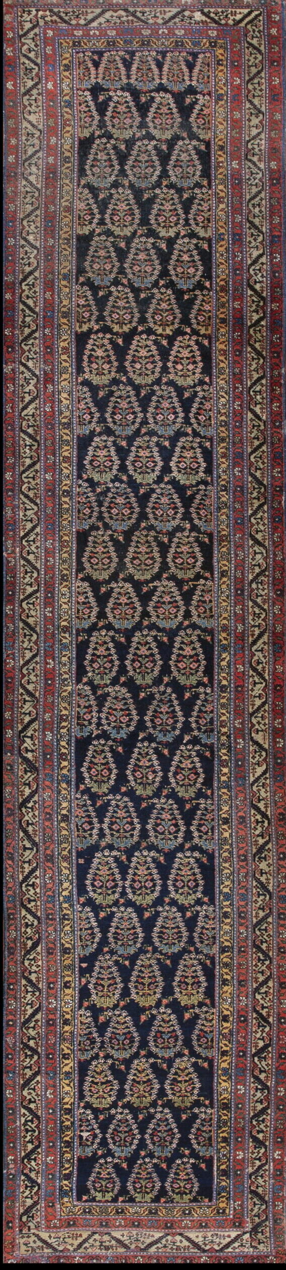 The primary field features a deep indigo or near-black ground, providing a striking contrast for the detailed motifs. This sophisticated use of the blue color palette is characteristic of early 20th-century Persian weaving, offering depth and resilience. The main field employs an allover design where repeating boteh-like floral sprays fill the space without the interruption of a central medallion.