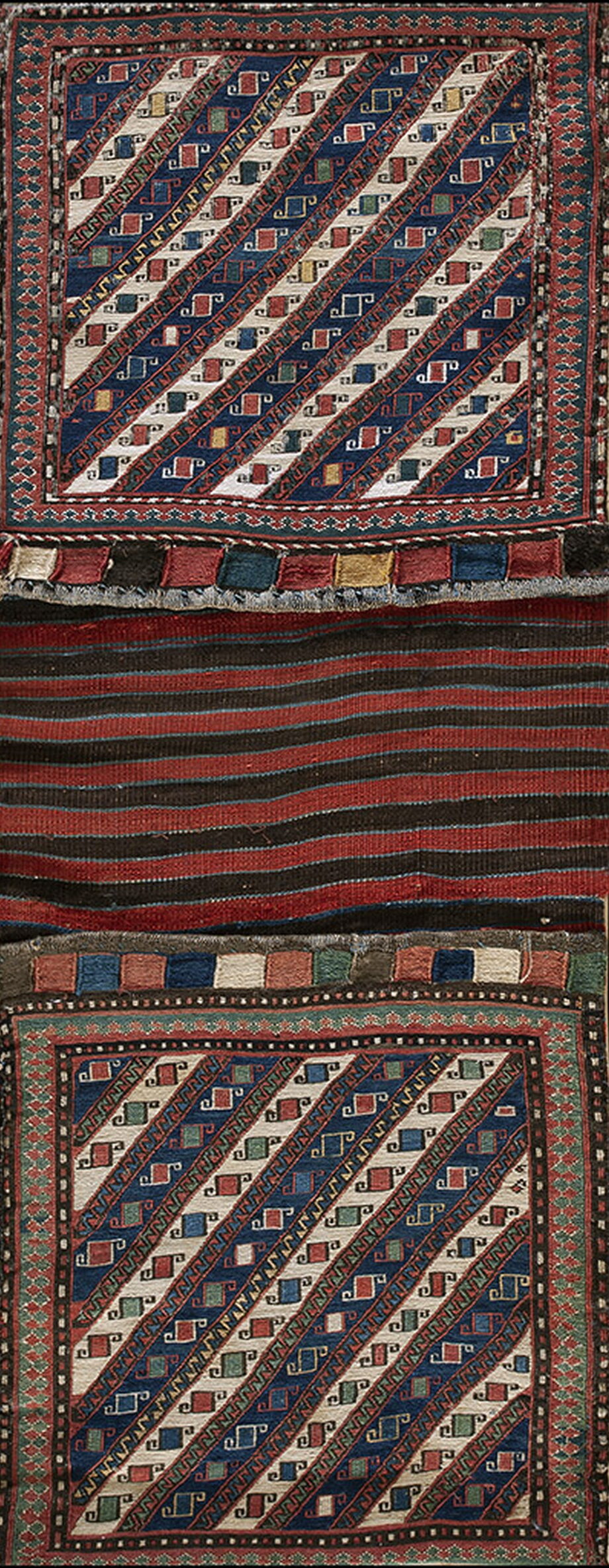 A striking horizontal striped panel, woven in a simpler kilim structure, separates the two main Sumak sections, suggesting this piece was originally intended as a specialized storage bag face or a decorative furnishing panel. Its dimensions classify it as a highly collectible small scatter size, perfect for adding a powerful ethnographic accent to a curated space.