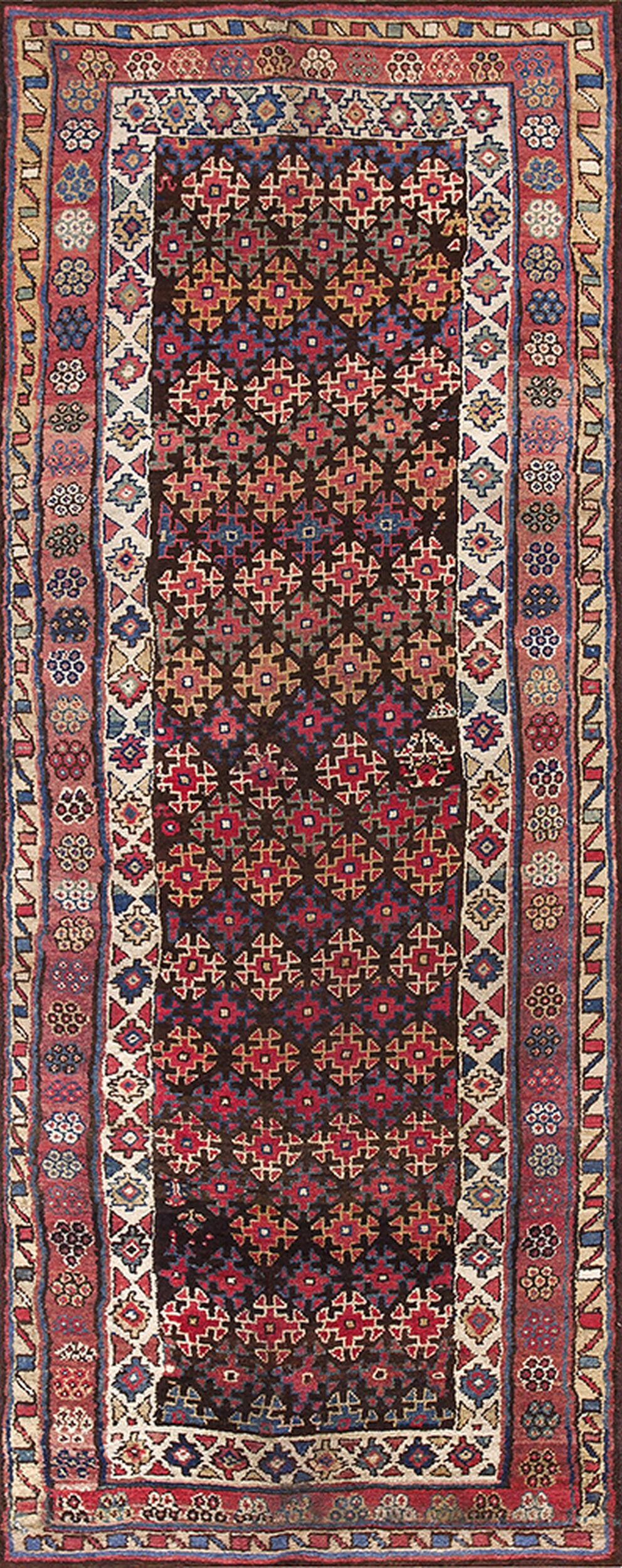 The palette is grounded in rich, dark hues, featuring a dominant field of deep espresso and mahogany. The use of natural dyes creates a stunning depth, allowing vibrant accents of madder red, indigo, and ivory to punctuate the geometric lattice. This specific example is highly sought after for its masterful balance of dark and light tones, placing it firmly within the category of brown earth tone color rugs.
