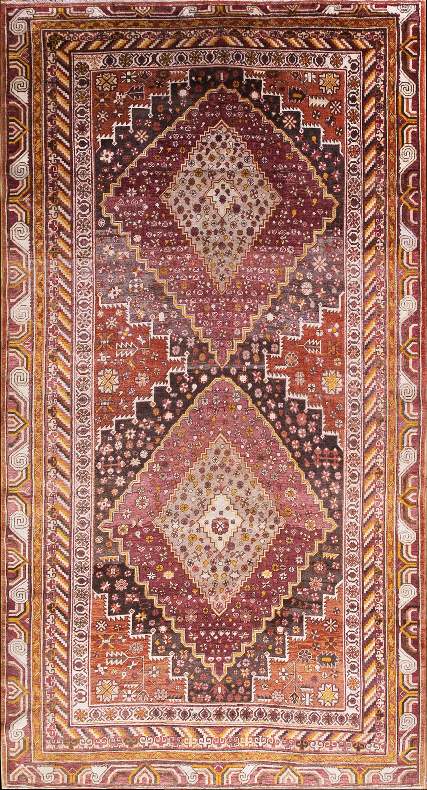 Khotan rugs are renowned for their powerful, large-scale designs. This piece features a striking stepped central medallion framed by intricate minor motifs within the field and border. The overall composition relies on bold, geometric rugs elements, creating a powerful visual impact that is both tribal and highly decorative.