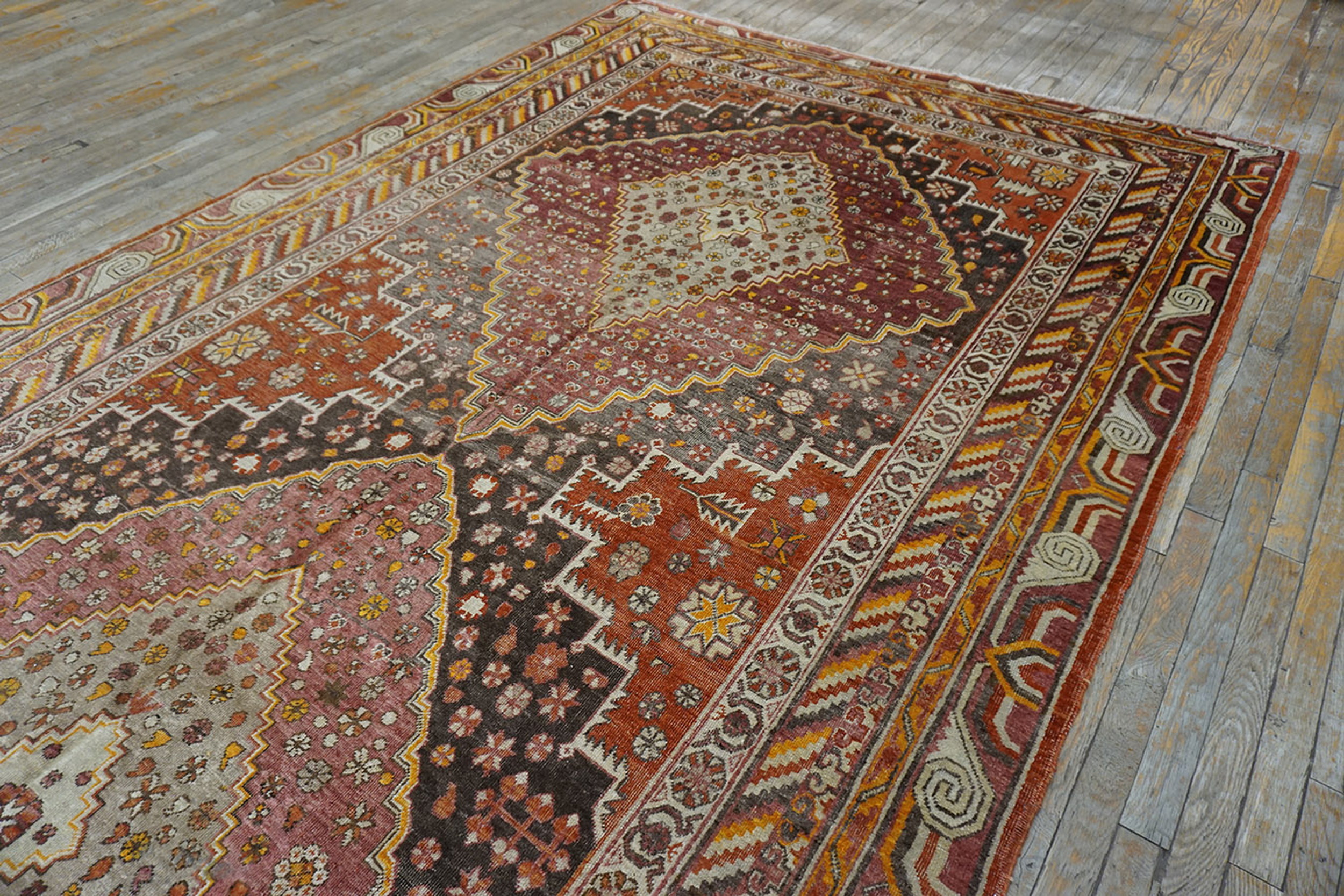 The palette is rich and mature, dominated by deep terracotta and aubergine hues that transition into a sophisticated field of brown earth tone color. The natural dyes have mellowed beautifully over the century, lending the hand-spun wool pile a soft, lustrous sheen that speaks directly to its quality and age.