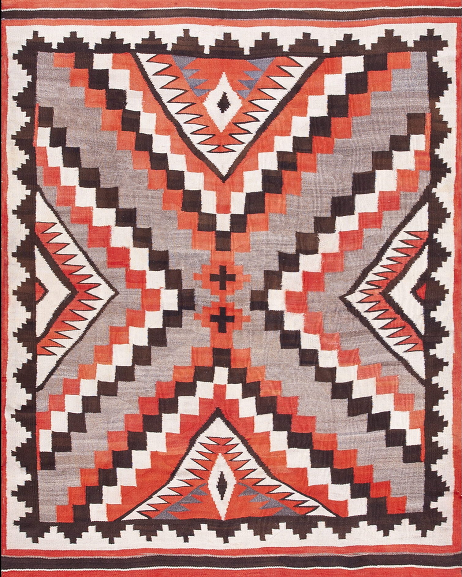 The design is dominated by highly stylized, stepped geometric patterns rendered in a strong, earthy palette of deep terracotta, charcoal, natural white, and heathered gray. The central composition features a monumental, cruciform structure built from interlocking zigzags and serrated edges, characteristic of classic Native American Navajo weaving.