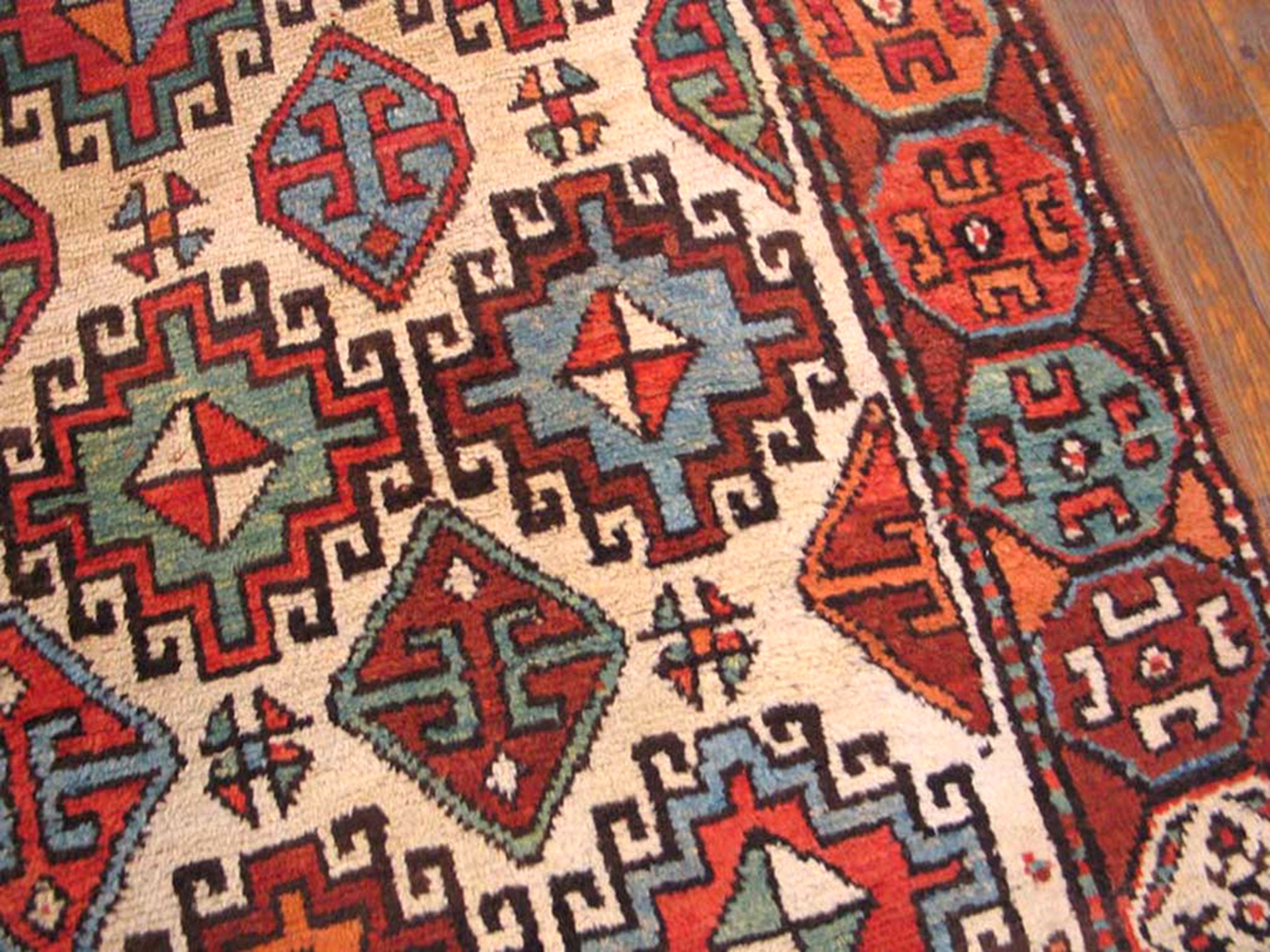 Antique N.W. Persian Persian Ivory 1850s Rug, Circa Date: 1850s. This exceptional piece represents the robust weaving traditions of Northwest Persia during the mid-19th century. The striking contrast of the complex geometric motifs against the luminous ivory ground immediately captures attention, distinguishing it from many contemporaneous pieces that favored deeper, saturated fields.
