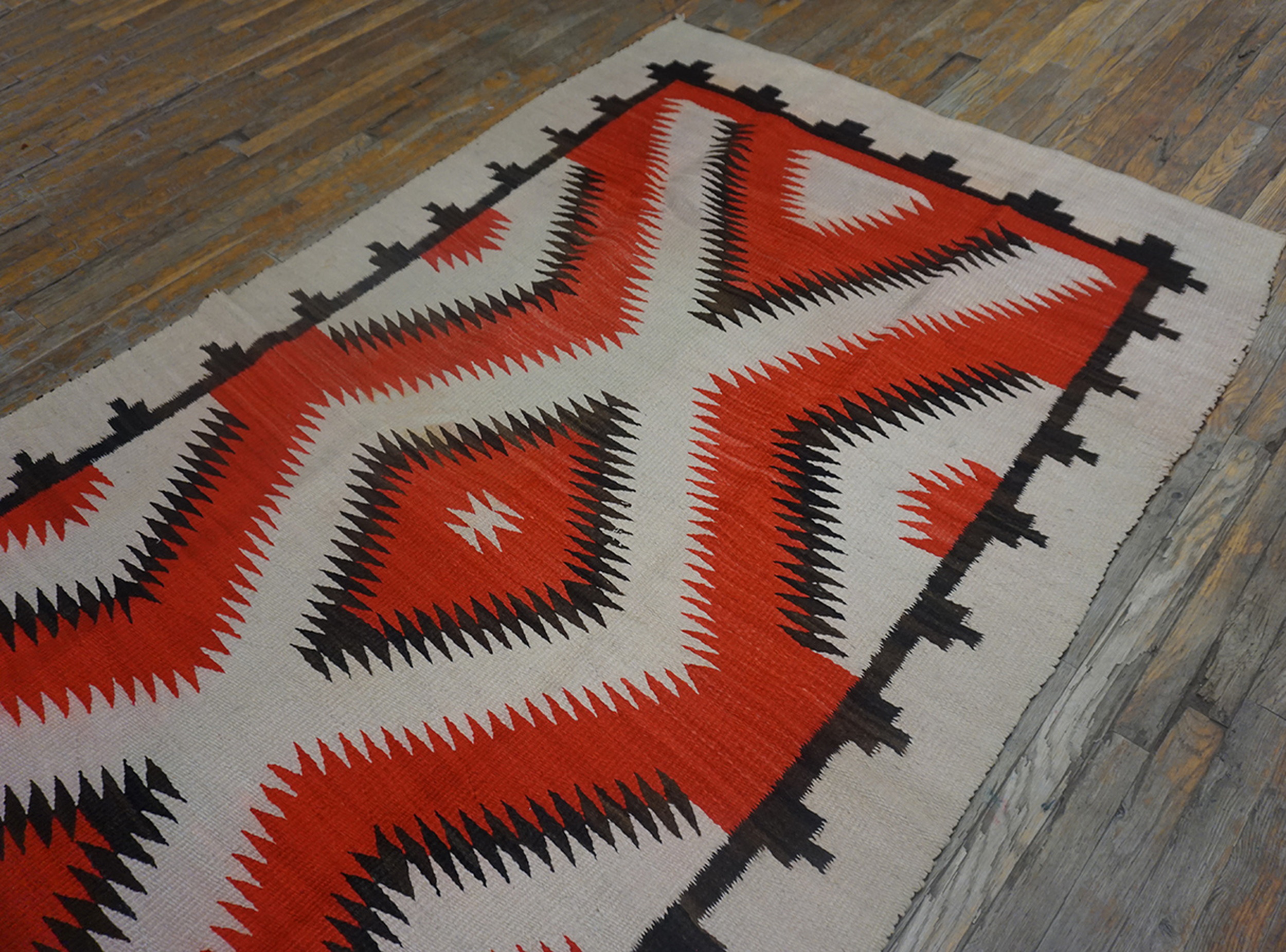 Antique Navajo Hallway Runner Wool Ivory Rug, Circa Date: 1920s. This exceptional weaving represents the peak of early 20th-century American Southwest textile art. Its striking geometric composition, executed in hand-spun wool, makes it a highly desirable example among antique rugs.