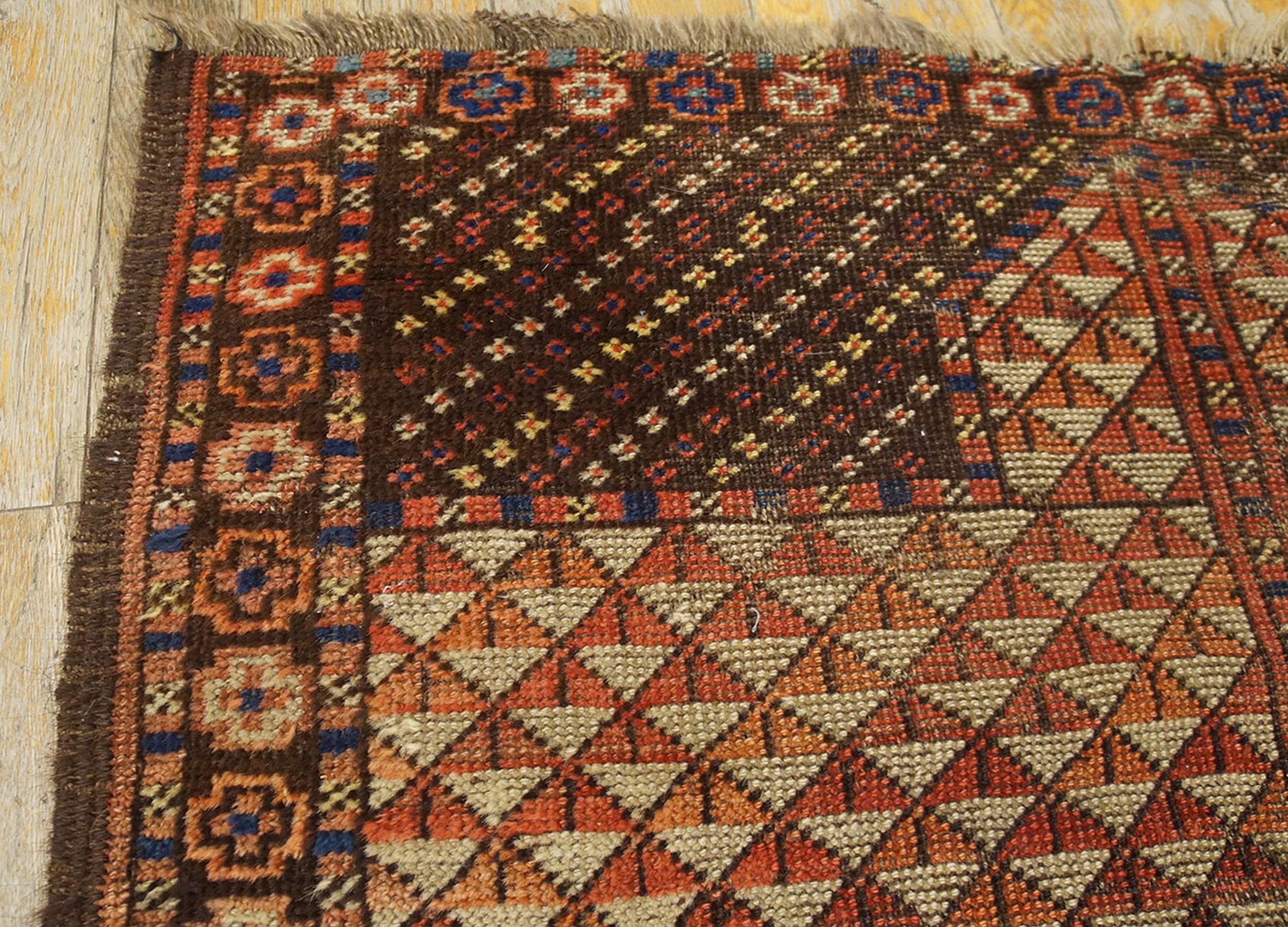 Woven during a period of significant cultural transition, this piece originates from the region of Russia near the Turkmen border, reflecting the complex movement of nomadic groups. The wool is rich and lustrous, utilizing natural dyes that have mellowed beautifully over more than a century, providing depth and variation to the dominant brown and red tones.
