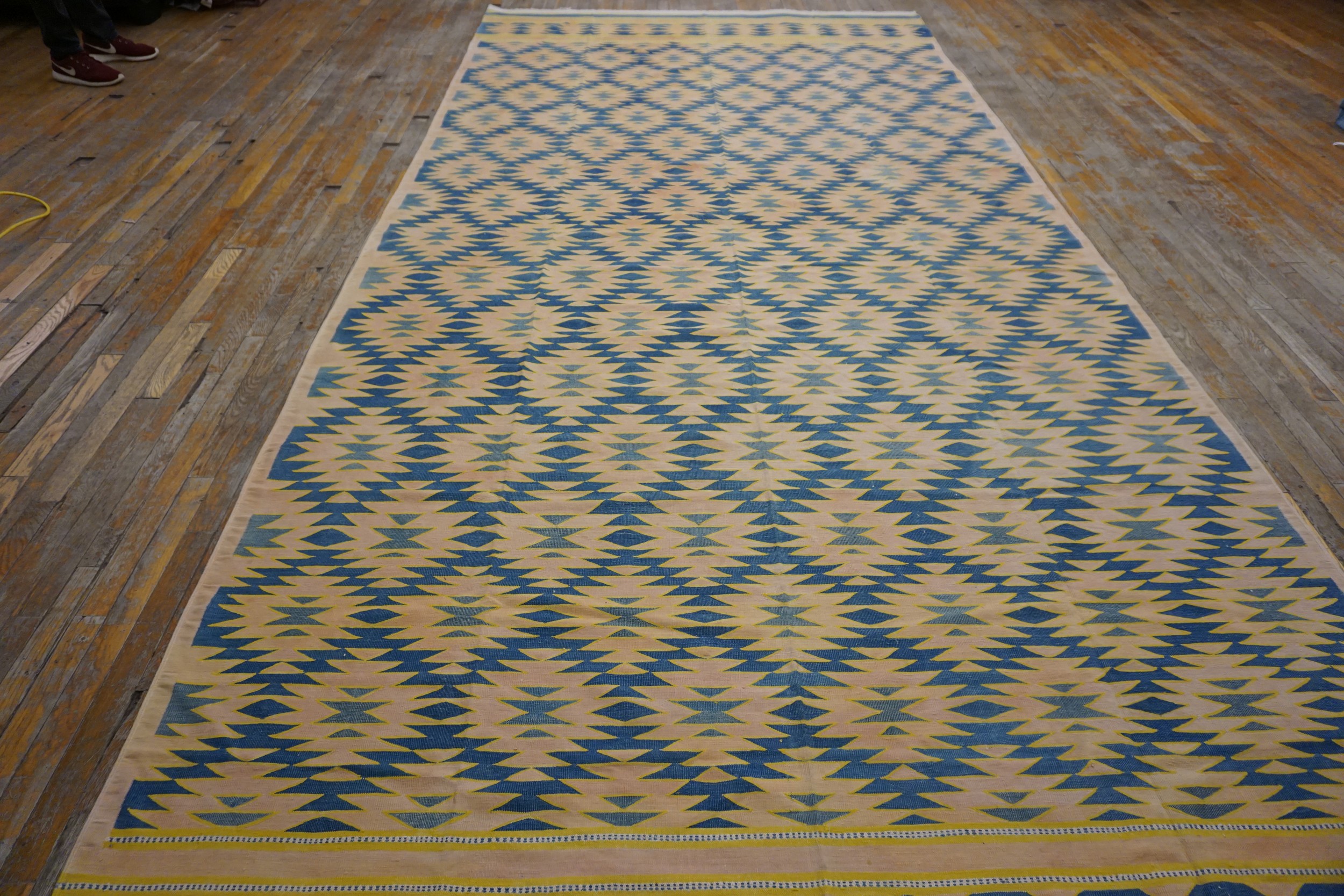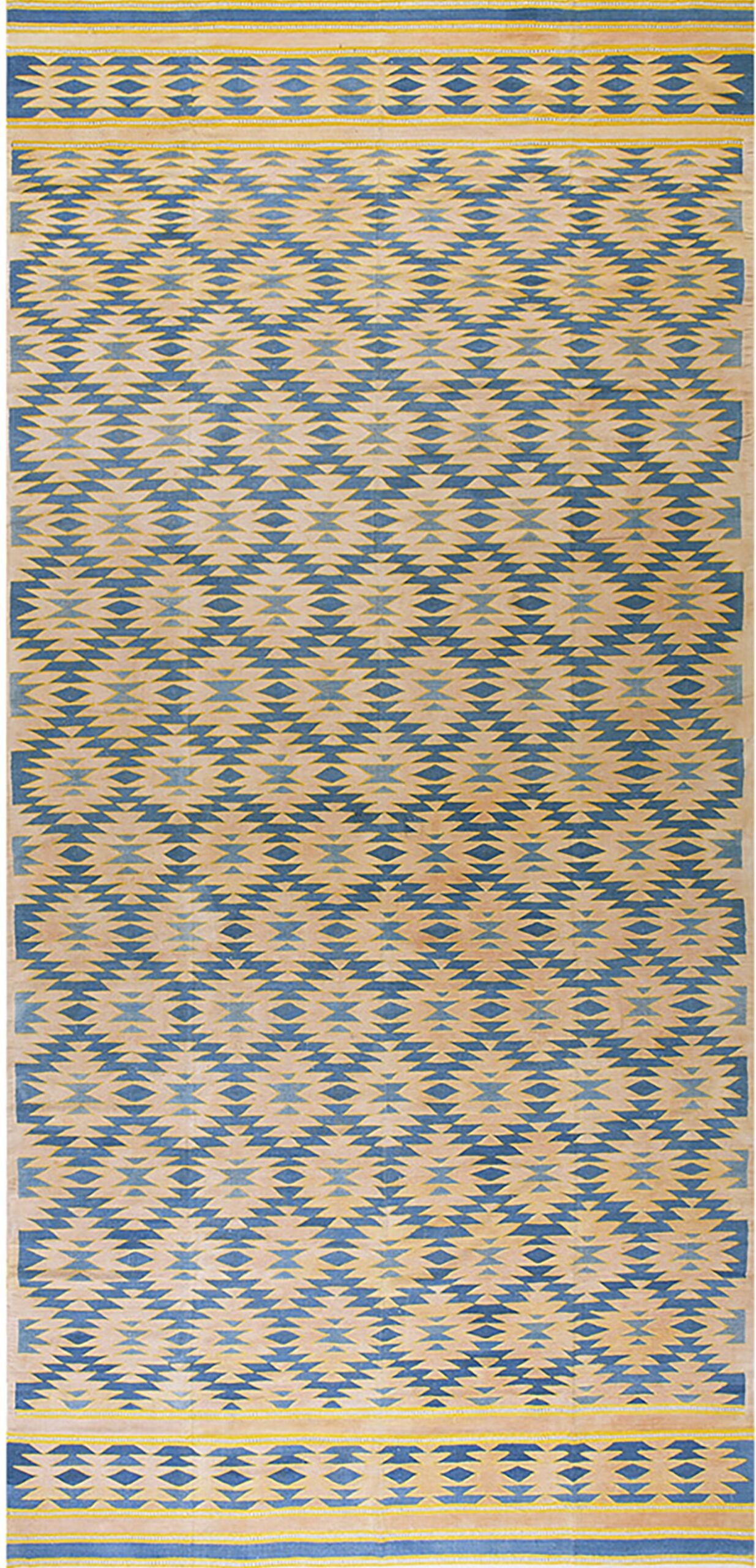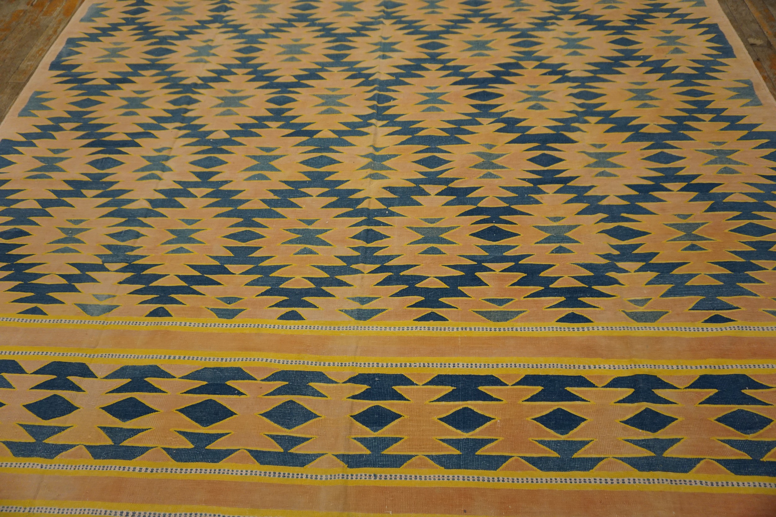 Antique Dhurrie Indian Geometric Blue 1935 Rug, Circa Date: 1935. This striking Indian textile, dating from the mid-1930s, represents a fascinating departure from traditional Mughal or Persian designs, favoring instead a bold, repeating geometric motif. It is a superb example of antique rugs from the Art Deco period, showcasing precision weaving and vibrant coloration.