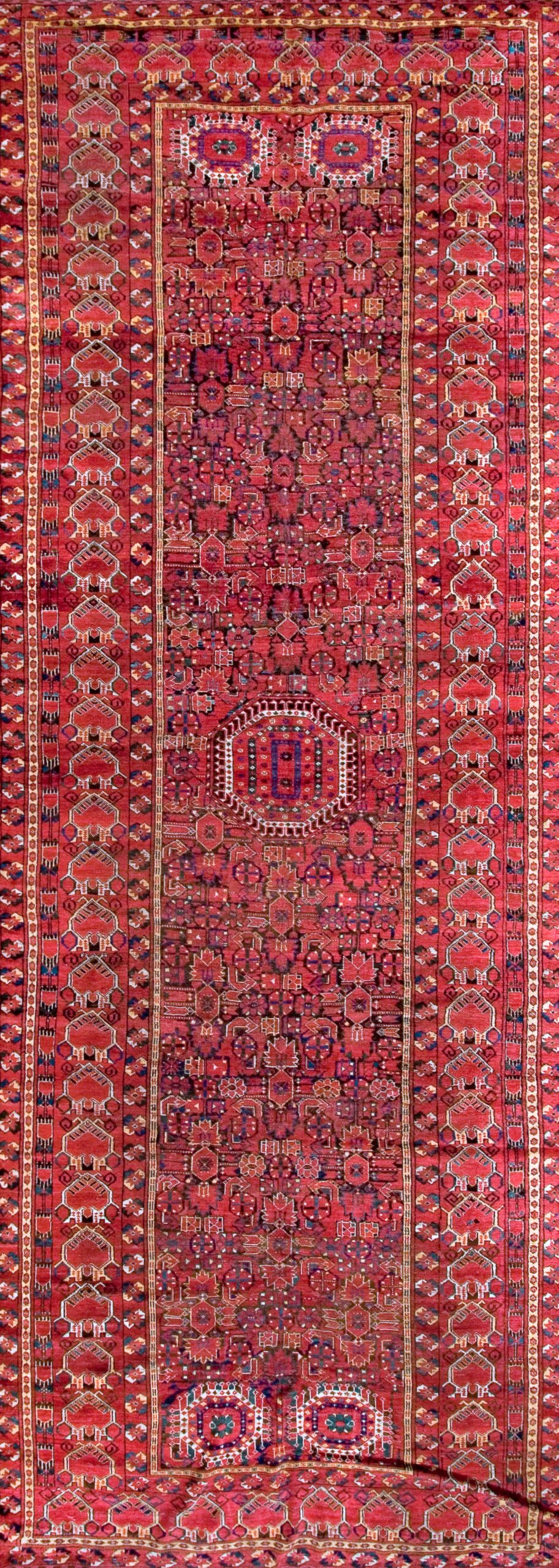 Characteristic of Beshir production, the field employs a dense, geometric allover pattern composed of stylized gul motifs and repeating octagonal elements, framed by multiple intricate borders. This continuous design showcases the weaver’s skill in maximizing visual texture and complexity within the confines of the loom.