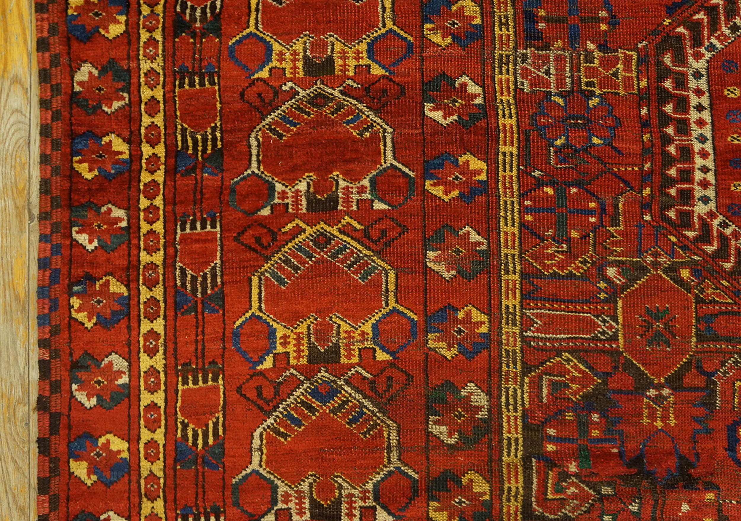 Antique Large Ersari – Beshir Russia Knotted Rug, Circa Date: 1880s. This exceptional Central Asian weaving represents the peak of Beshir tribal artistry, a sub-group of the Ersari Turkmen. The deep, saturated madder field and complex, highly detailed structure mark it as a truly museum-worthy piece among antique rugs.