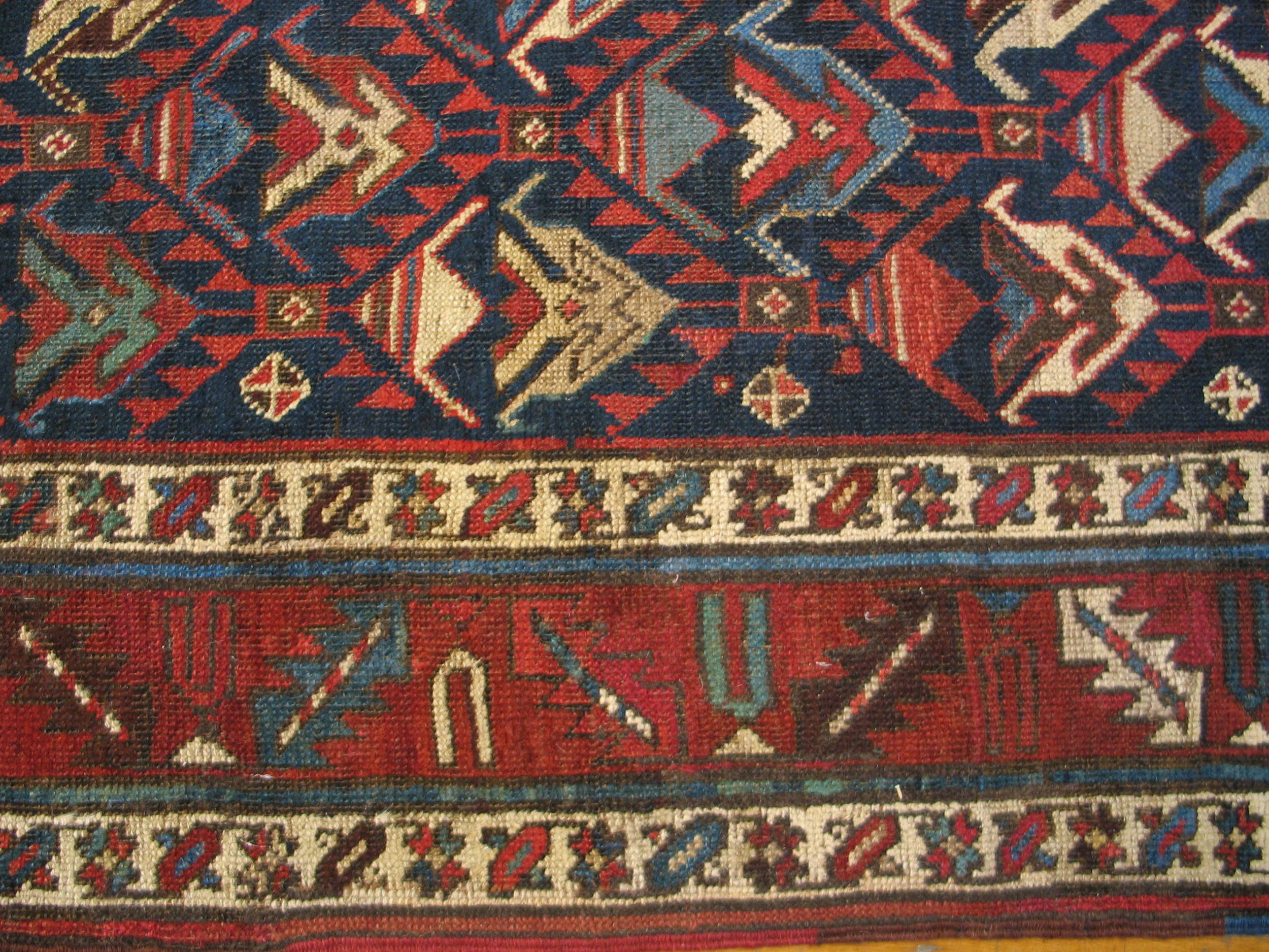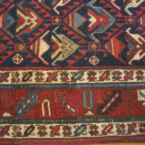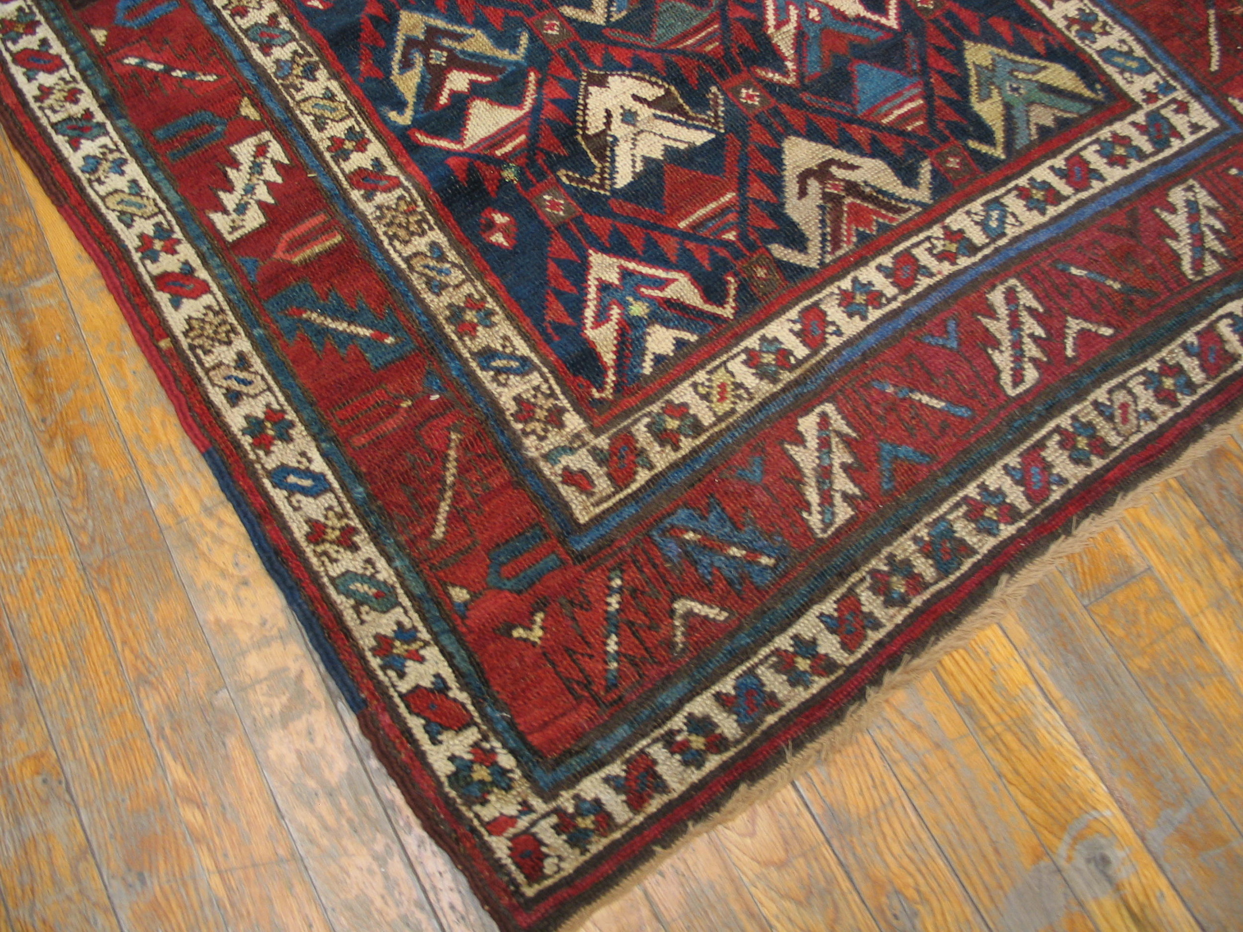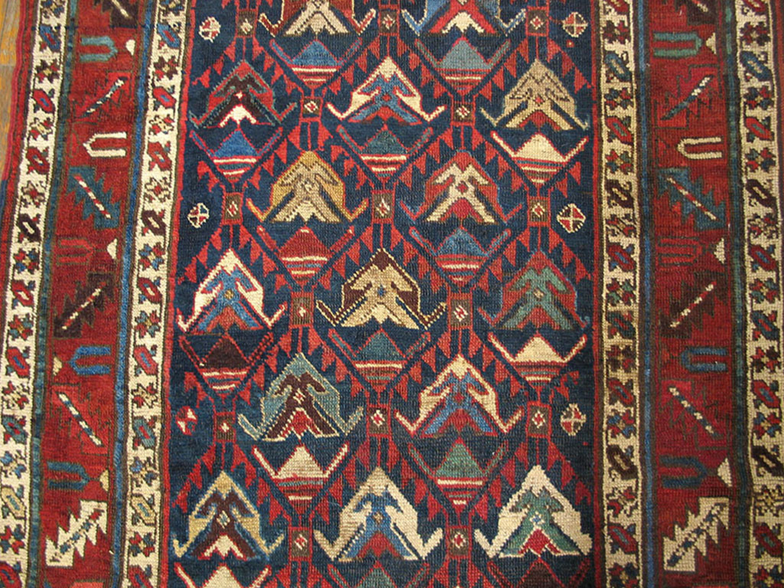 Antique Caucasian Caucasian Blue 1890s Rug, Circa Date: 1890s. This exceptional example of a Caucasian weaving tradition showcases the robust, highly stylized geometry characteristic of the region’s finest nomadic production.
