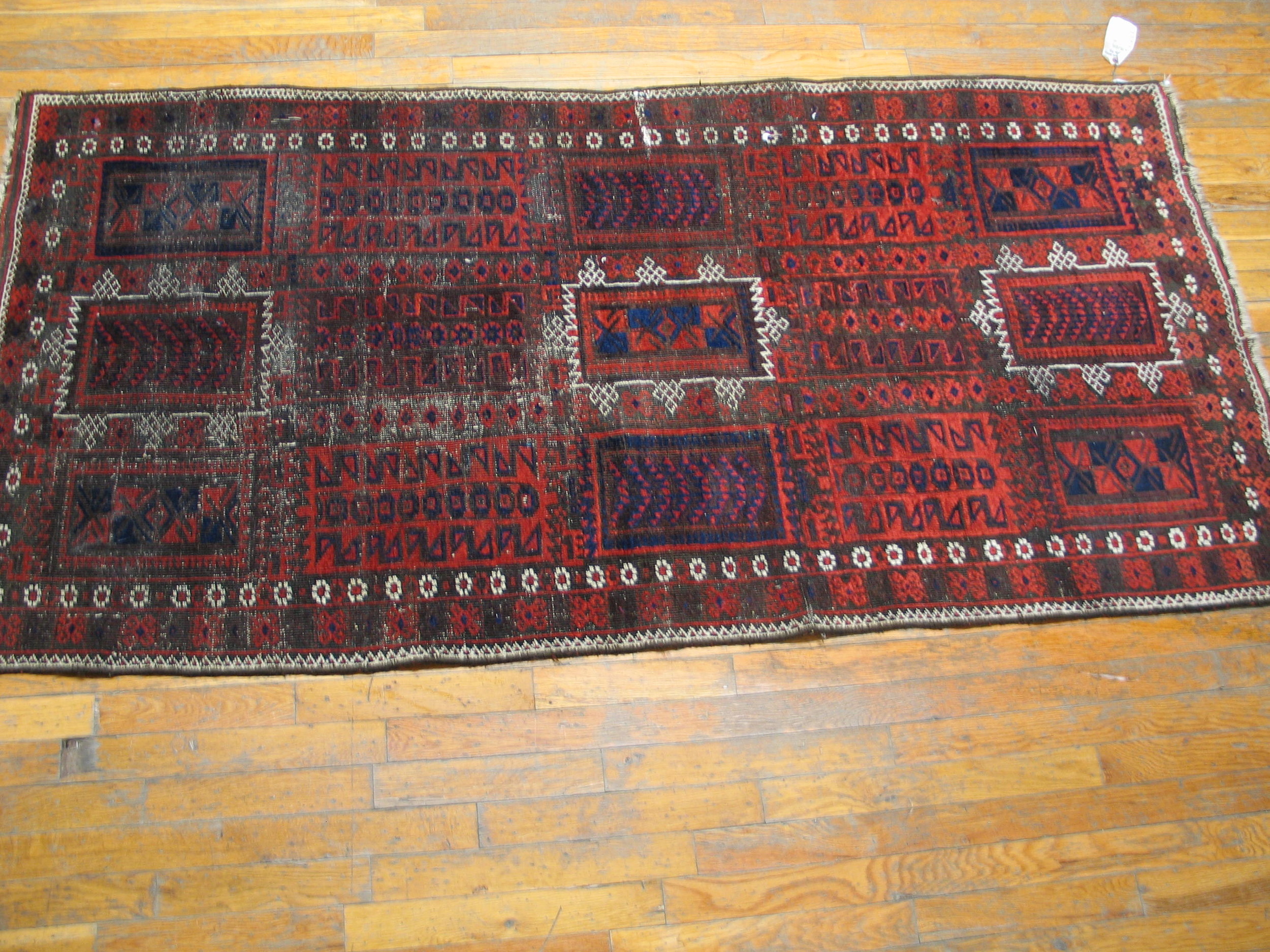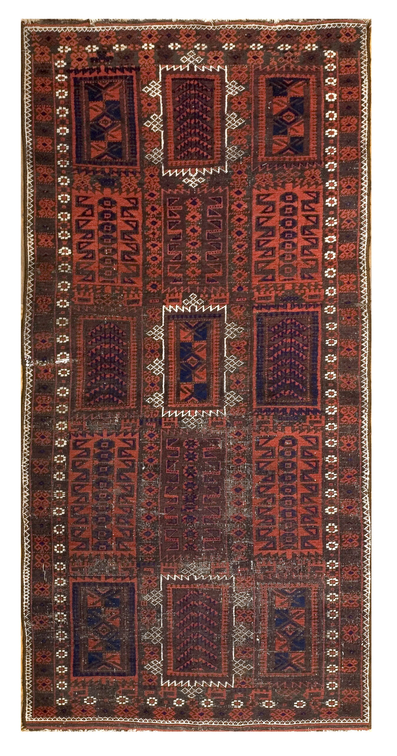 Antique Baluch Small Scatter Size Wool Rug, Country of Origin: Iran / Persia, Circa Date: 1930s. This exceptional tribal weaving represents the finest traditions of the Baluch people, renowned for their deeply saturated dyes and resilient wool. The rug’s dimensions place it firmly within the small scatter size category, making it an ideal accent piece for hallways or intimate spaces.