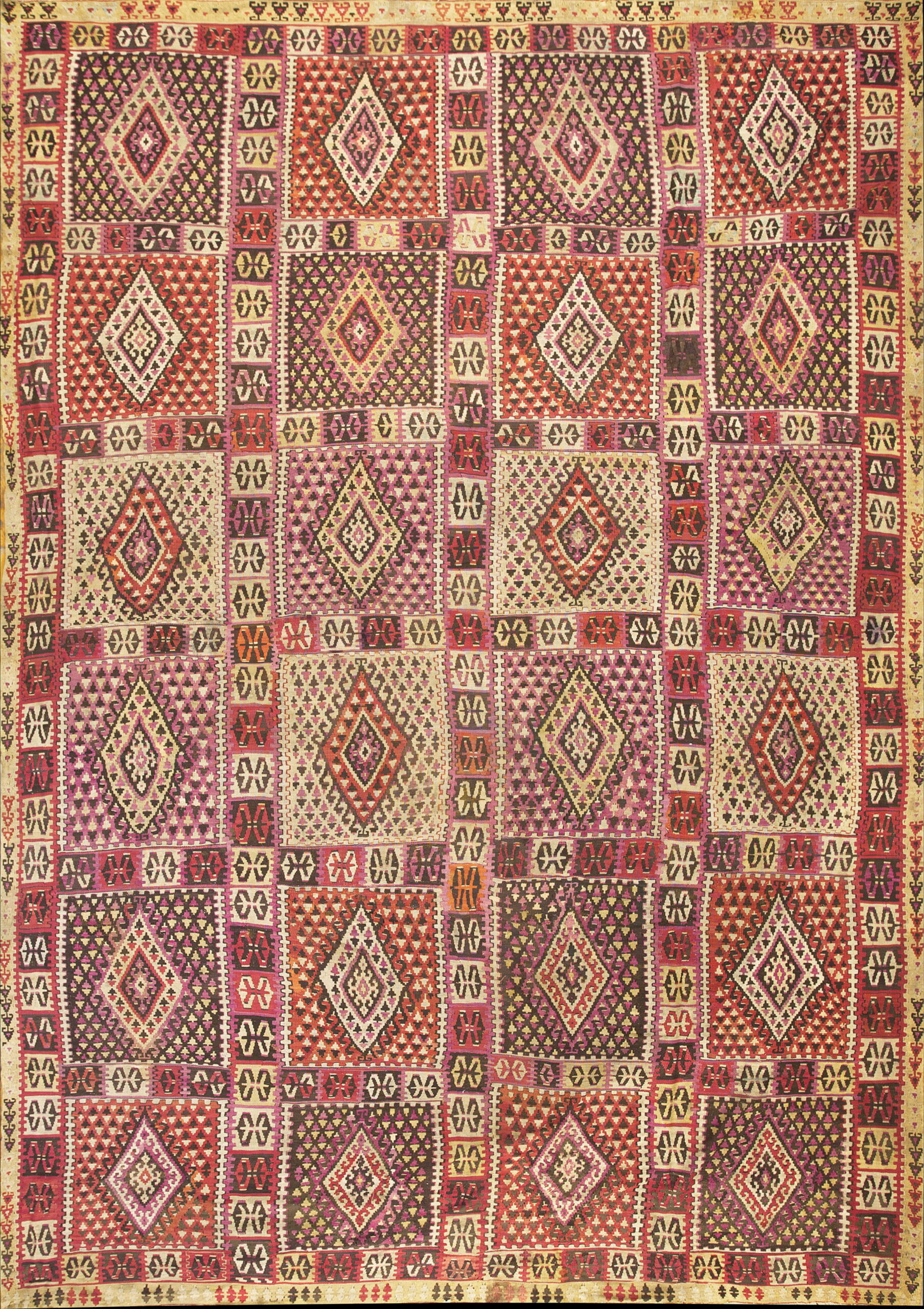 The design features a striking grid structure composed of repeating squares, each containing a prominent central diamond medallion. This highly organized, repeating structure creates a dynamic allover rug pattern, characteristic of nomadic and village weaving traditions, offering visual interest without relying on a central focal point.