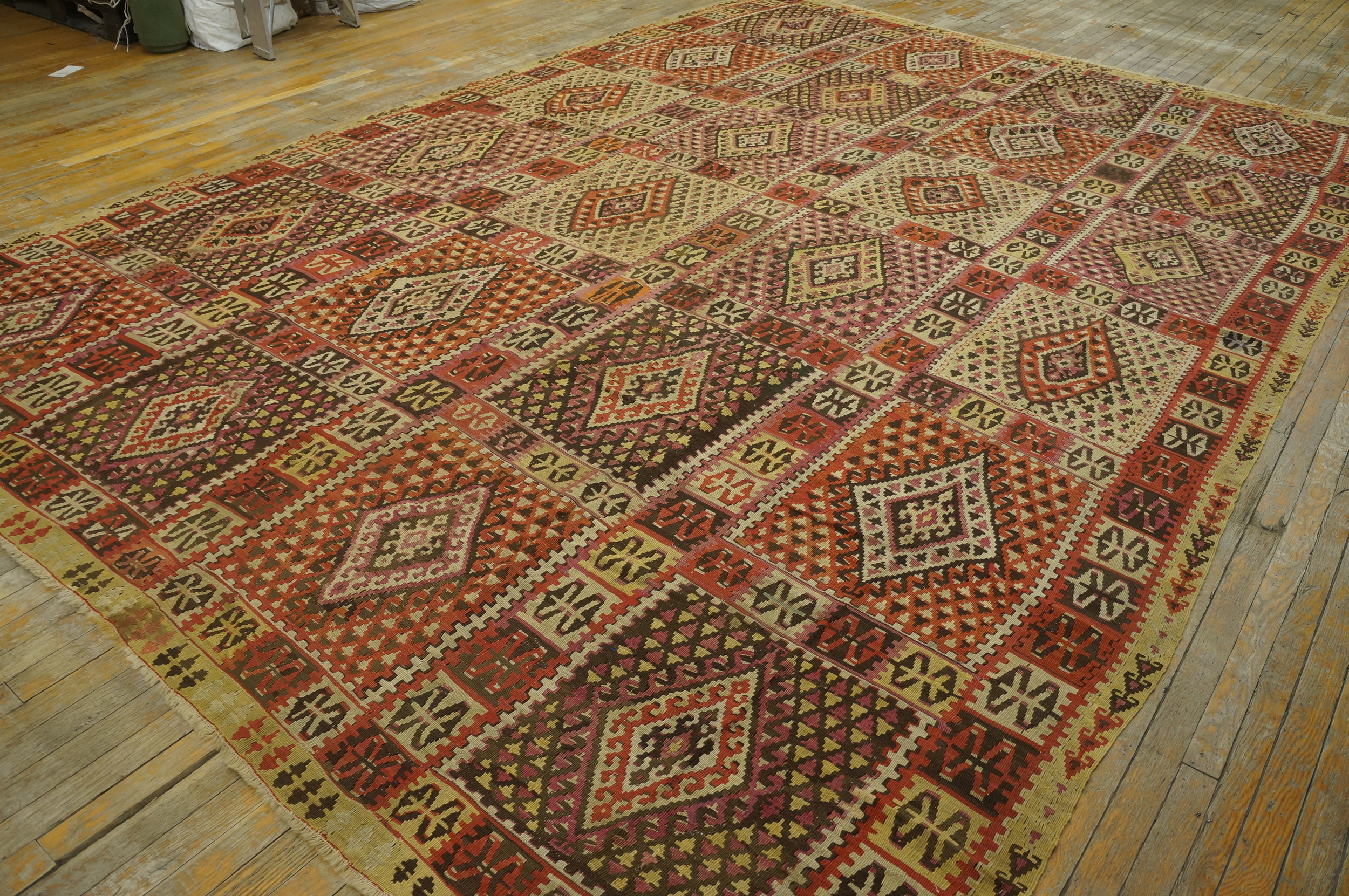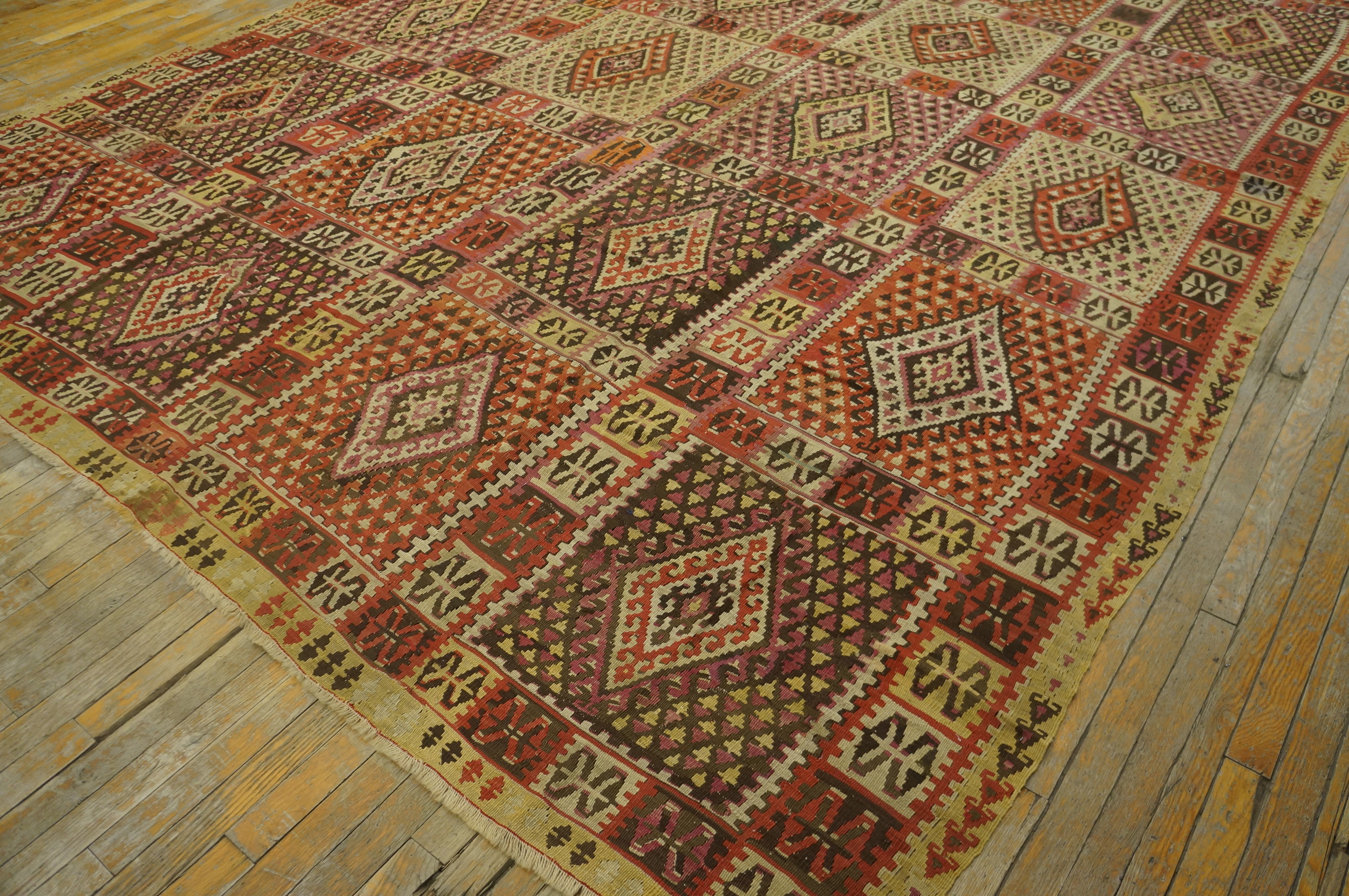 Antique Kilim – Oushak Turkish Multicolor 1890s Rug, Circa Date: 1890s. This exceptional textile is a masterful example of a traditional Turkish flat woven kilim, originating from the Oushak region. The sophisticated execution of the weaving technique speaks to the high level of craftsmanship prevalent in the late 19th century.