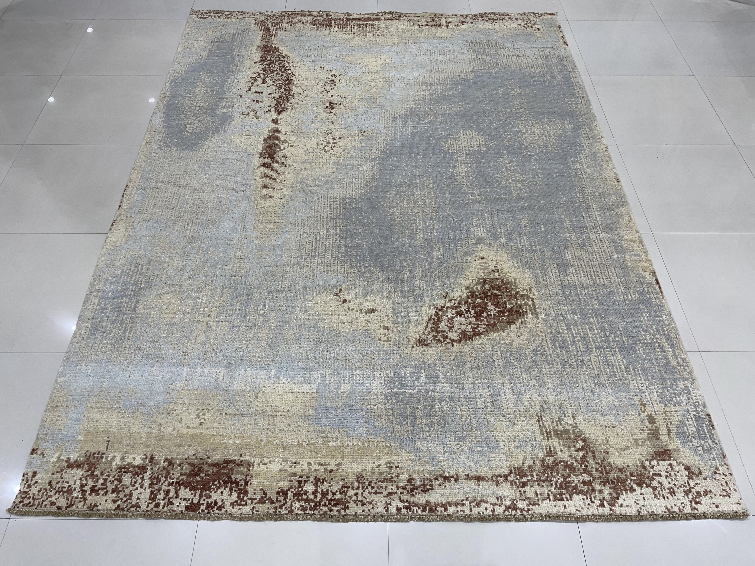 Accents of deep rust and terracotta anchor the edges of the composition, providing necessary contrast against the cooler palette and preventing the design from feeling monochromatic. While perfect as a central living room piece, the versatile dimensions and durable construction also make it suitable for high-traffic areas, or even as an elegant selection among hallway runner rugs in larger formats.
