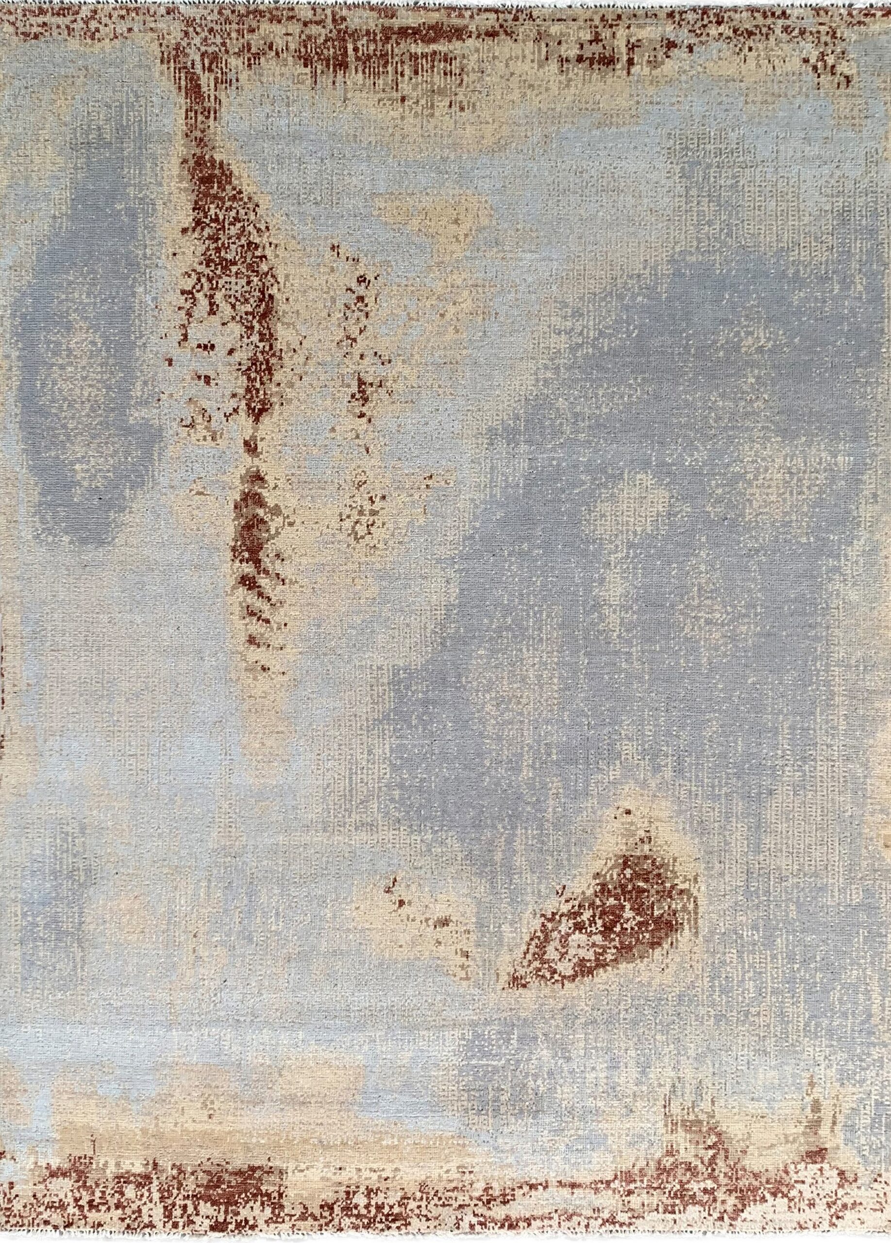 The design evokes a sense of atmospheric depth, utilizing a sophisticated interplay of texture and tone. Soft, ethereal fields of cream and beige are overlaid with muted blue-gray washes, creating a dynamic, cloud-like effect. The subtle shifts in pile height enhance the visual movement across the surface, making this an ideal selection for those seeking gray color rugs that serve as artistic focal points.