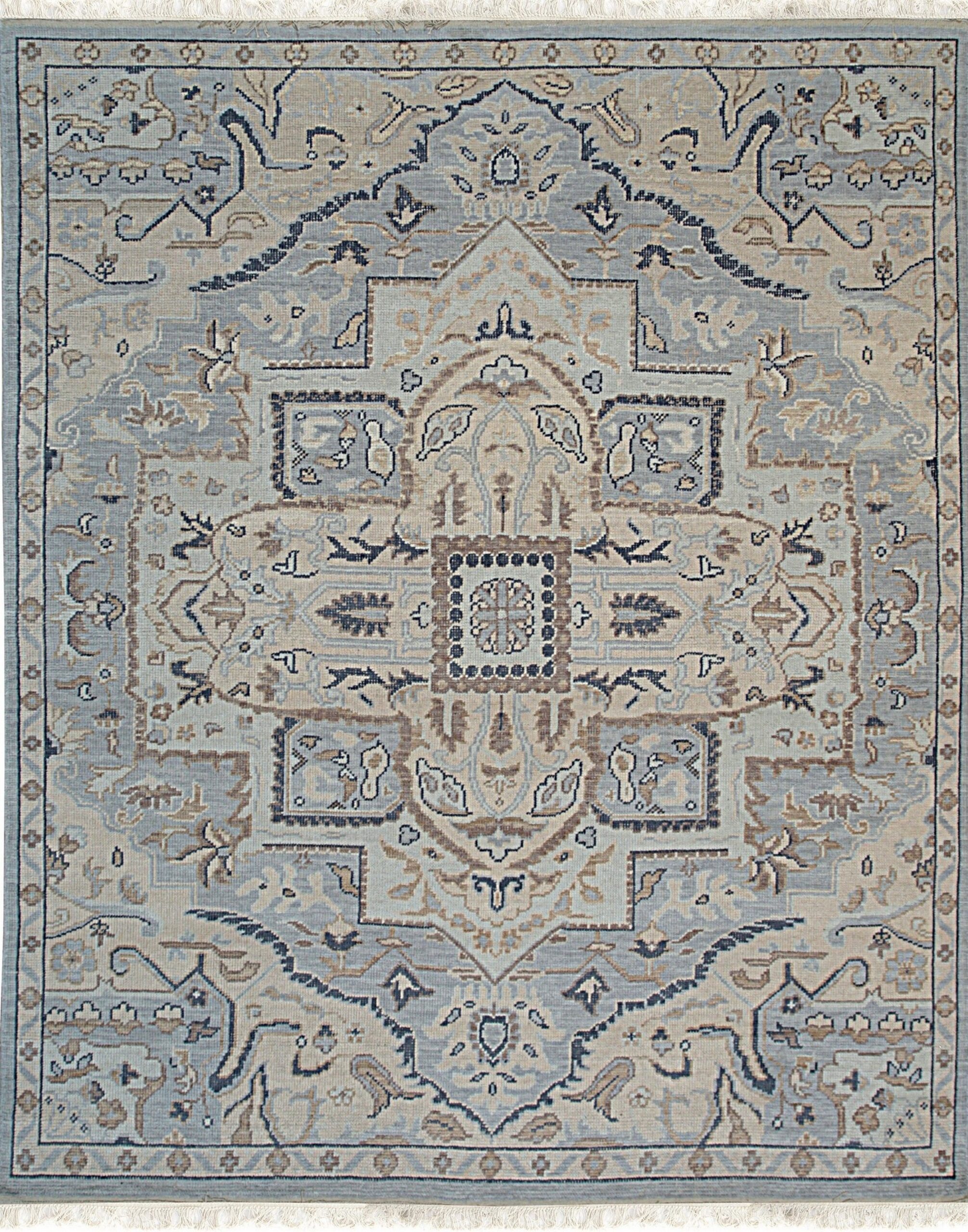 The central design features a complex, oversized medallion rendered in neutral tones of cream and taupe, providing a striking contrast to the cool field color. This interpretation of classical Oriental patterns is characteristic of fine Indian rugs, where ancient weaving techniques meet modern color sensibilities.