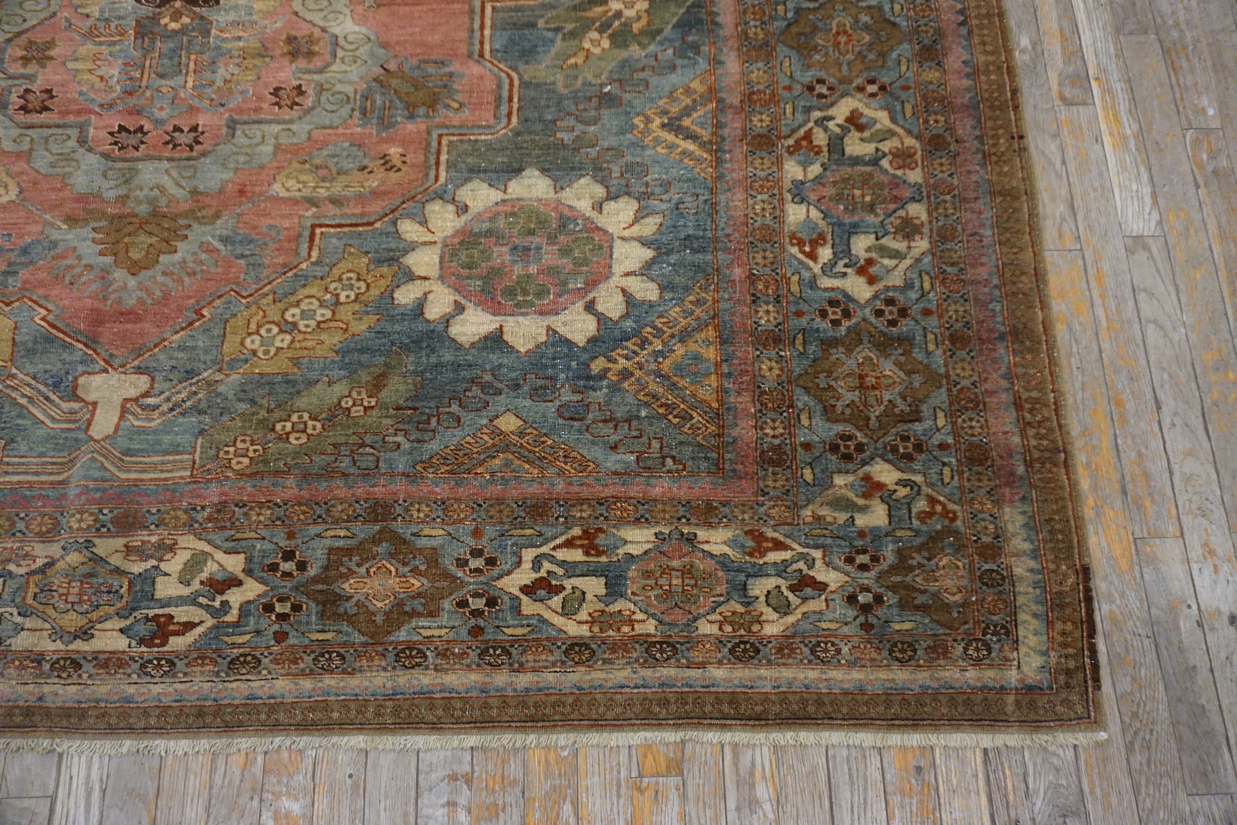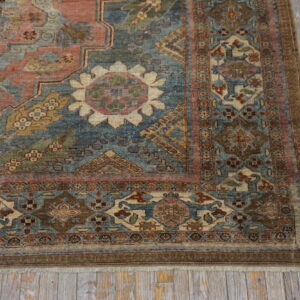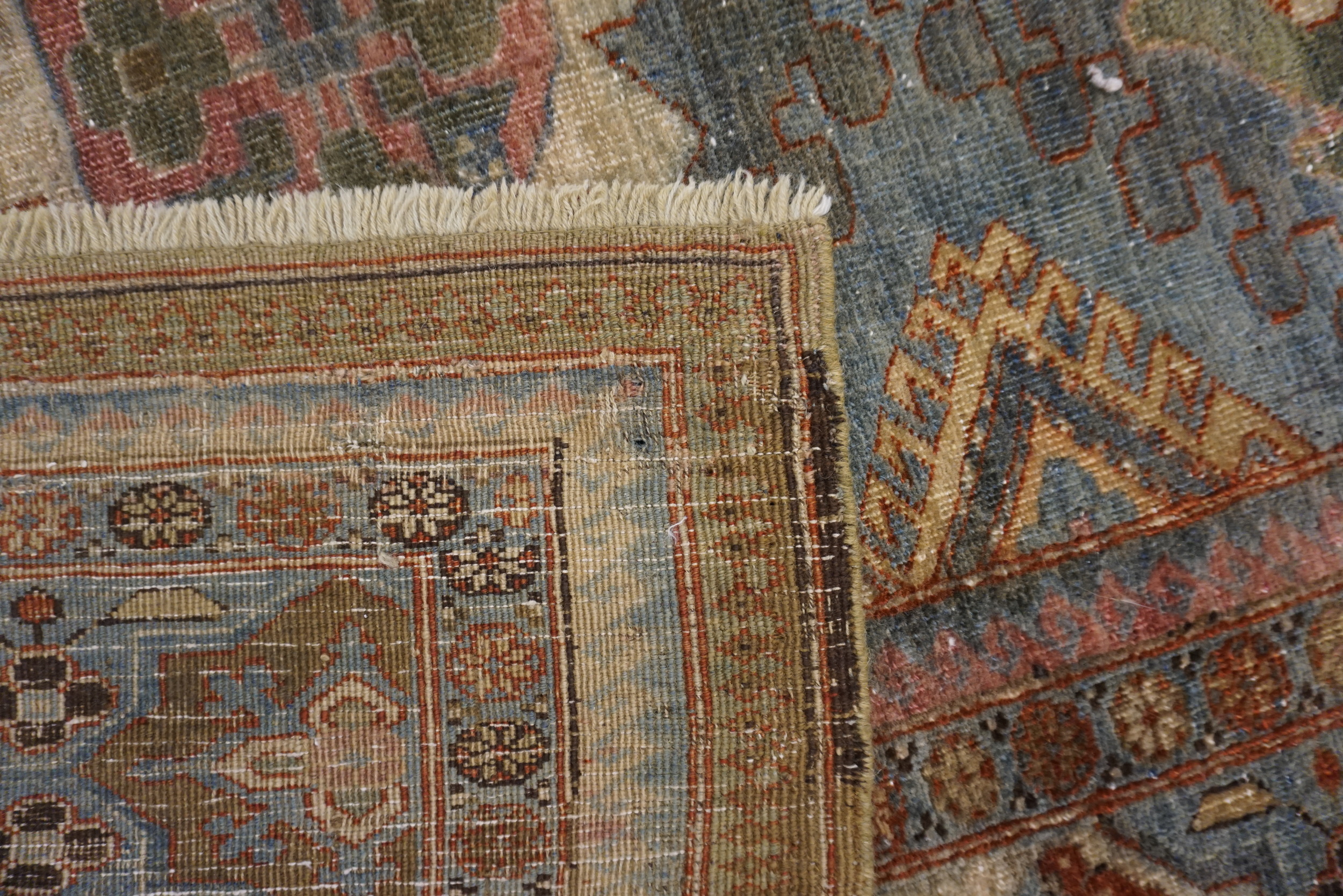 A series of complex borders surrounds the central composition, featuring repeating geometric devices, stylized animal forms, and reciprocal trefoil patterns. These detailed guard borders utilize cream, terracotta, and khaki tones to anchor the vibrant central palette, demonstrating the weaver’s masterful control over both scale and color balance.