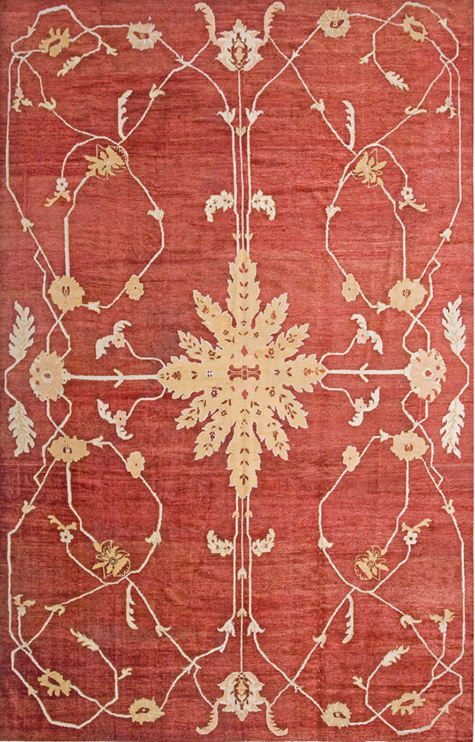 The field is dominated by a rich, variegated tone of salmon and rust, achieving a depth of color only possible through natural dyes. This vibrant, yet muted, coral color provides a stunning backdrop for the lighter, ivory-toned motifs that traverse the surface, creating a visual warmth that defines the piece.