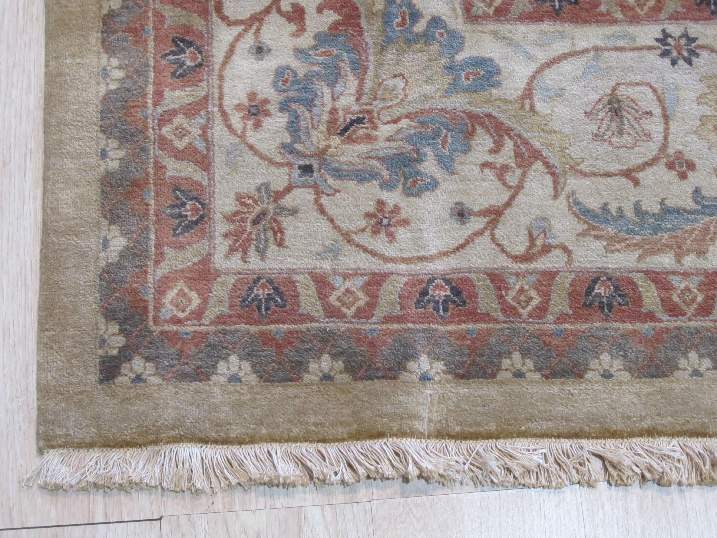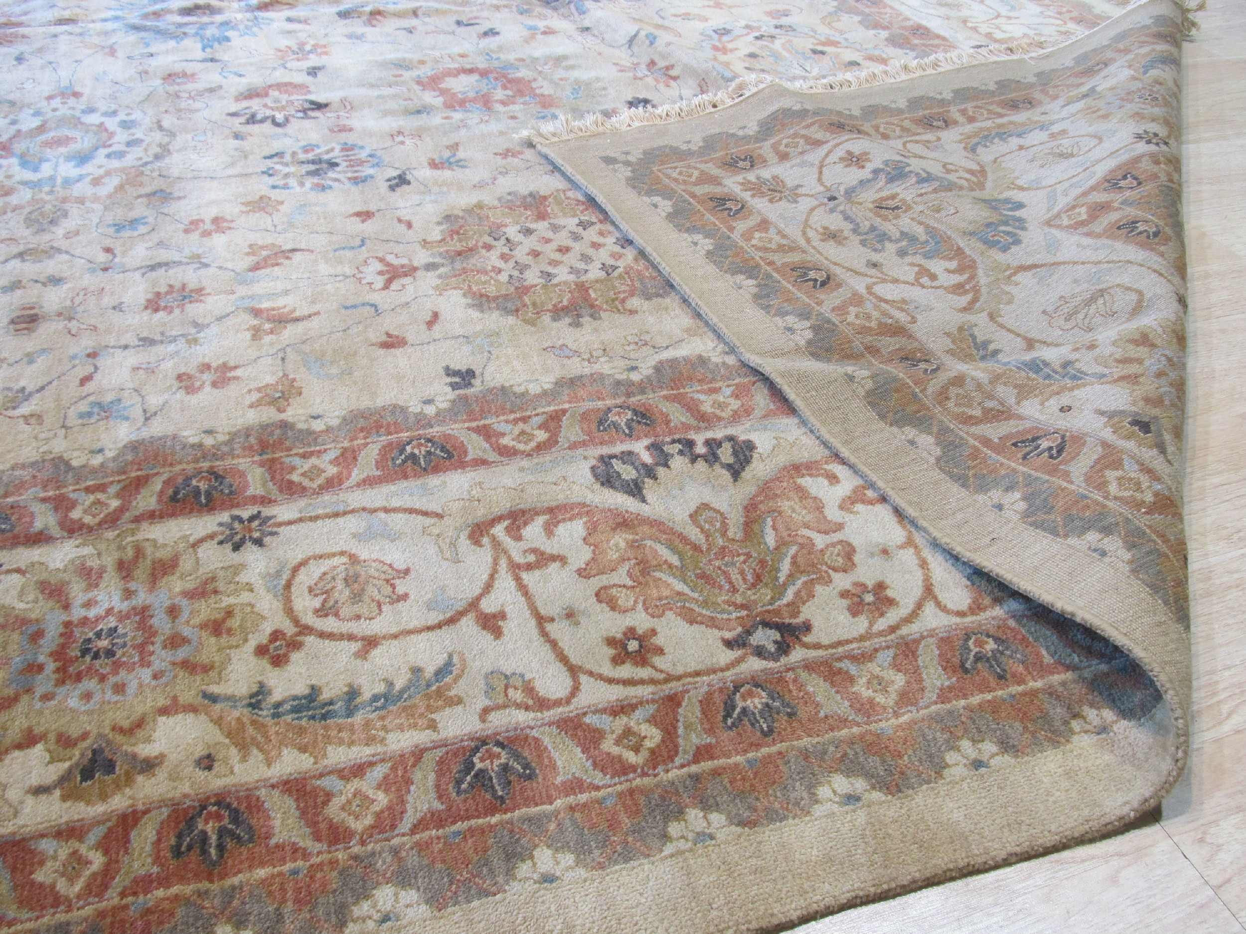 The primary field color is a warm, nuanced beige, placing it perfectly within the category of ivory beige cream white color rugs. This neutral foundation allows the intricate design elements?composed of subtle terracotta, slate blue, and pale gold accents?to emerge without overwhelming the space. The soft palette provides an atmosphere of quiet elegance and restraint, complementing diverse decor schemes.