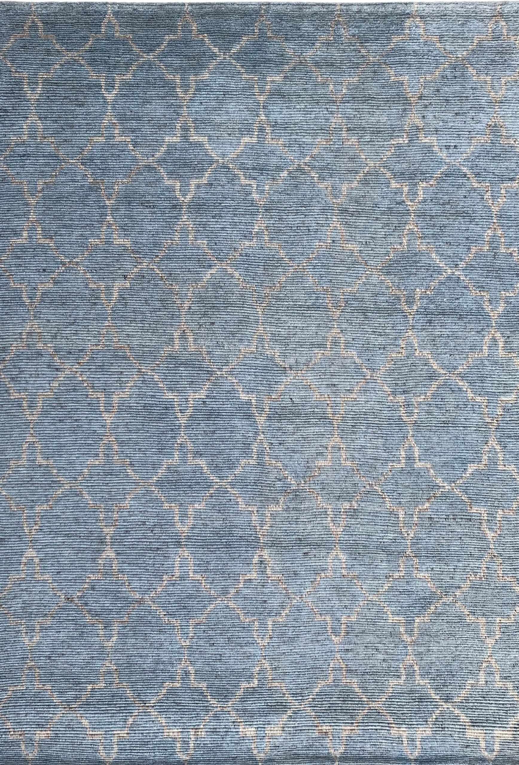 The design utilizes a repeating, all-over trellis pattern rendered in a contrasting pale neutral tone. This geometric motif provides visual structure without overwhelming a modern space, making it a highly desirable addition among our new area rugs selections, perfectly balancing tradition and contemporary style.