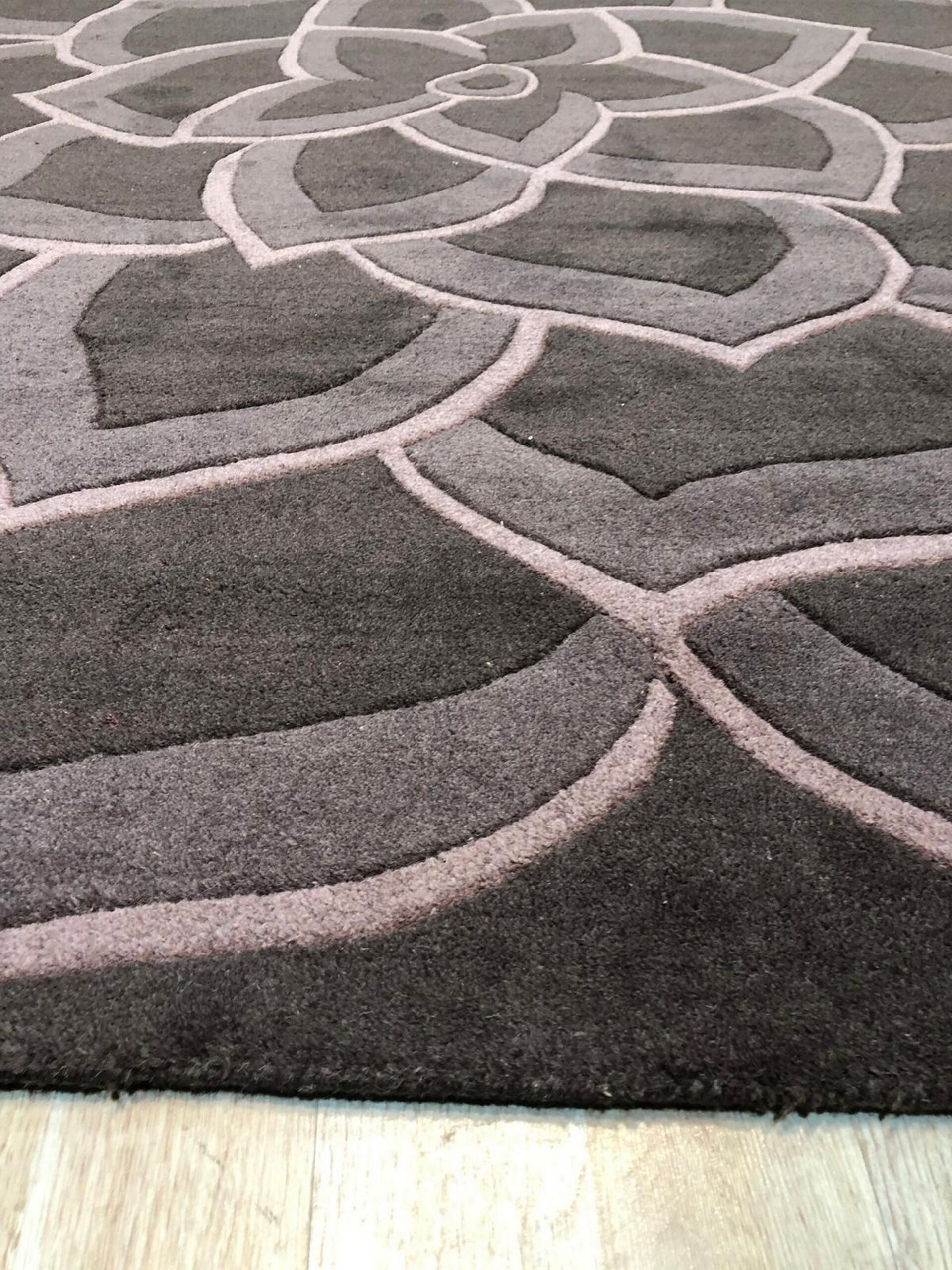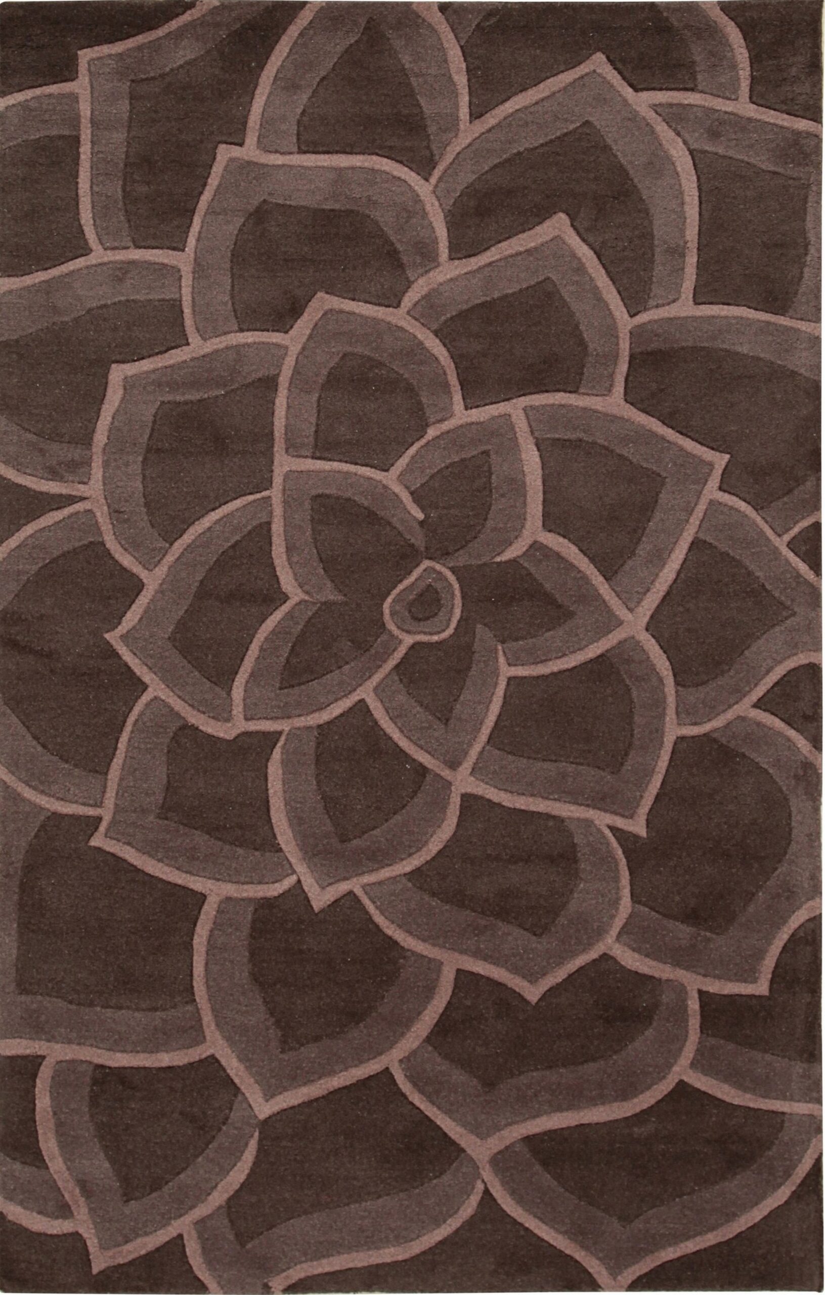 The bold, large-scale design features concentric, stylized petals that create a compelling sense of movement across the surface. Executed through precise hand-tufting, the pattern is visually enhanced by the varying pile heights, which lend a three-dimensional, carved effect to the dense wool foundation. This textural depth elevates the rug beyond simple floor covering.