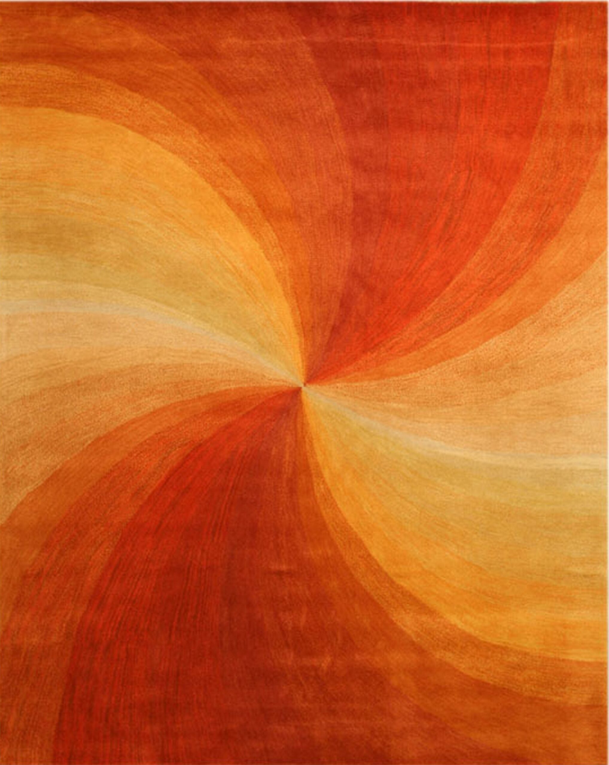 Versatile Sleek Orange Hand Tufted Wool Rug, Country of Origin: India. This striking piece offers a dynamic, abstract composition, moving away from traditional motifs toward pure kinetic energy. Its bold, swirling pattern creates an optical illusion of movement, making it an exceptional choice among new area rugs designed for contemporary interiors seeking warmth and visual drama.