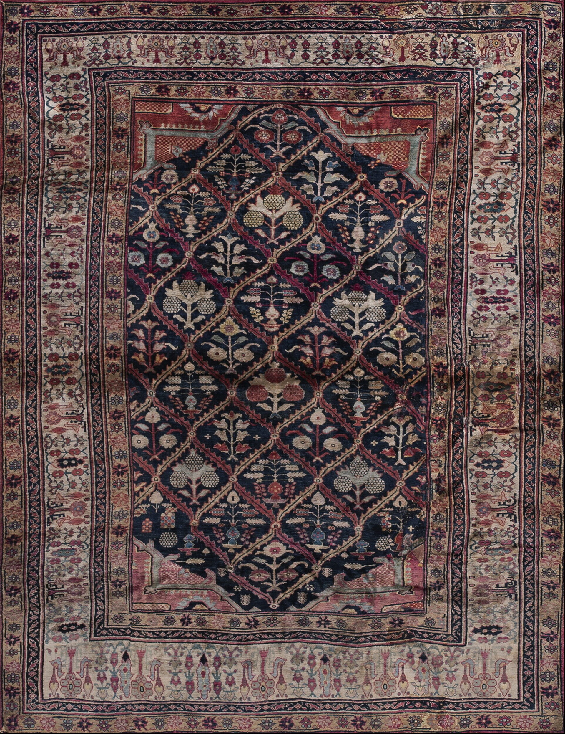 The field is dominated by a rich, saturated indigo, providing a dramatic backdrop for the repeating trellis pattern. This deep foundation enhances the subtle shifts in the secondary colors—muted rose, cream, and pale gold—which define the stylized boteh and floral motifs. The overall effect is a mesmerizing depth of tone characteristic of the finest natural dyes found in blue color rugs from this period.
