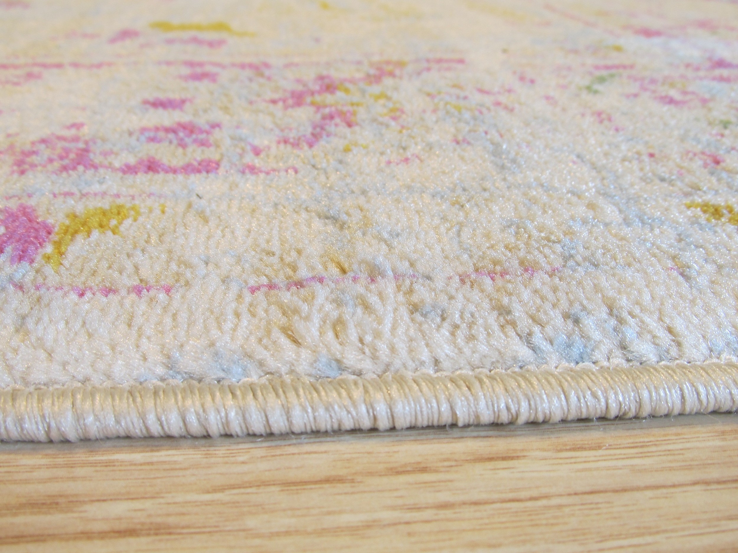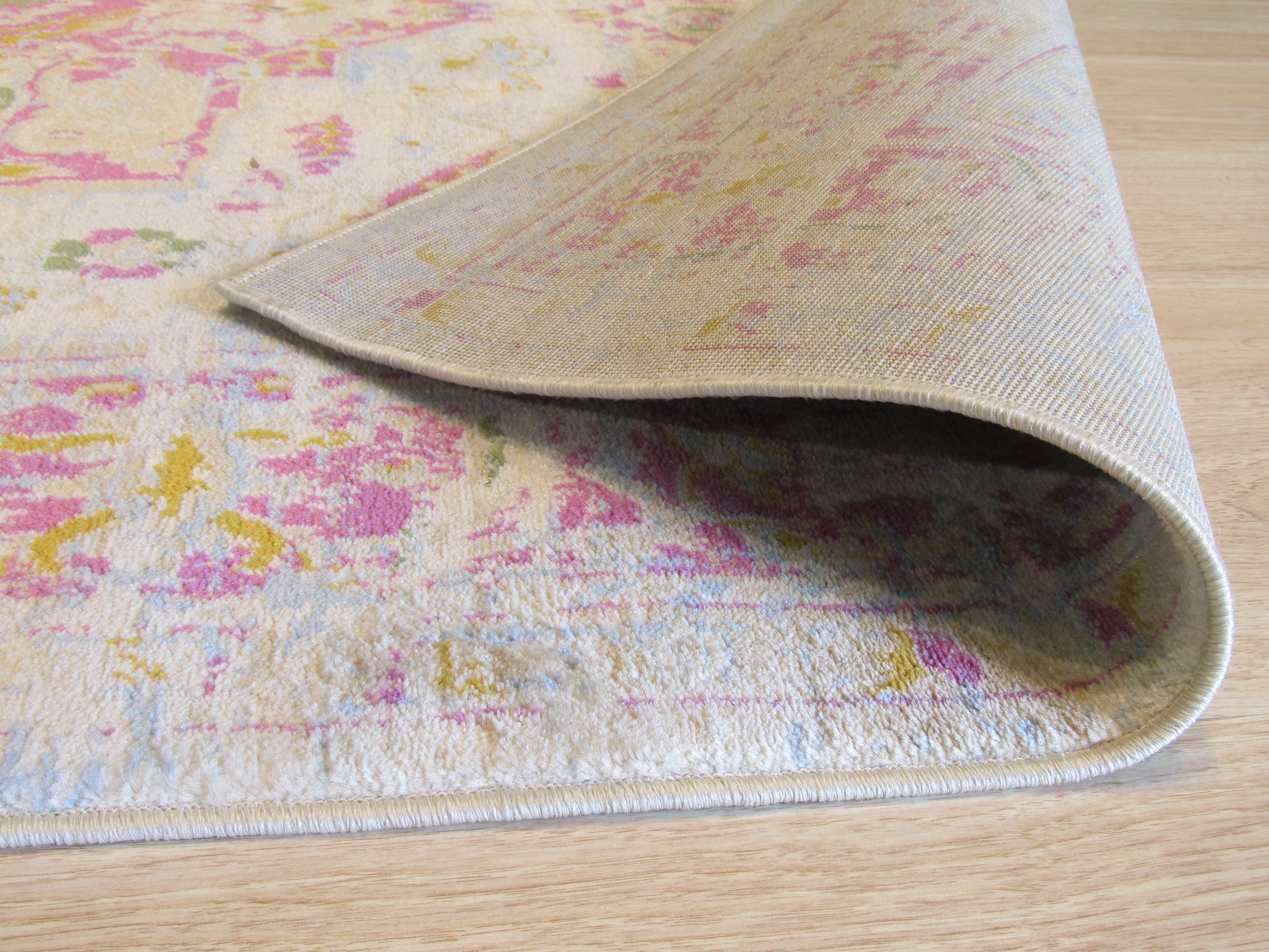 The foundational palette centers on a rich, nuanced ivory color rugs field, providing a serene canvas for the vibrant overdyed accents. Hues of magenta, pale cerulean, and soft gold are strategically integrated, creating a dynamic visual tension that prevents the overall design from feeling overly formal.