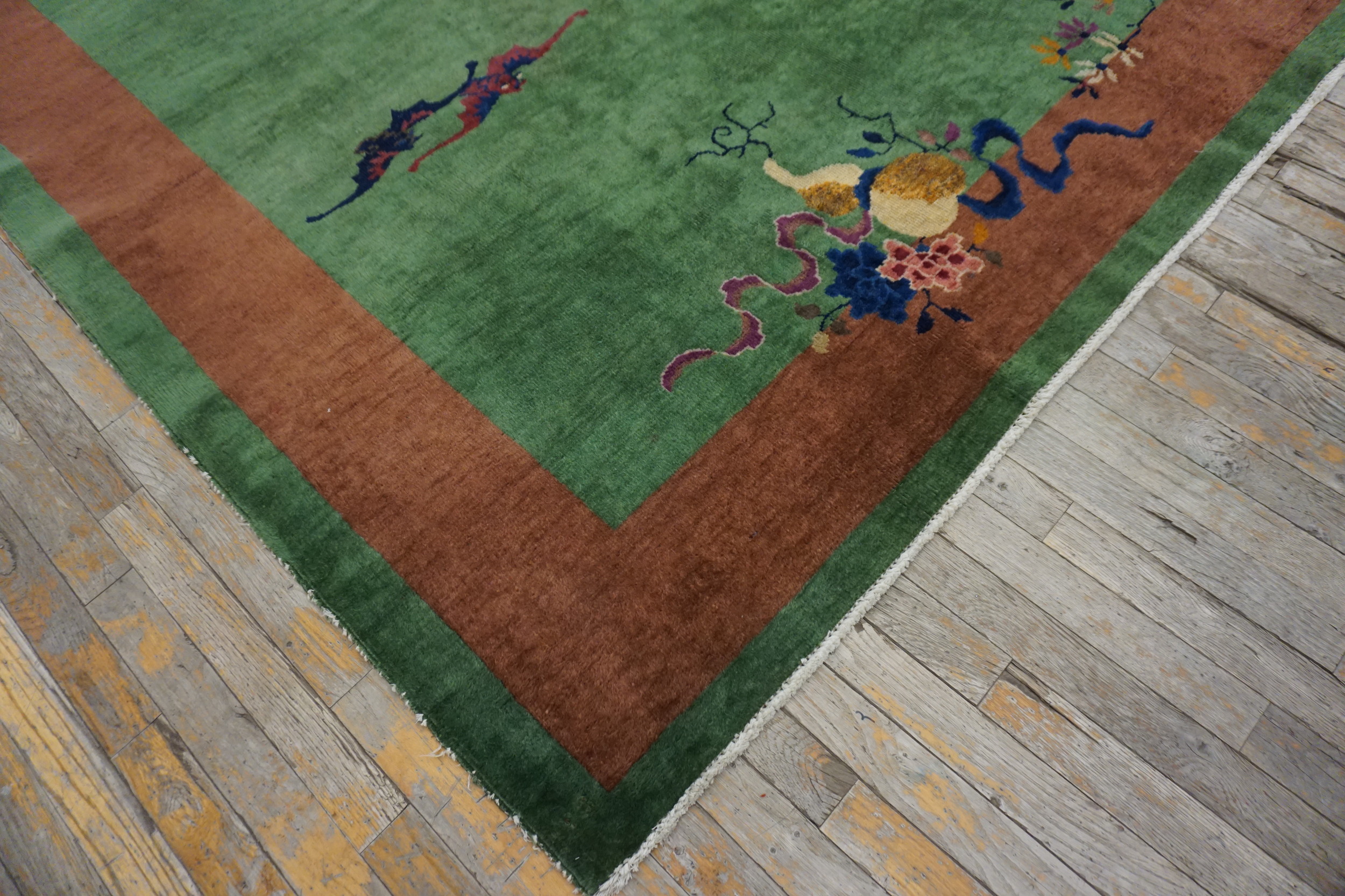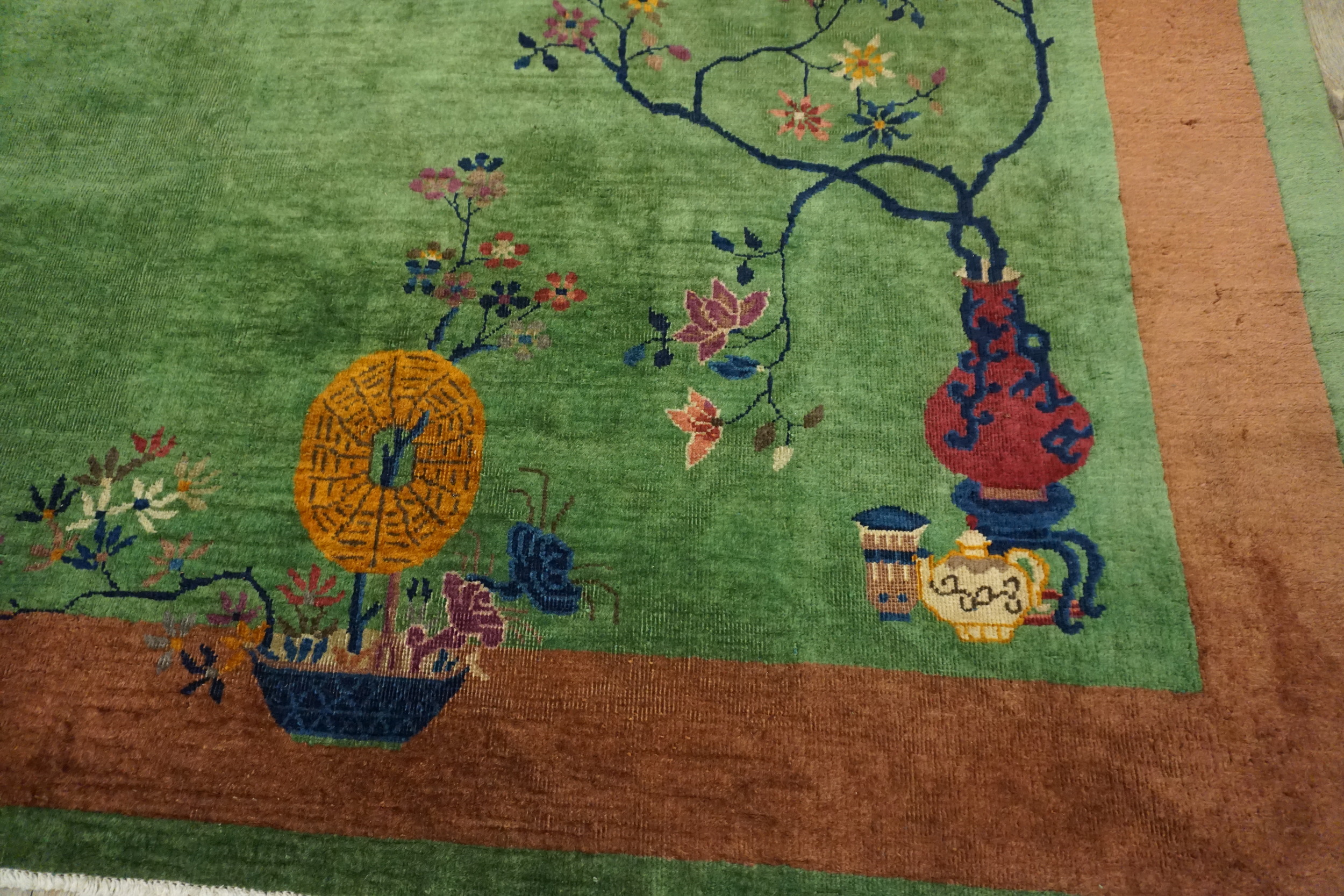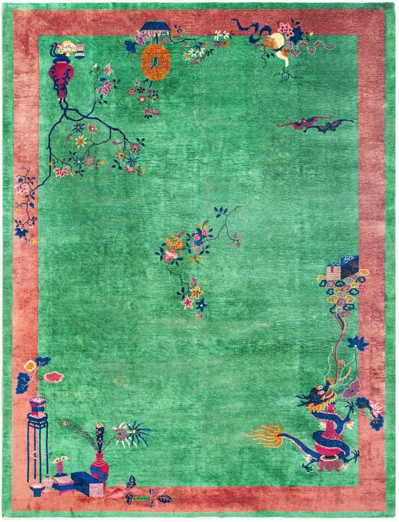 Wool Green 1920s Antique Rectangle Floral Hand Knotted Pile Rug, Circa Date: 1920s. This exceptional piece captures the essence of early 20th-century design, blending traditional Chinese symbolism with the modern aesthetic of the Art Deco movement. As one of our finest antique rugs, its provenance and condition are superb, representing a pinnacle of period textile artistry.
