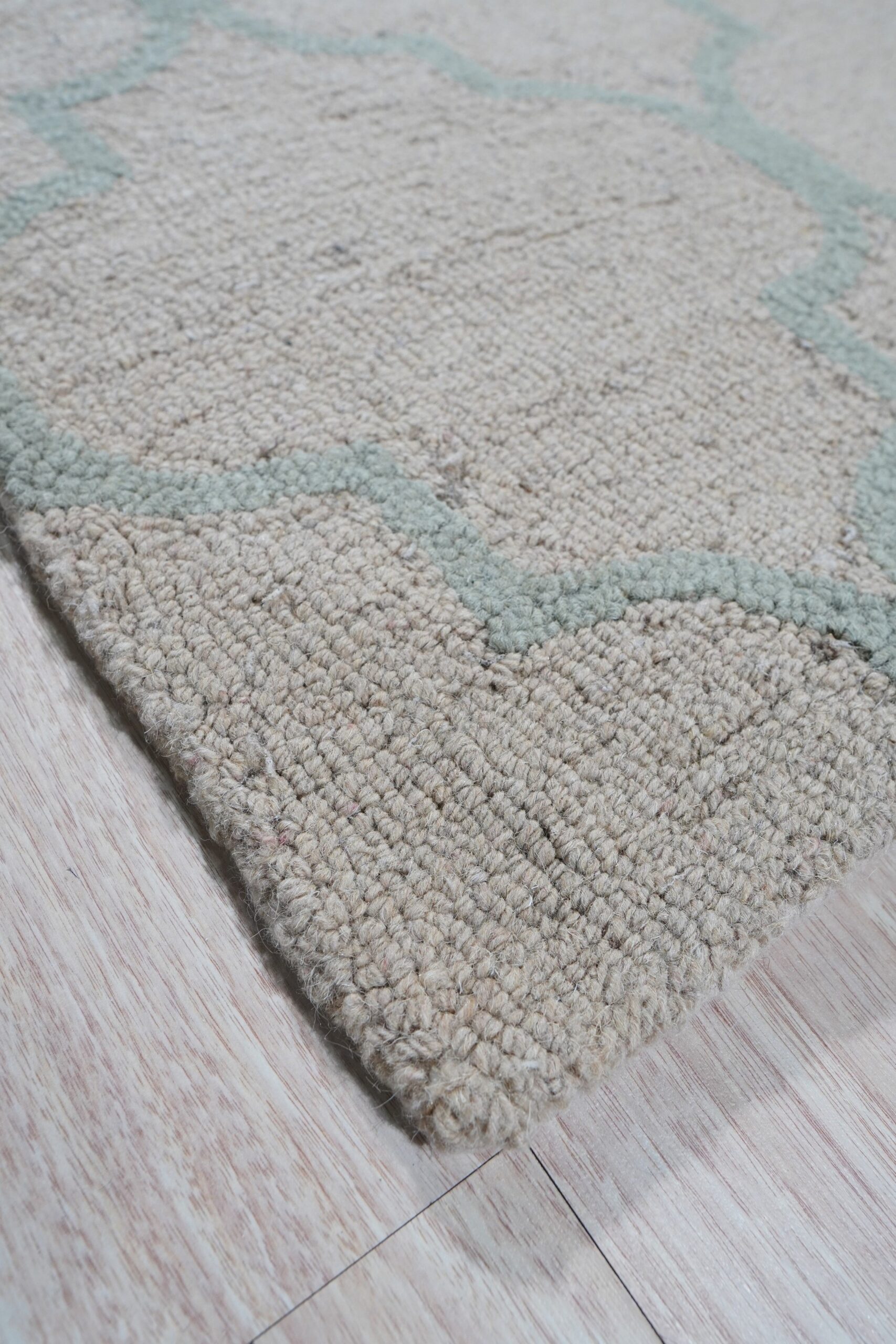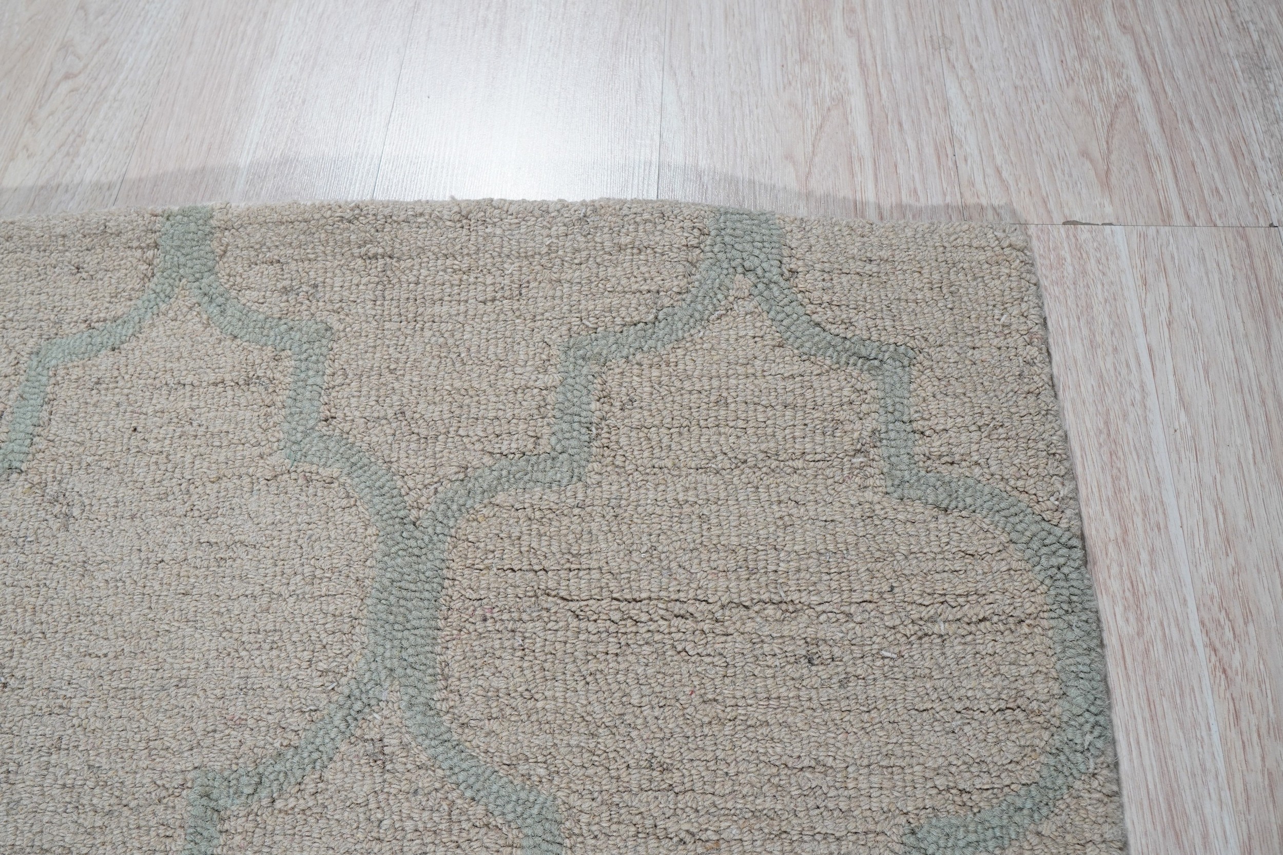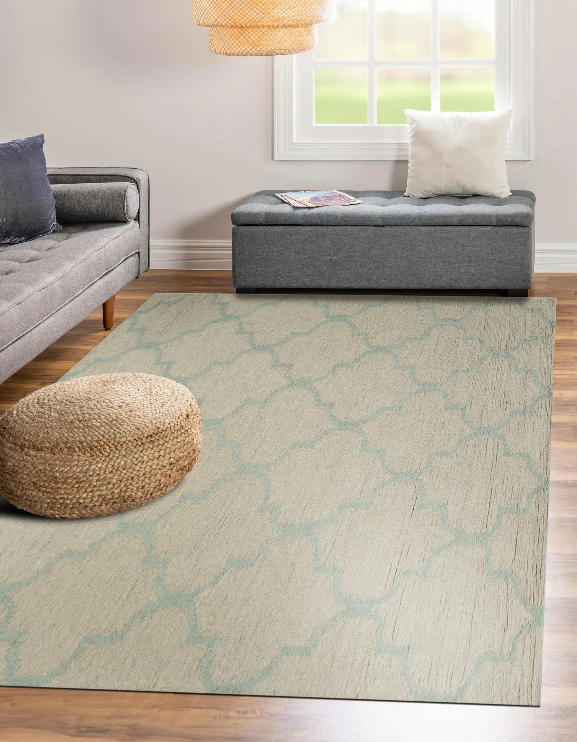 The design features a delicate, repeating quatrefoil trellis, rendered in a soft aqua against a neutral, light gold ground. This classic geometric motif offers subtle visual movement without overwhelming the space. It represents a superb addition to our collection of new area rugs designed for the discerning modern interior seeking transitional elegance.